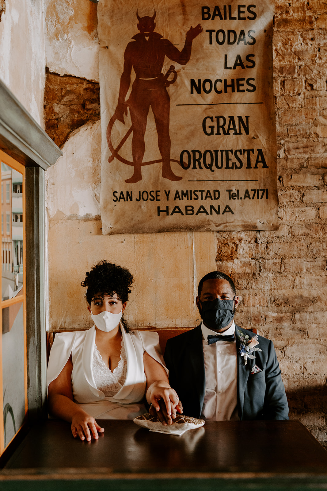 Photography: Mackenzie Scurlock | Bride’s suit: Theory | Bouquet & Boutonniere: Vogue Flowers | Engagement ring: Blue Nile and wedding band: Feroks Fine Jewelery | Groom’s ring: Rings by Pristine | Bride’s mask: Ciaomila | Groom’s mask: Reap What You Sew Crafts | Elopement sign: Home Sweet Farmhouse NC | Cake: Three Sweets to the Wind