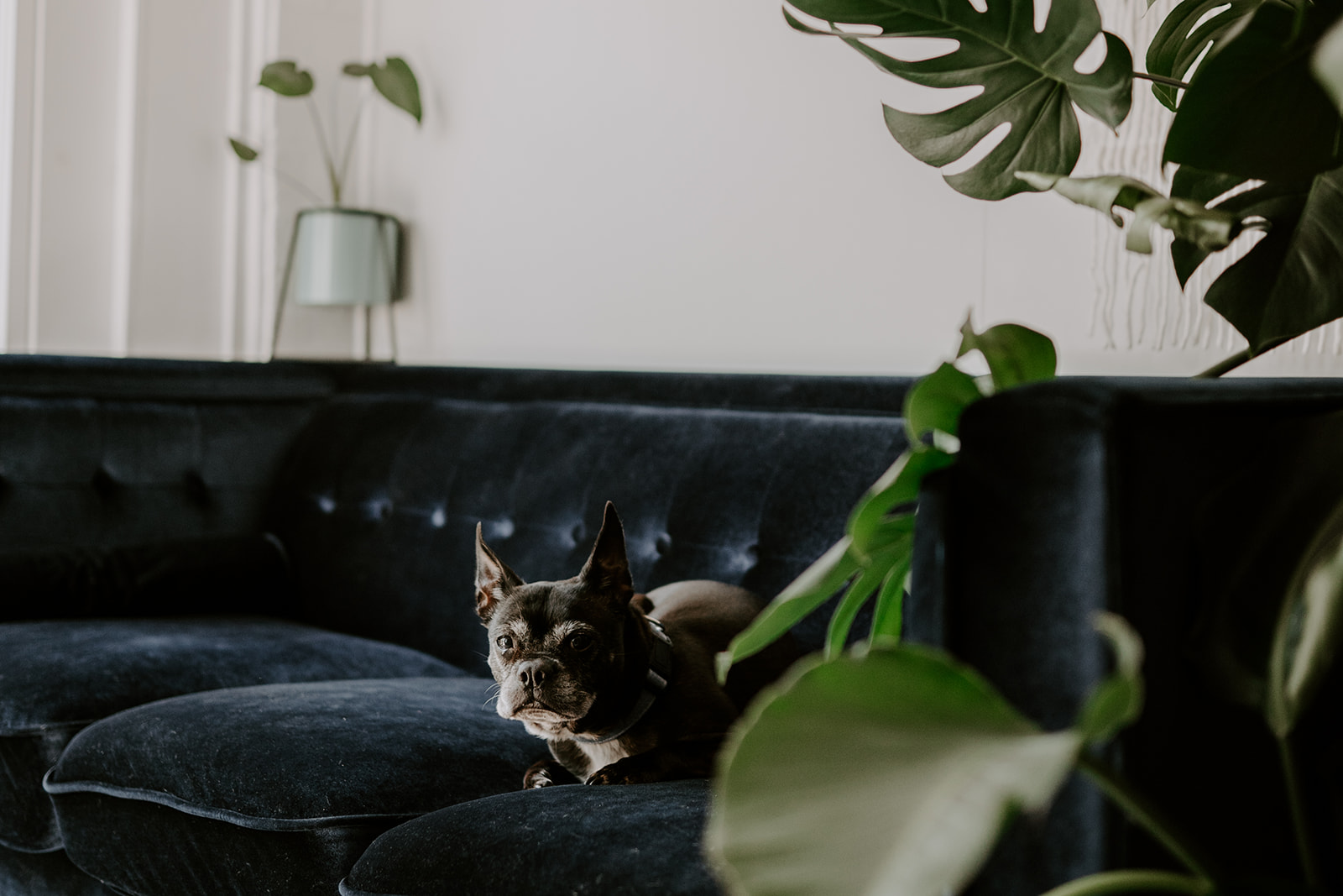 “Our engagement was simple and sweet. We were home, lounging on the couch one evening and he began getting awkward and fidgety. We’d talked marriage previously, so we both knew it was the obvious next step for us. Then he started with mushy talk and before I knew it, he nervously got on one knee and popped the question. It was low-key, sweet, and from the heart. Roman was very excited to lock down his dog-dad.”