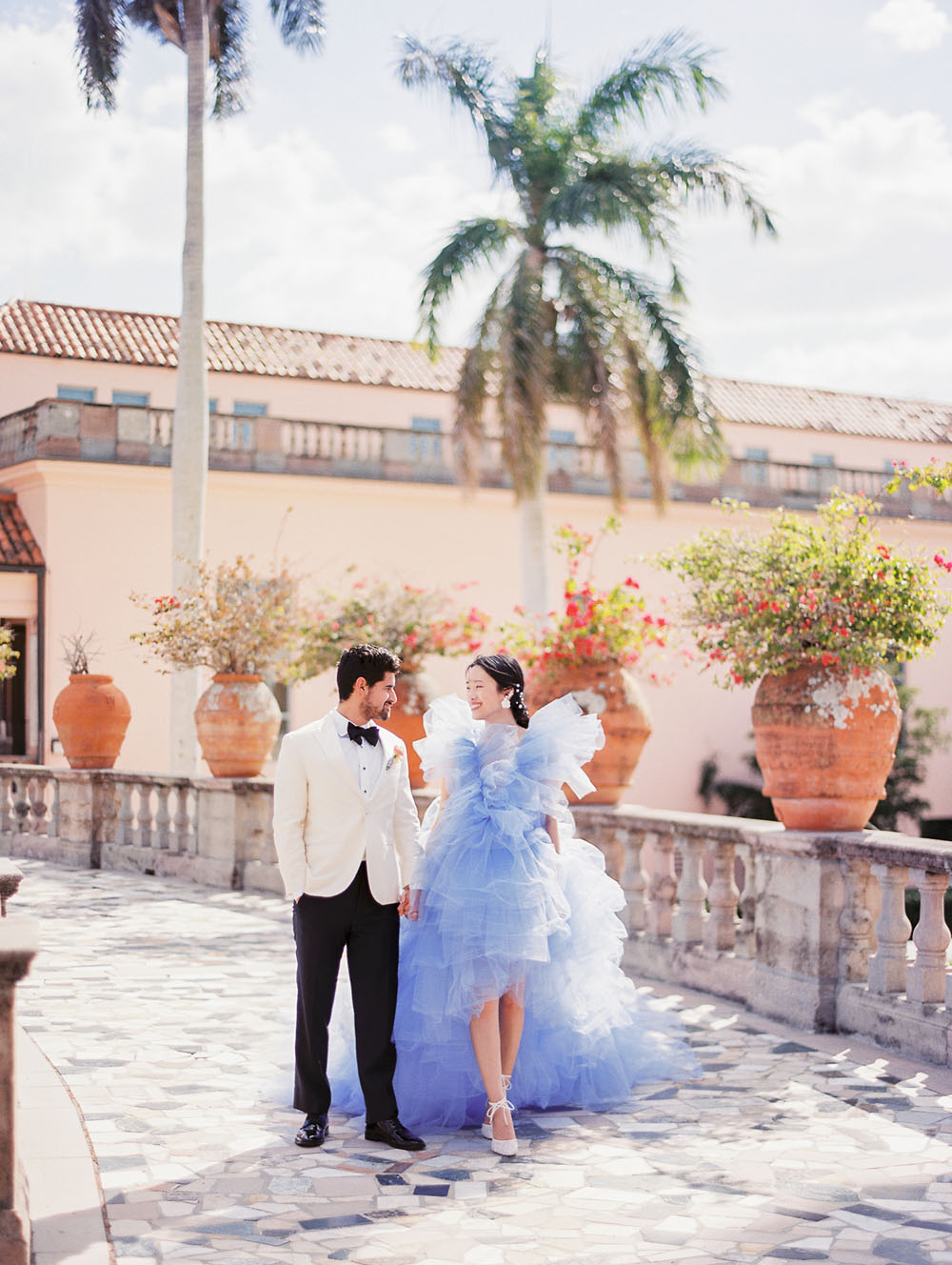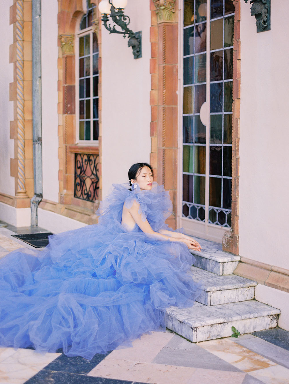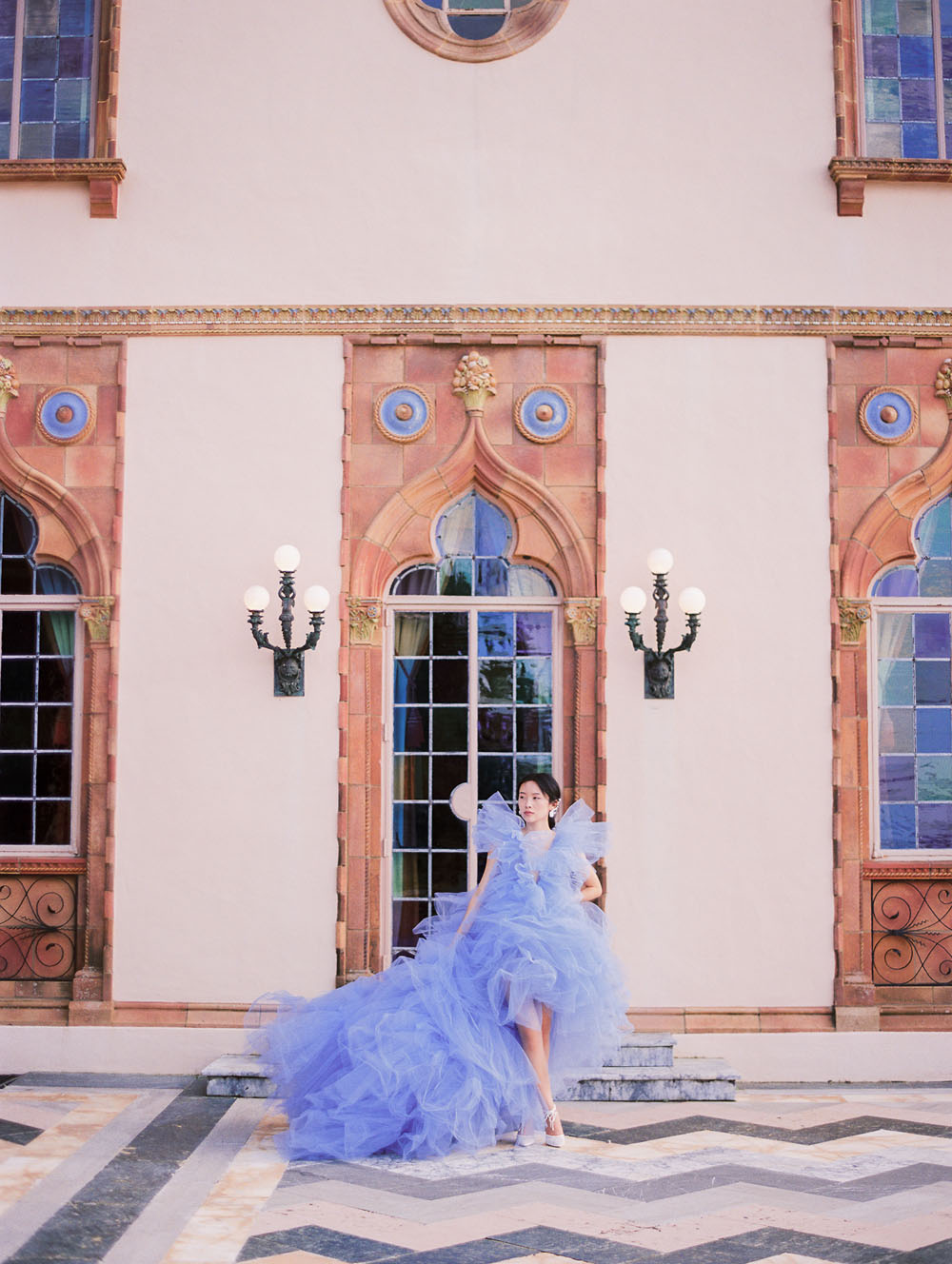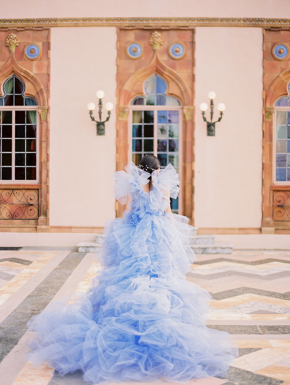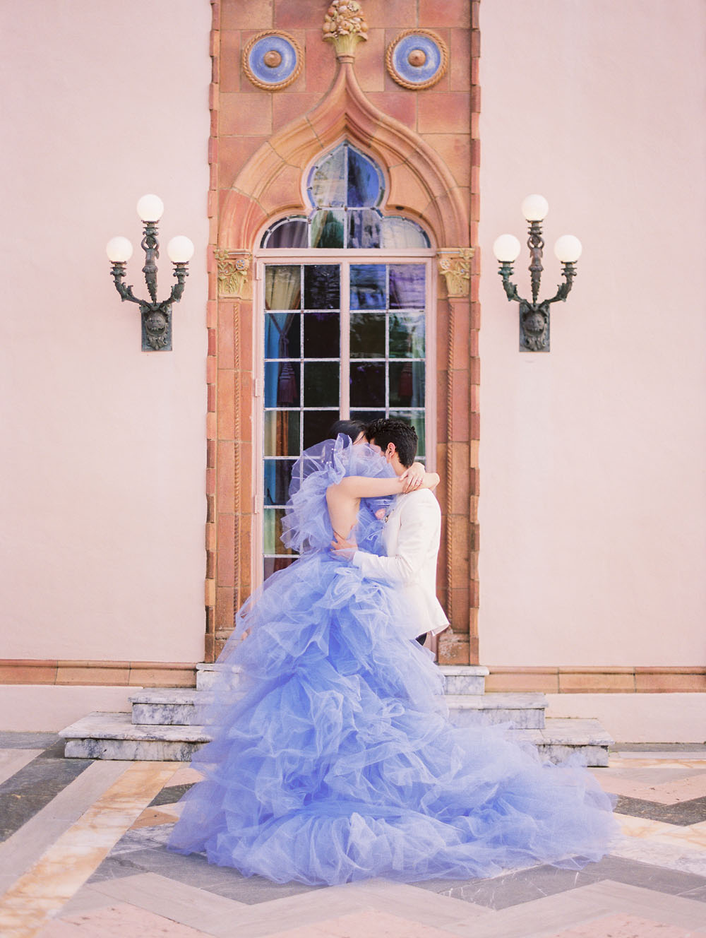 With the quietness a private elopement holds, it was still important for Jamie & Dennis to incorporate their own sense of style and flair. Pulling inspiration from the great tiled windows with exquisite color joined together like a mosaic, they used personal touches and wove details together finding a perfect balance of intimacy and drama. The pearls adorning Jamie’s windswept updo paired with the drama of the custom ruffled periwinkle gown, mimicking the subtle Venice canal waves found in the Sarasota Bay they overlook, created the perfect ensemble to make any bride with or without Covid regulations an absolute showstopper.