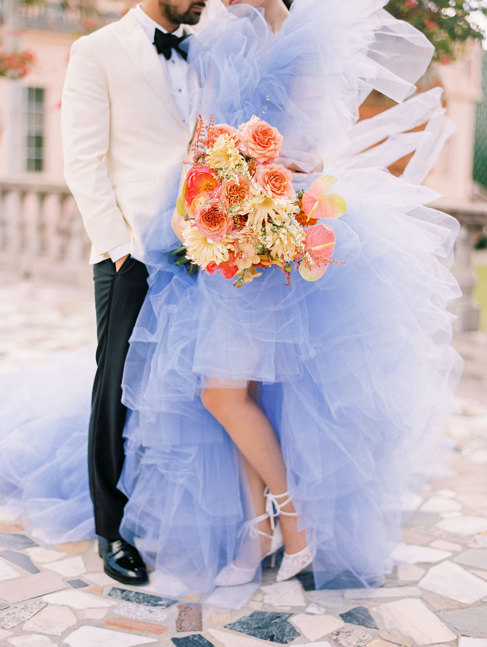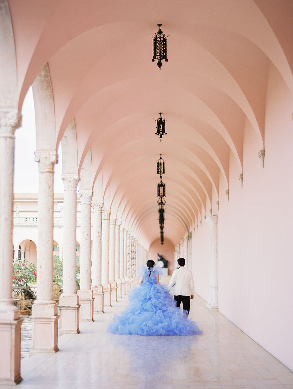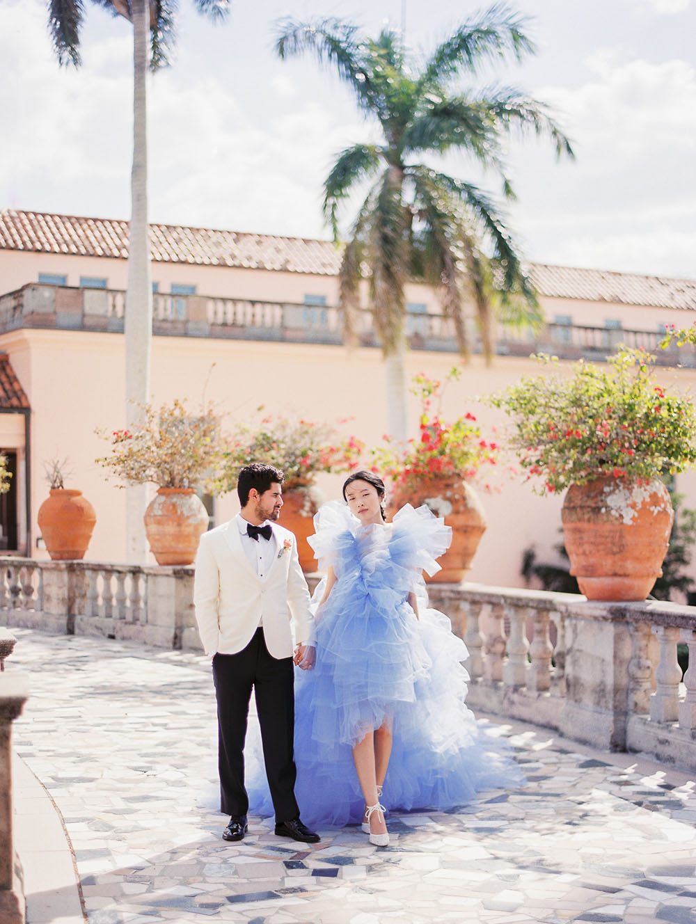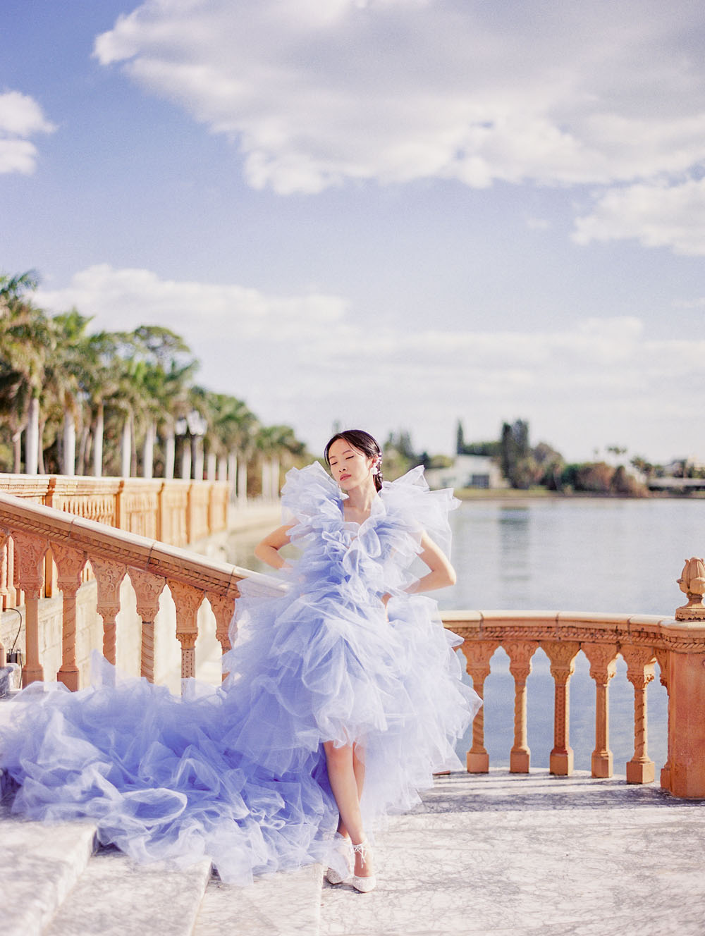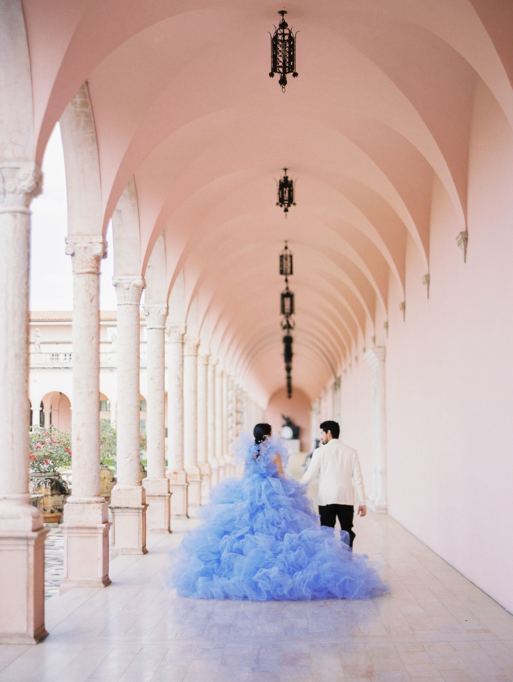 With the quietness a private elopement holds, it was still important for Jamie & Dennis to incorporate their own sense of style and flair. Pulling inspiration from the great tiled windows with exquisite color joined together like a mosaic, they used personal touches and wove details together finding a perfect balance of intimacy and drama. The pearls adorning Jamie’s windswept updo paired with the drama of the custom ruffled periwinkle gown, mimicking the subtle Venice canal waves found in the Sarasota Bay they overlook, created the perfect ensemble to make any bride with or without Covid regulations an absolute showstopper.