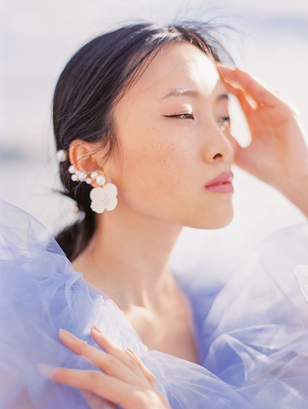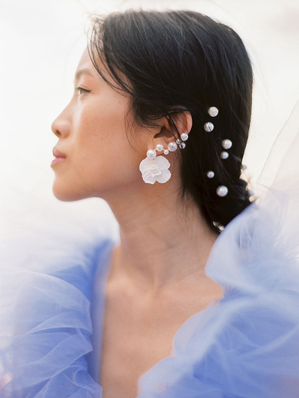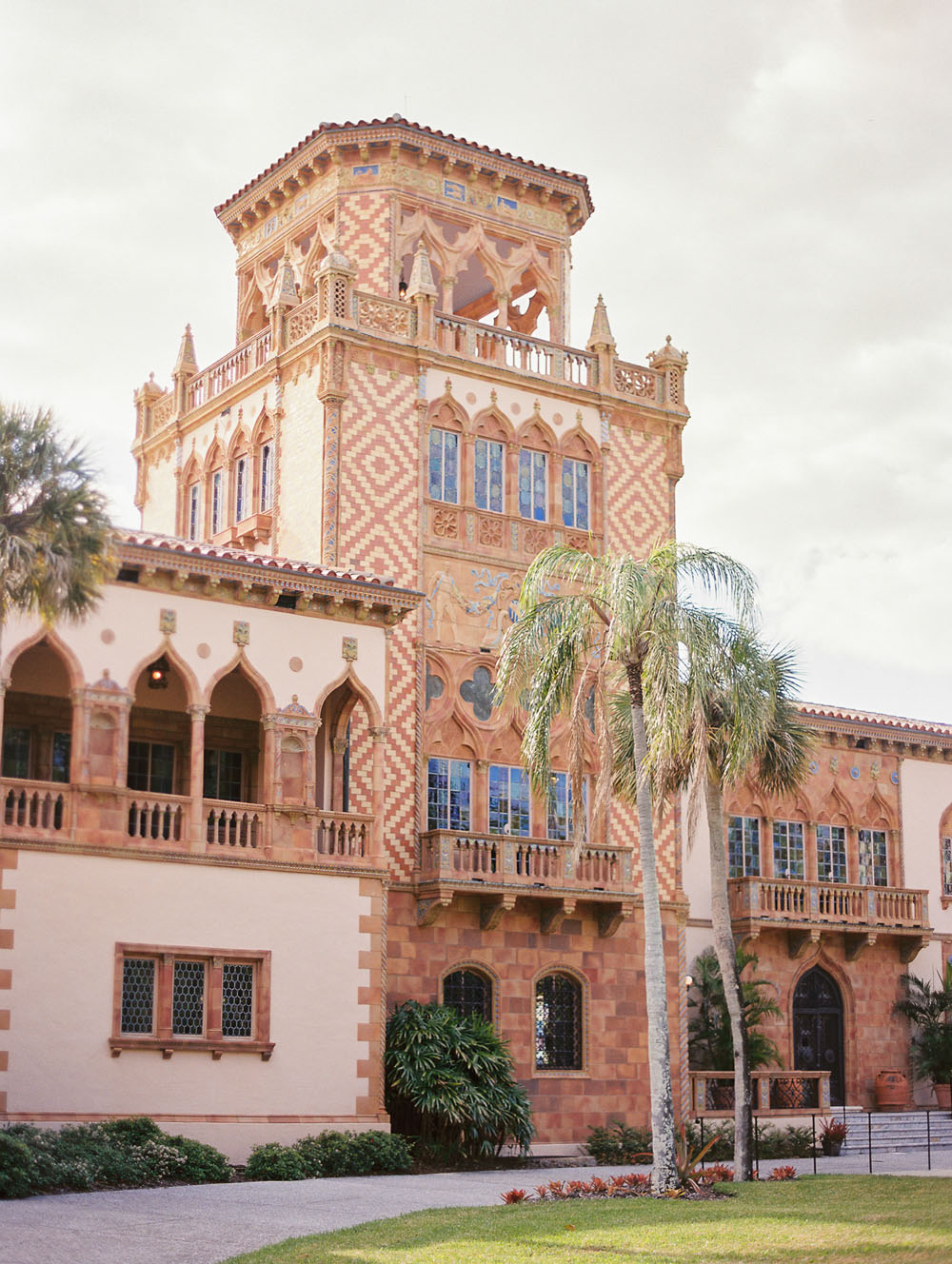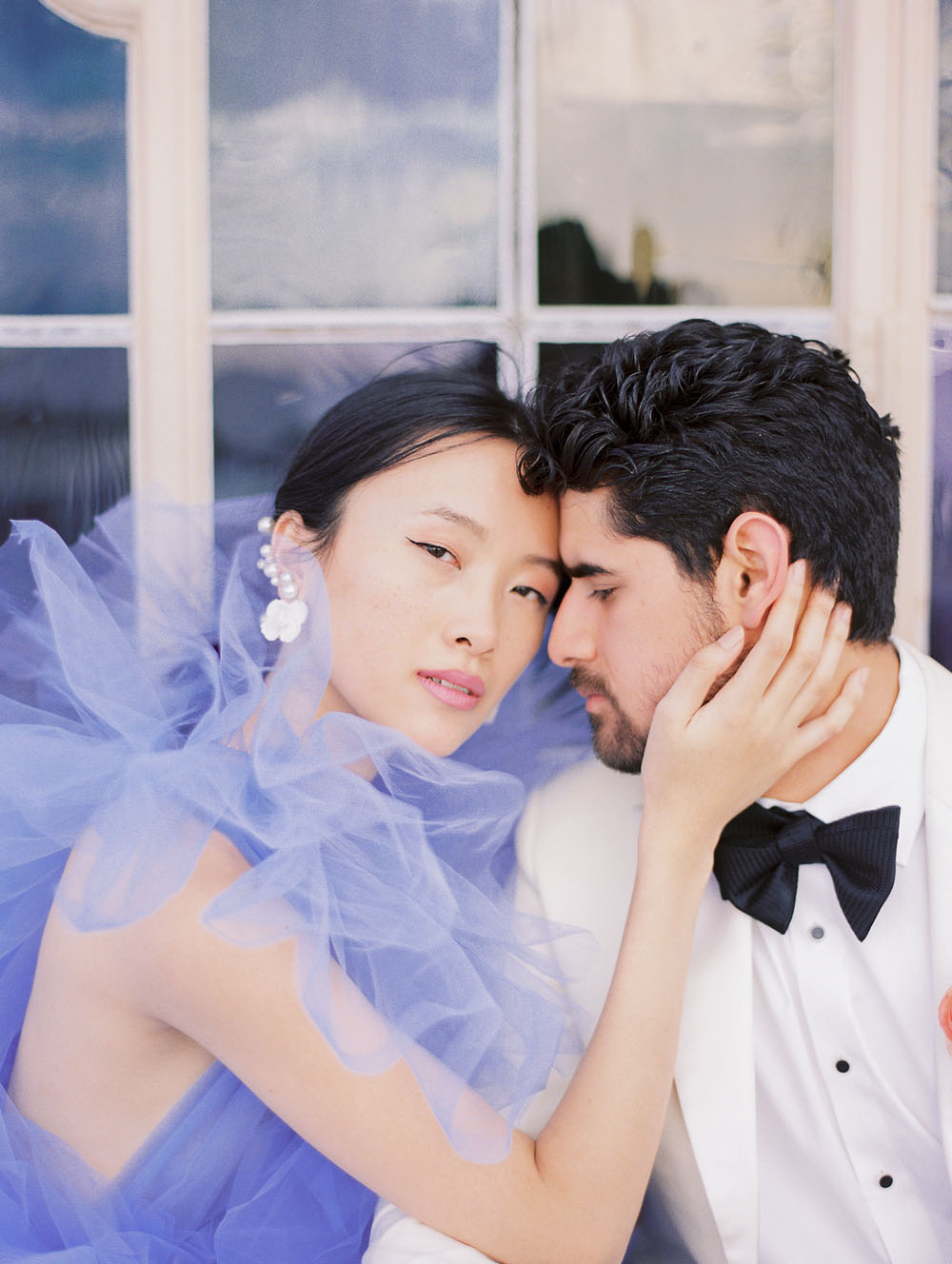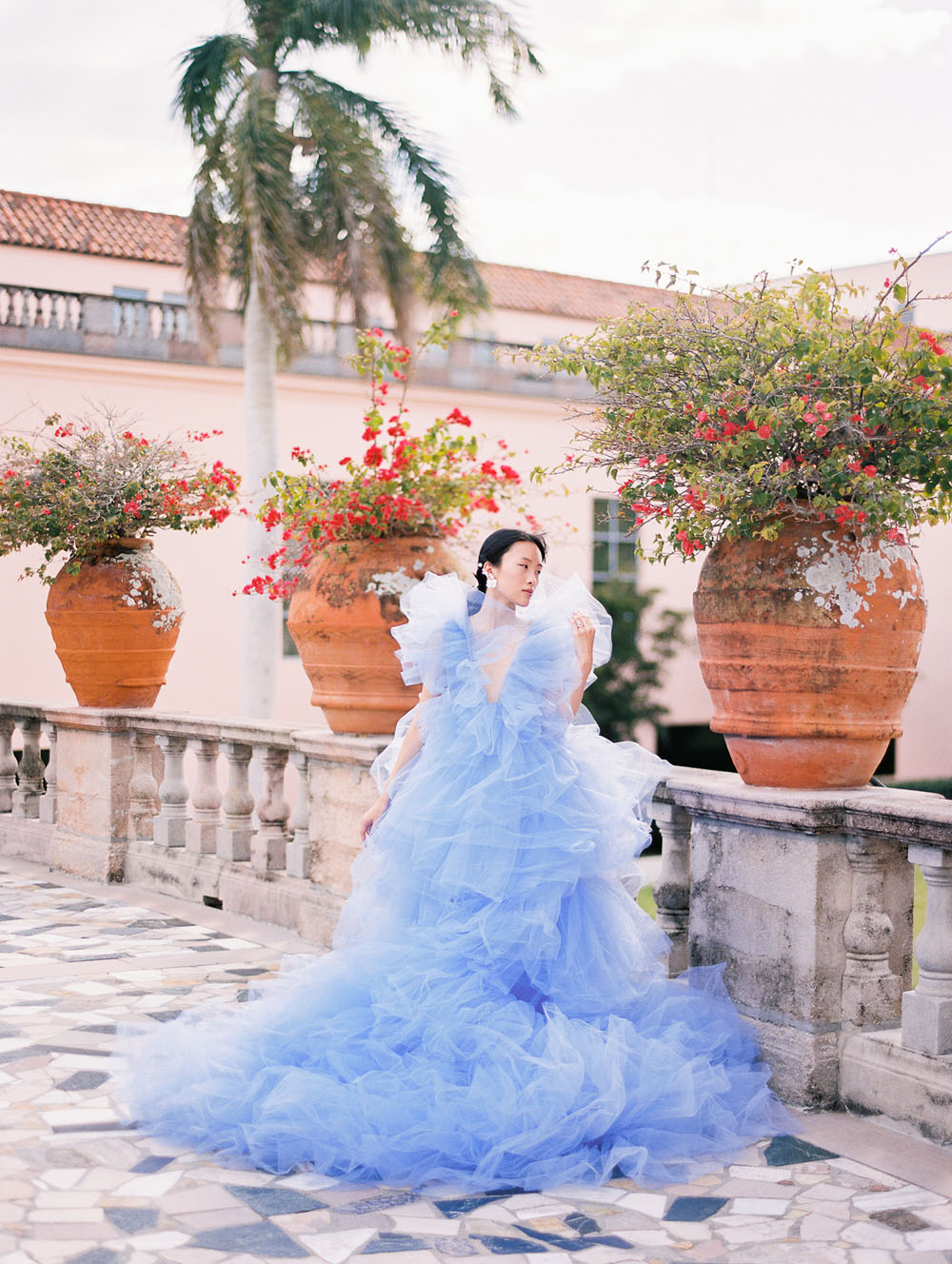 With the quietness a private elopement holds, it was still important for Jamie & Dennis to incorporate their own sense of style and flair. Pulling inspiration from the great tiled windows with exquisite color joined together like a mosaic, they used personal touches and wove details together finding a perfect balance of intimacy and drama. The pearls adorning Jamie’s windswept updo paired with the drama of the custom ruffled periwinkle gown, mimicking the subtle Venice canal waves found in the Sarasota Bay they overlook, created the perfect ensemble to make any bride with or without Covid regulations an absolute showstopper.