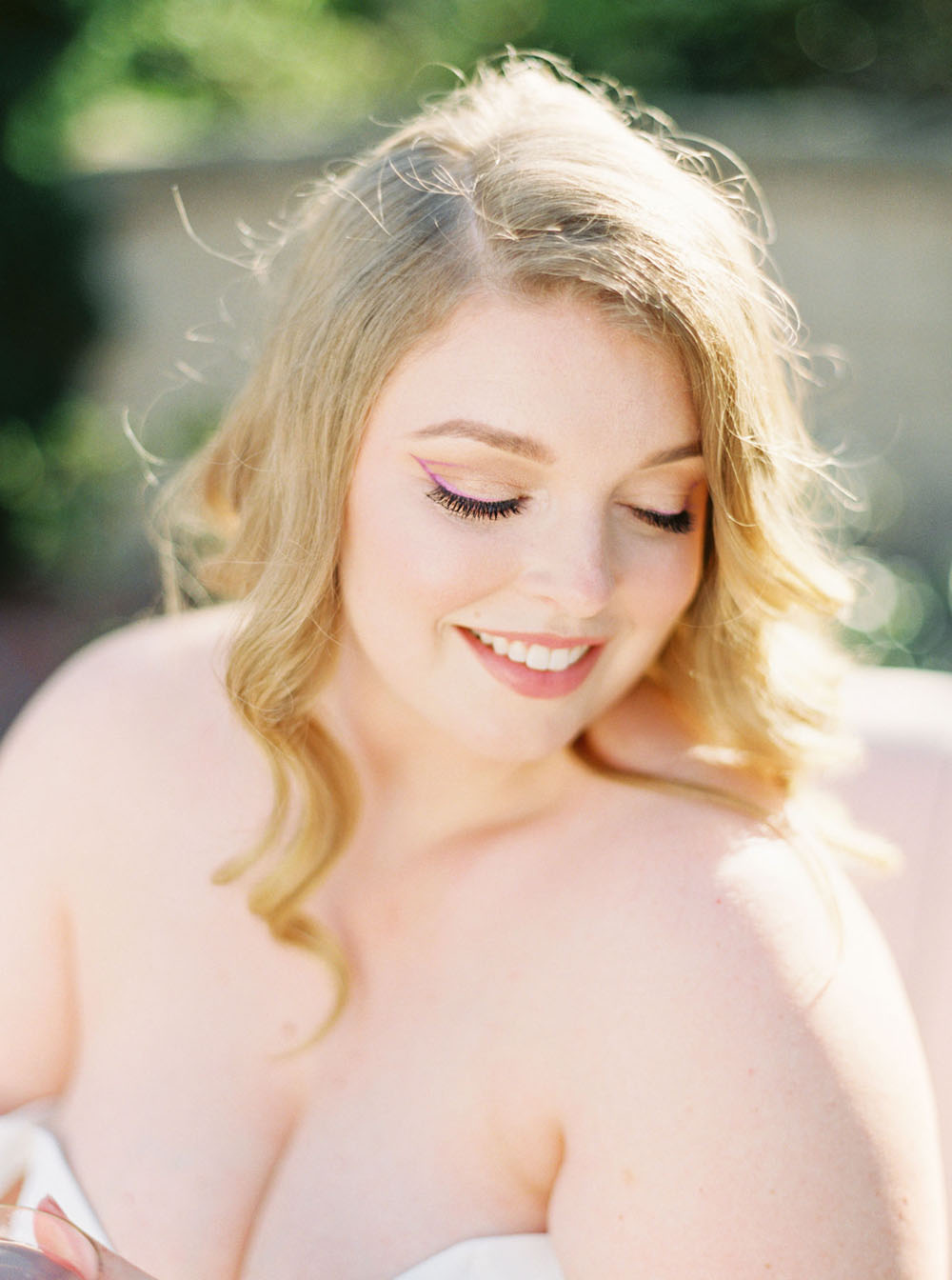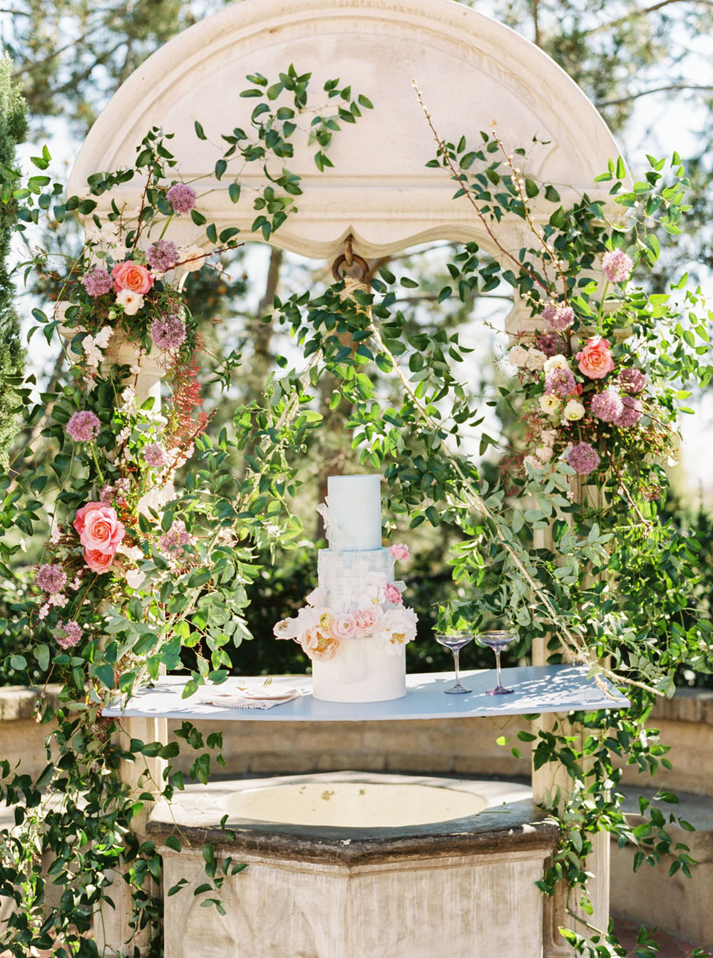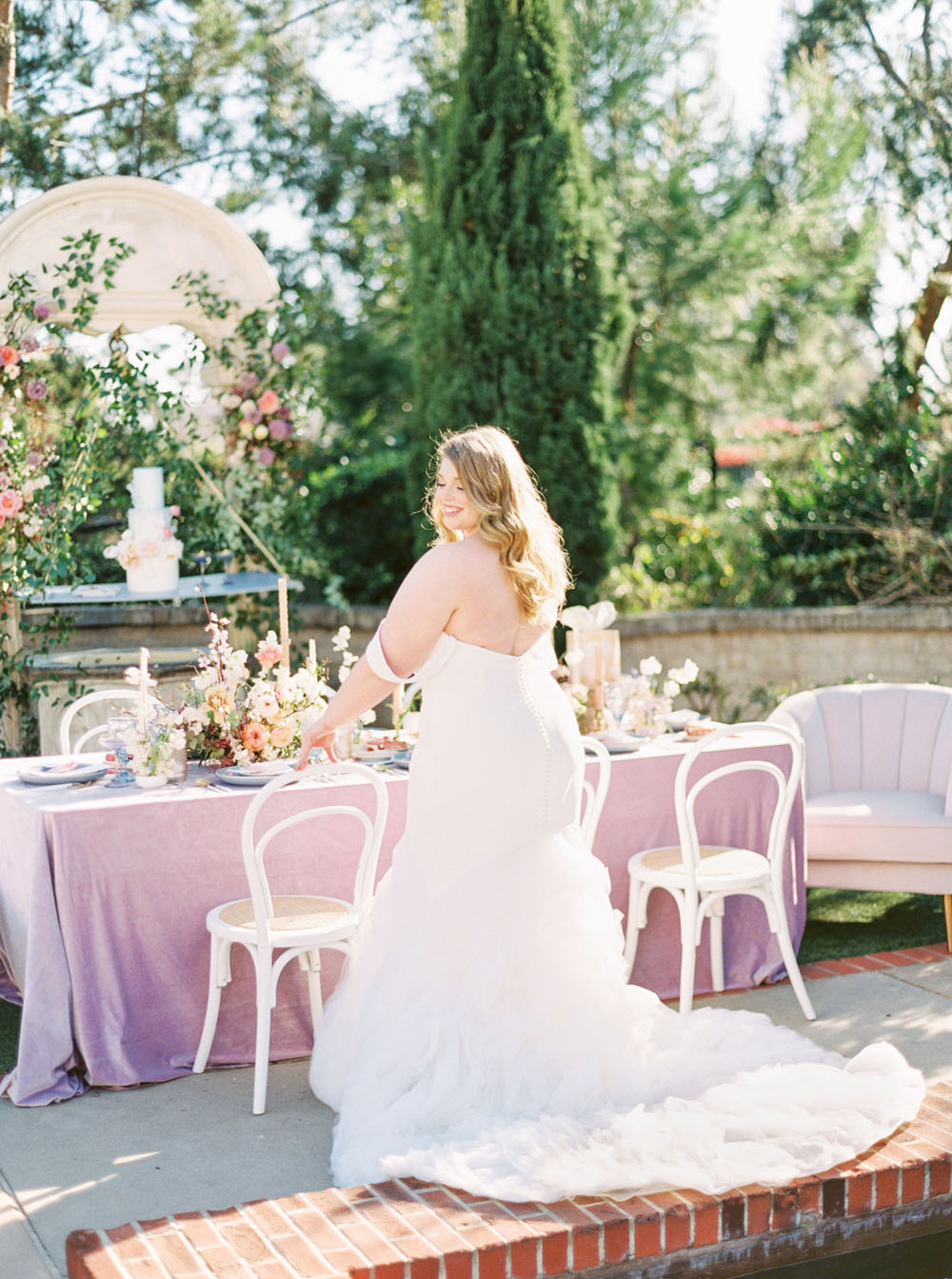 From the team: For our bride, we pulled two gorgeous gowns from photographer Cavin Elizabeth’s San Diego bridal boutique The White Flower (yes, she has two wedding businesses!). Cavin selected one crepe and tulle off shoulder dress from Kelly Faetanini for a modern, romantic look. She arranged for our bride to wear her hair in glamorous waves and to sport a mod purple eyeliner to match our color palette. For the second look, Cavin pulled another gown from The White Flower by designer Martina Liana featuring a cap sleeve illusion neckline and a fitted silhouette. The gown’s look was complemented with an overskirt that had an exquisite train. Its intricate floral lace paired beautifully with the nature surrounding the wishing well.