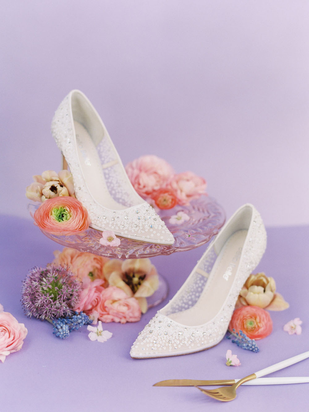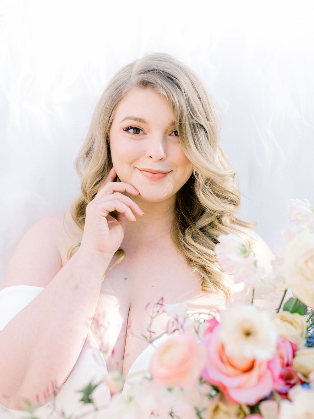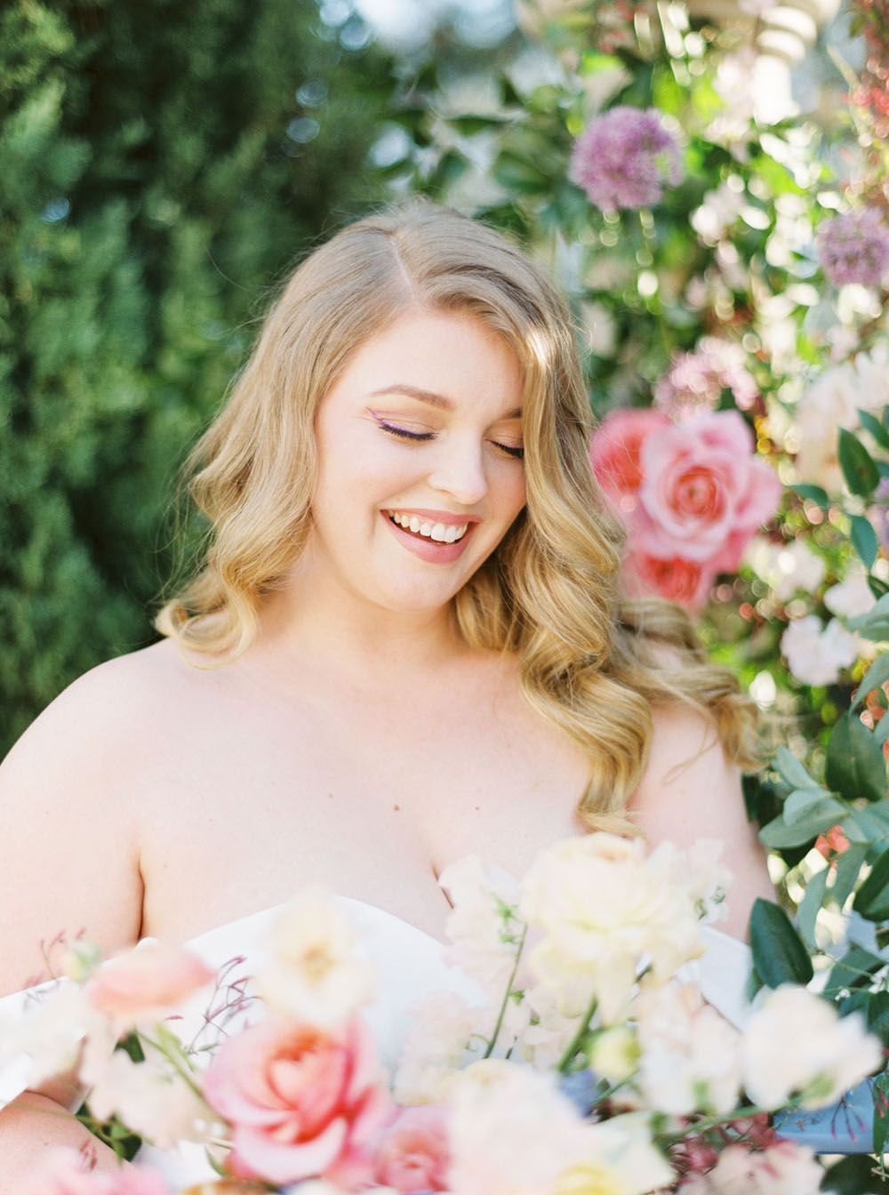 From the team: For our bride, we pulled two gorgeous gowns from photographer Cavin Elizabeth’s San Diego bridal boutique The White Flower (yes, she has two wedding businesses!). Cavin selected one crepe and tulle off shoulder dress from Kelly Faetanini for a modern, romantic look. She arranged for our bride to wear her hair in glamorous waves and to sport a mod purple eyeliner to match our color palette. For the second look, Cavin pulled another gown from The White Flower by designer Martina Liana featuring a cap sleeve illusion neckline and a fitted silhouette. The gown’s look was complemented with an overskirt that had an exquisite train. Its intricate floral lace paired beautifully with the nature surrounding the wishing well.