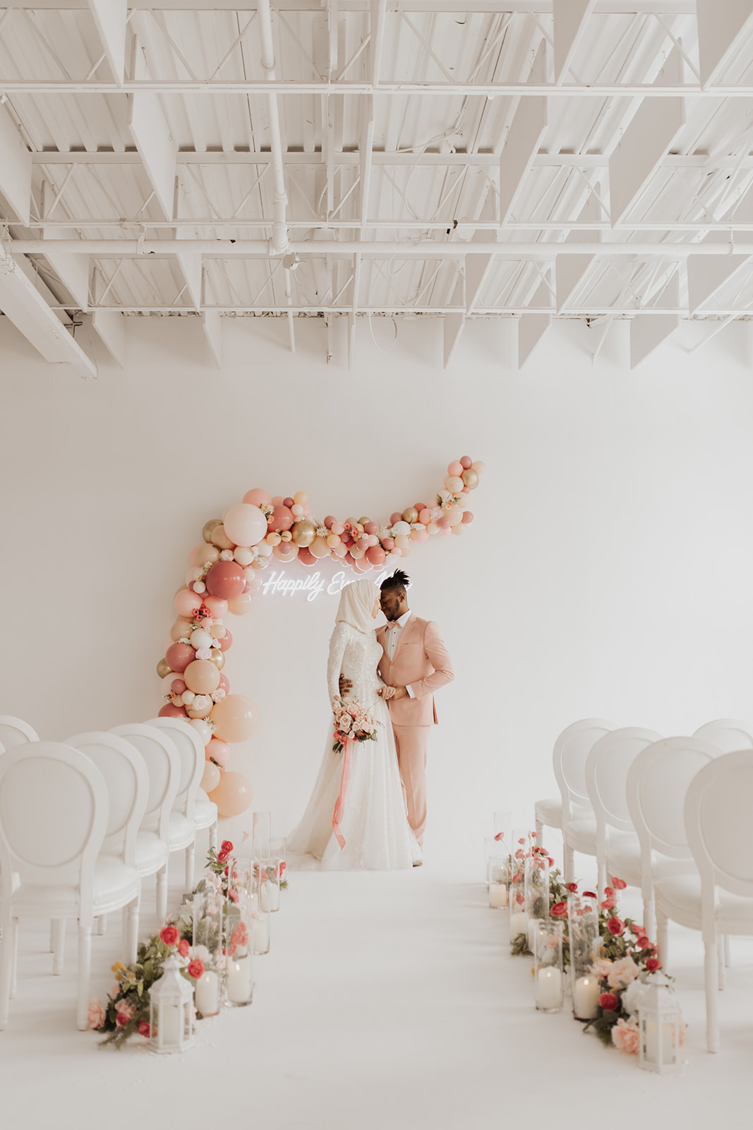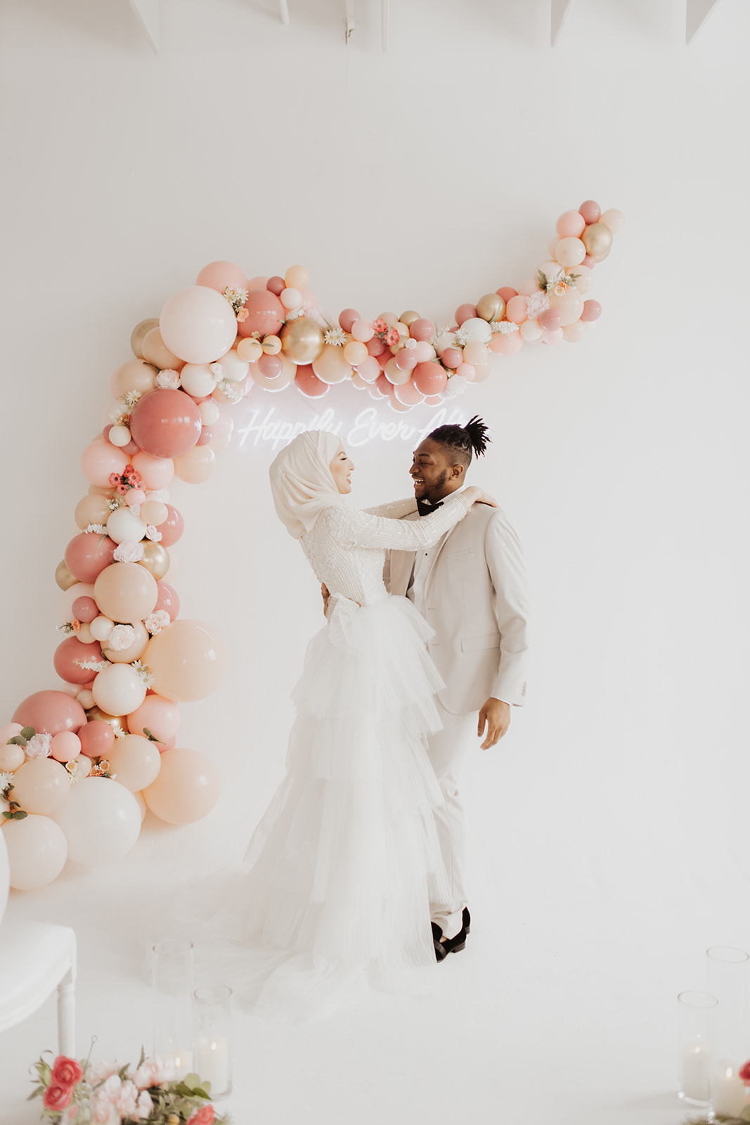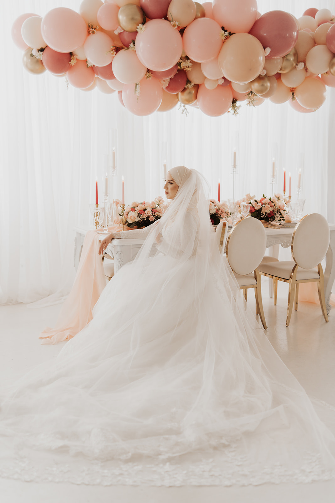 Planning and Design: Château Nadia | Photography: Kerstin Hahn Photography | Wedding Dress & Hair Accessories: Château Nadia | Assistant Photographer: Isabella Kara Photo | Flowers: Aura Design | Stationery: Pixel Couture | Venue: L’Éloi | Videography: TheNewAura Productions | Makeup Artist: Blushed by Nour | Decor Rentals: Casa D’Eramo | Balloons: Ballons Luxe | Groom’s Fashion: Senso Uomo | Hijab: Veiled Collection
