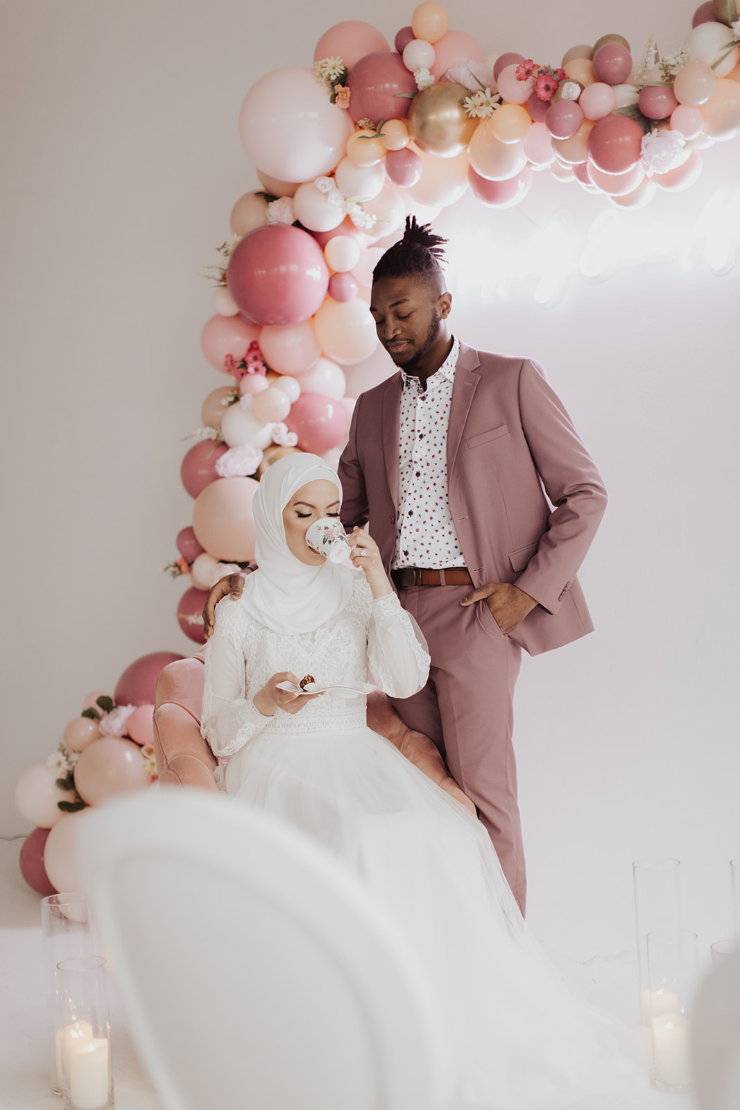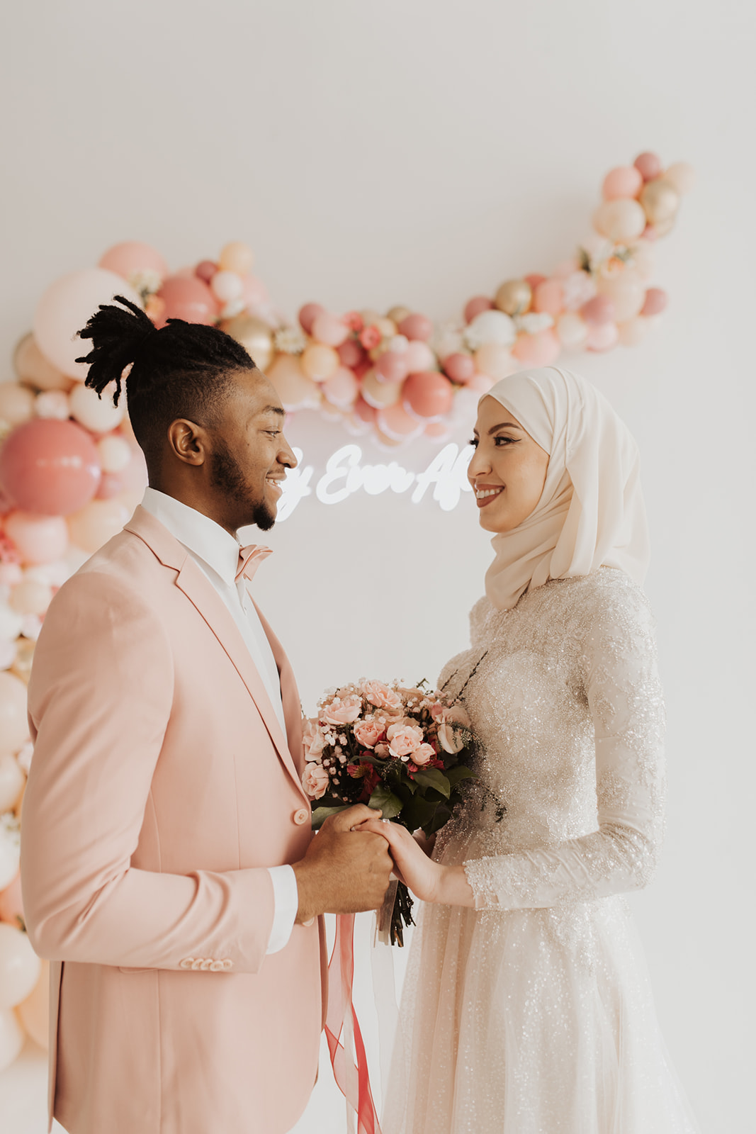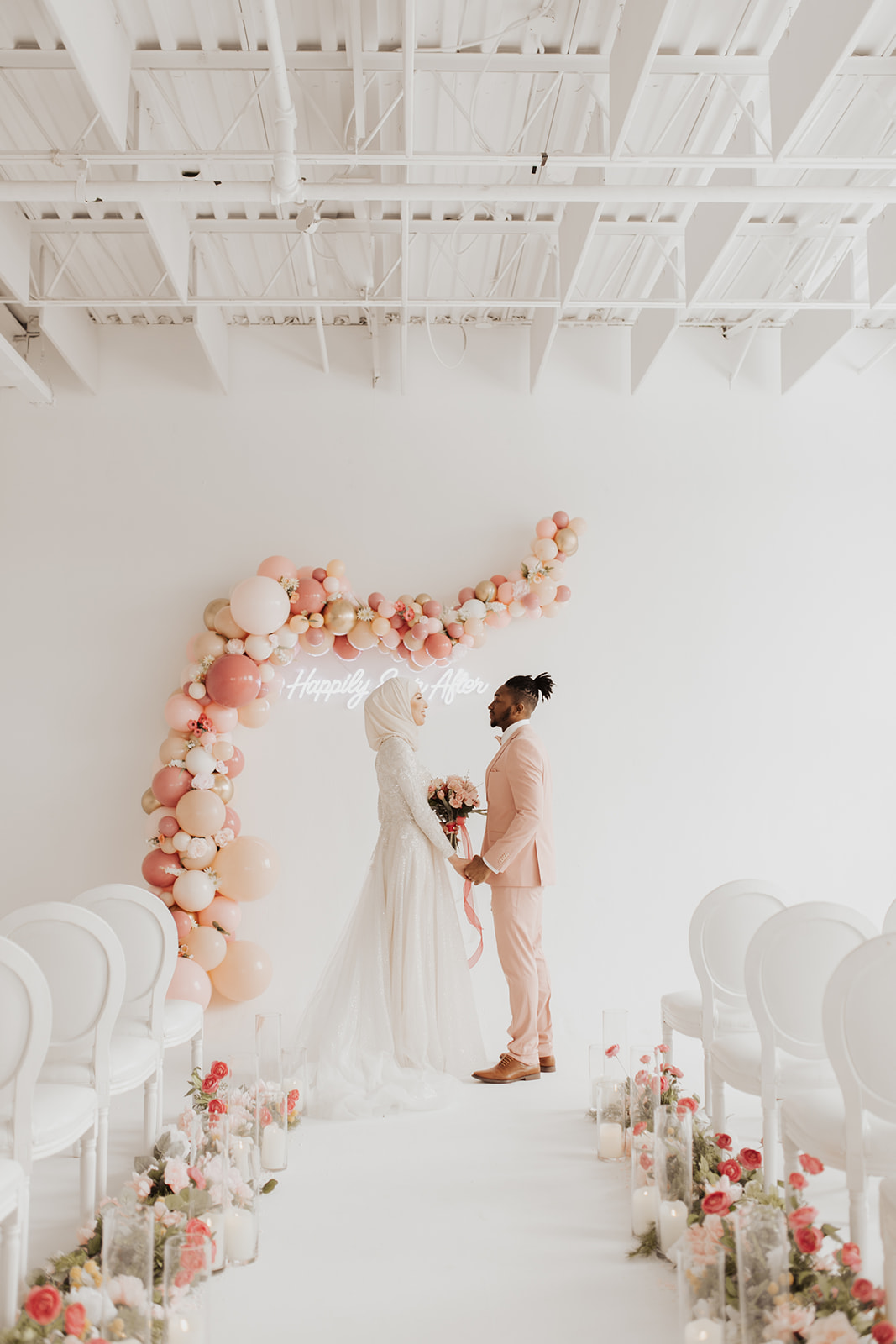 Planning and Design: Château Nadia | Photography: Kerstin Hahn Photography | Wedding Dress & Hair Accessories: Château Nadia | Assistant Photographer: Isabella Kara Photo | Flowers: Aura Design | Stationery: Pixel Couture | Venue: L’Éloi | Videography: TheNewAura Productions | Makeup Artist: Blushed by Nour | Decor Rentals: Casa D’Eramo | Balloons: Ballons Luxe | Groom’s Fashion: Senso Uomo | Hijab: Veiled Collection