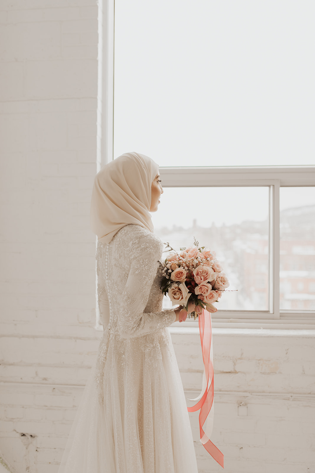 The makeup artist and hijab styling counselor Blushed by Nour wanted to bring back the simplicity and the delicacy of a soft hijab wrap to complement the romantic and extravagant wedding dresses. This choice of chiffon hijab is soft and lightweight fabric that can adapt to any wrapping and definitely a favorite staple for a romantic bridal look… Hijab is a symbol of modesty. Modesty can be shy and delicate, but it also can be bold and unapologetic.