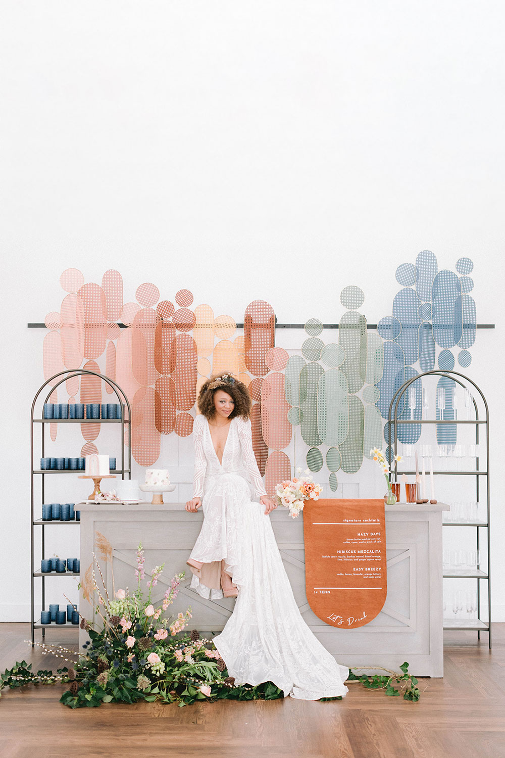 From the team at Kelsey Rae Designs: When we started putting our heads together on the design, we knew we wanted to bring in color but do so in a way that was modern and unique to what the south has been seeing! We brought a meandering field of flowers to life at the ceremony area, with tons of it being foraged on local land. The bar was spruced up with a giant install that brought in colorful elements with painted cane webbing… such fun texture! Our tablescape included paper goods and placemats in unique arched and fanned shapes and had a nod to the cane webbing in the bar install. The models rocked insanely gorgeous dresses from The Dress Theory and even had some unique florals incorporated in their hair.