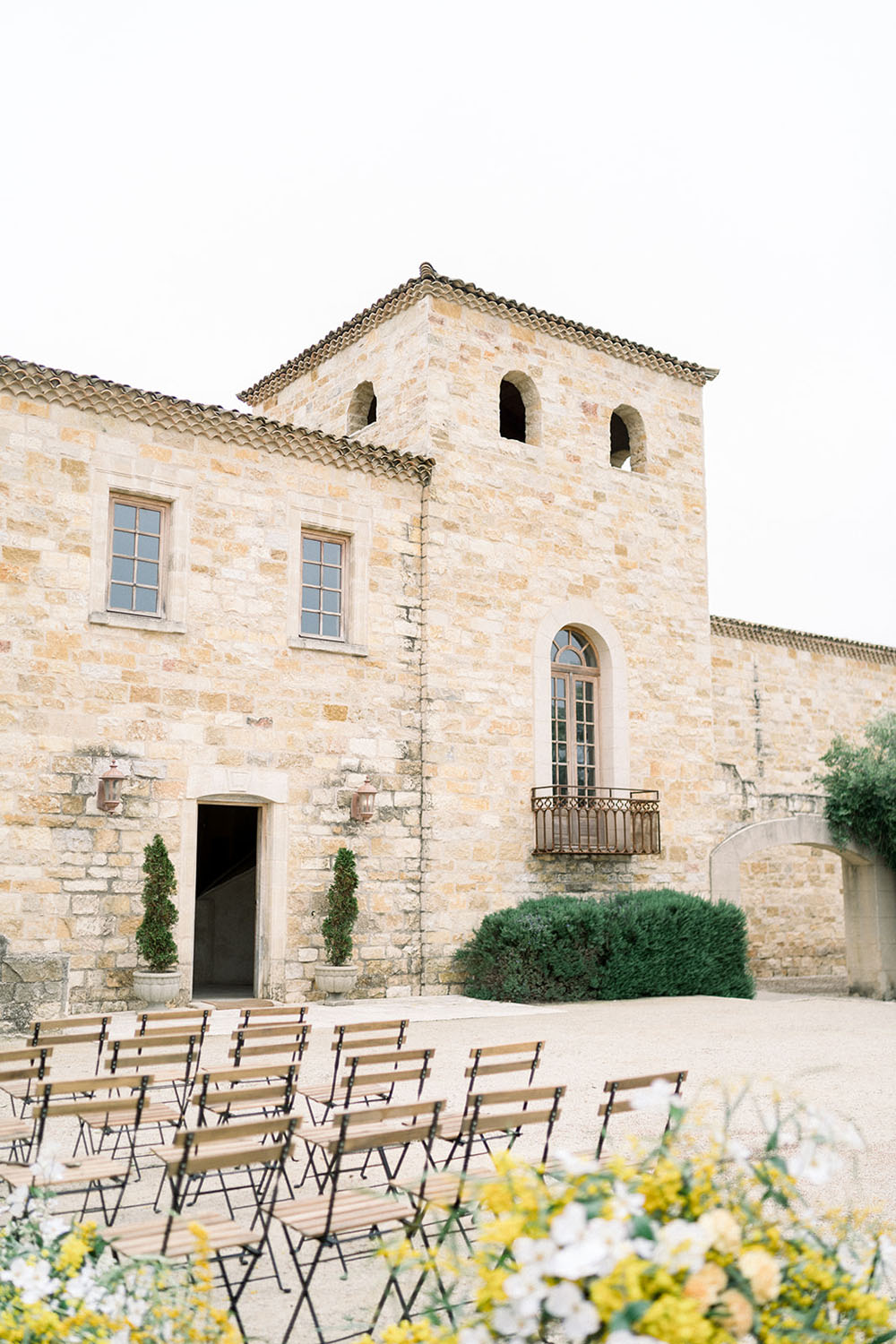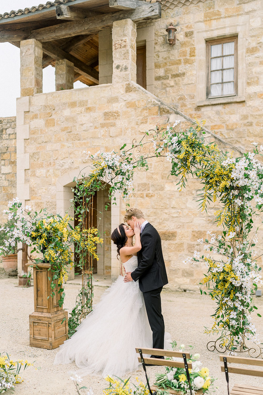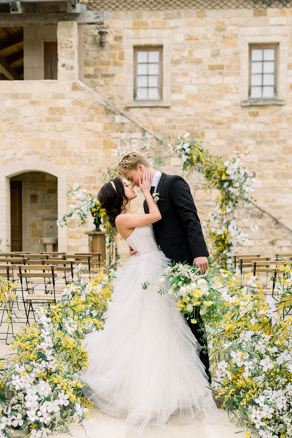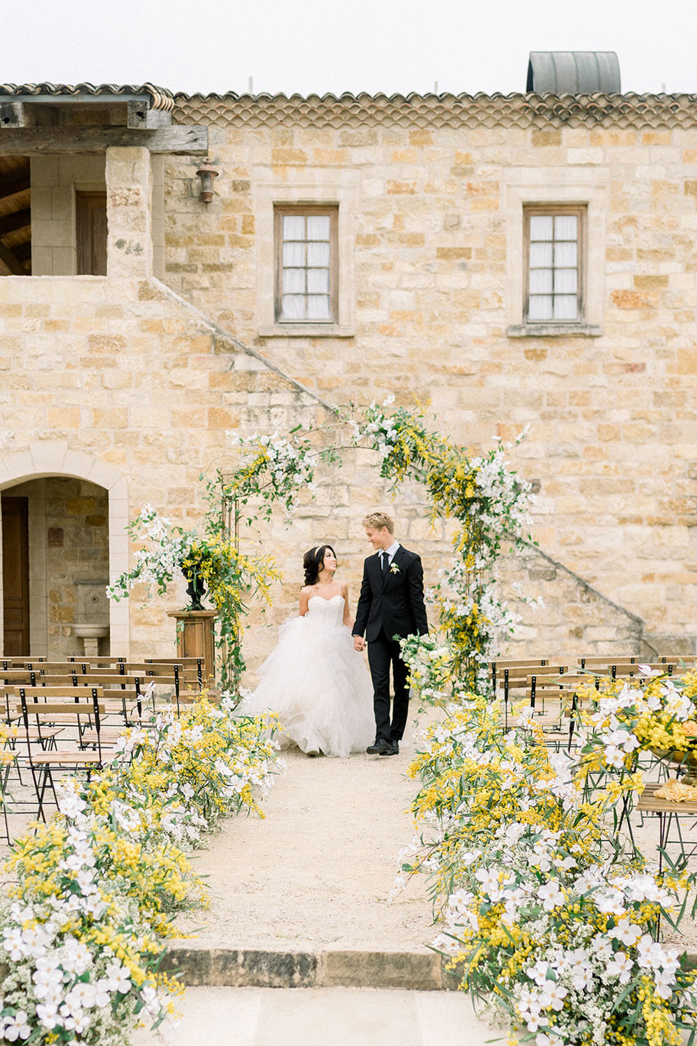 How dreamy is this white and yellow wedding ceremony arch by Parker and Posies & Blush Botanicals? The organic, flowing floral designs pop beautifully against the stone walls.