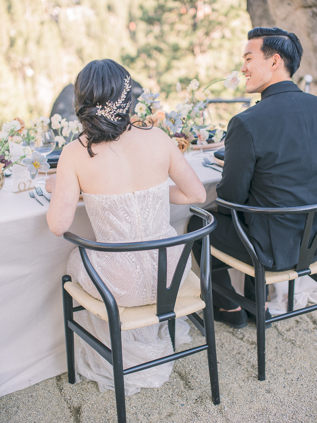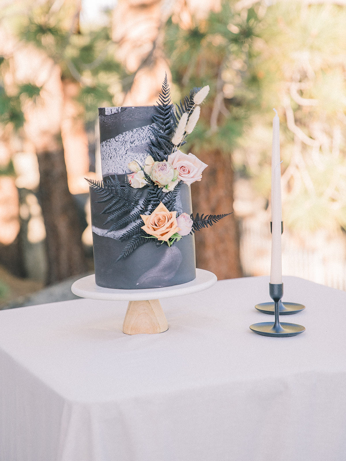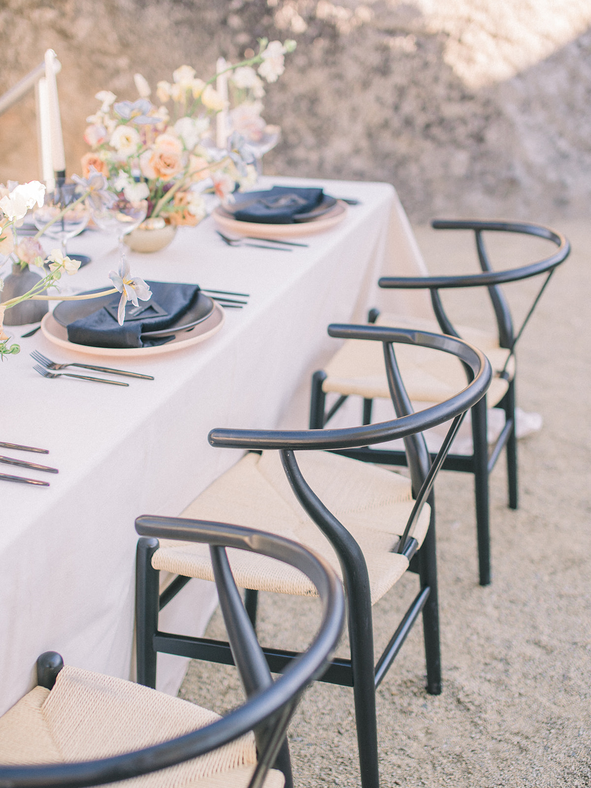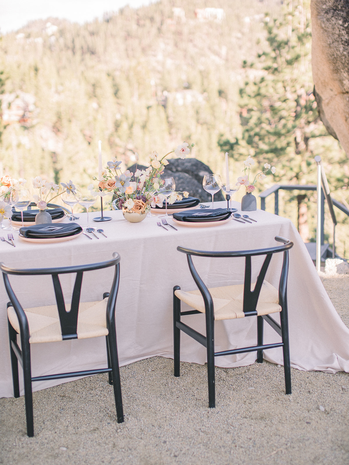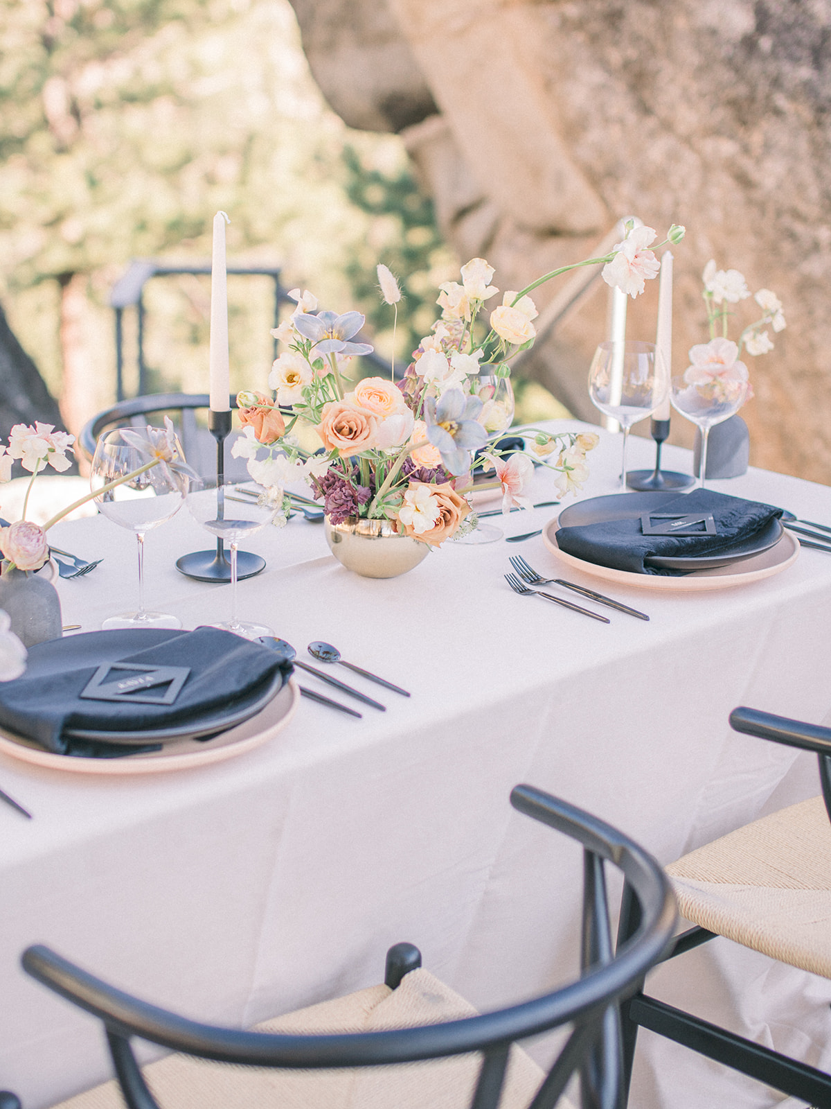 Overlooking the sweeping landscape of California pines, florist Twine Floral Co. designed a modern broken arch with tons of textured florals that brought bohemian flair in an oh-so elegant way. And take a look at that color palette! Blues, purples, and neutrals run wild through the floral design as black ferns complement the modern black flatware, chairs, plates, napkins, and other accents seen throughout the shoot.