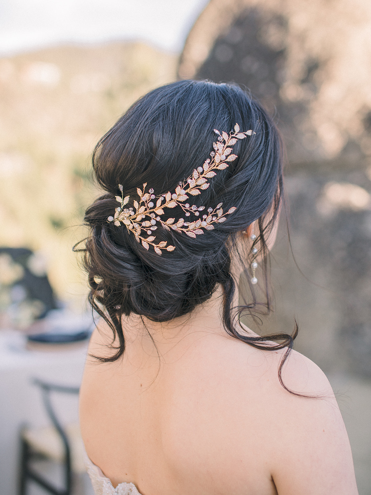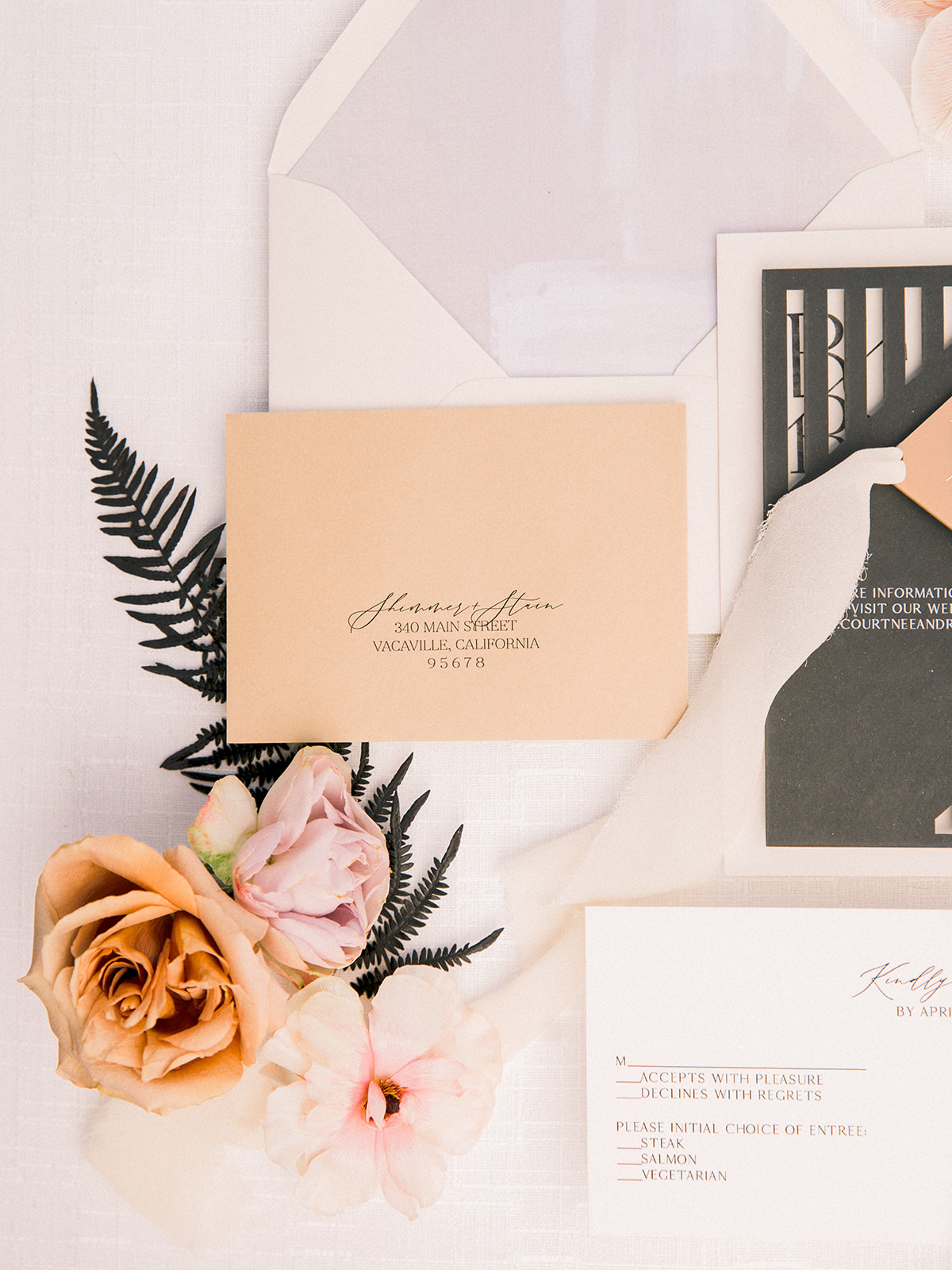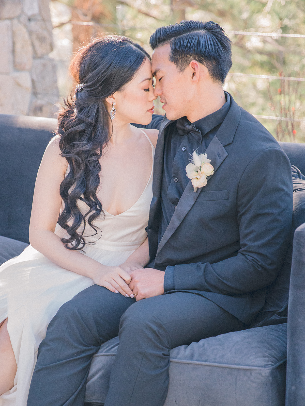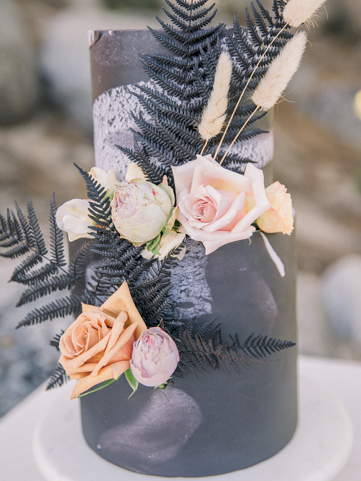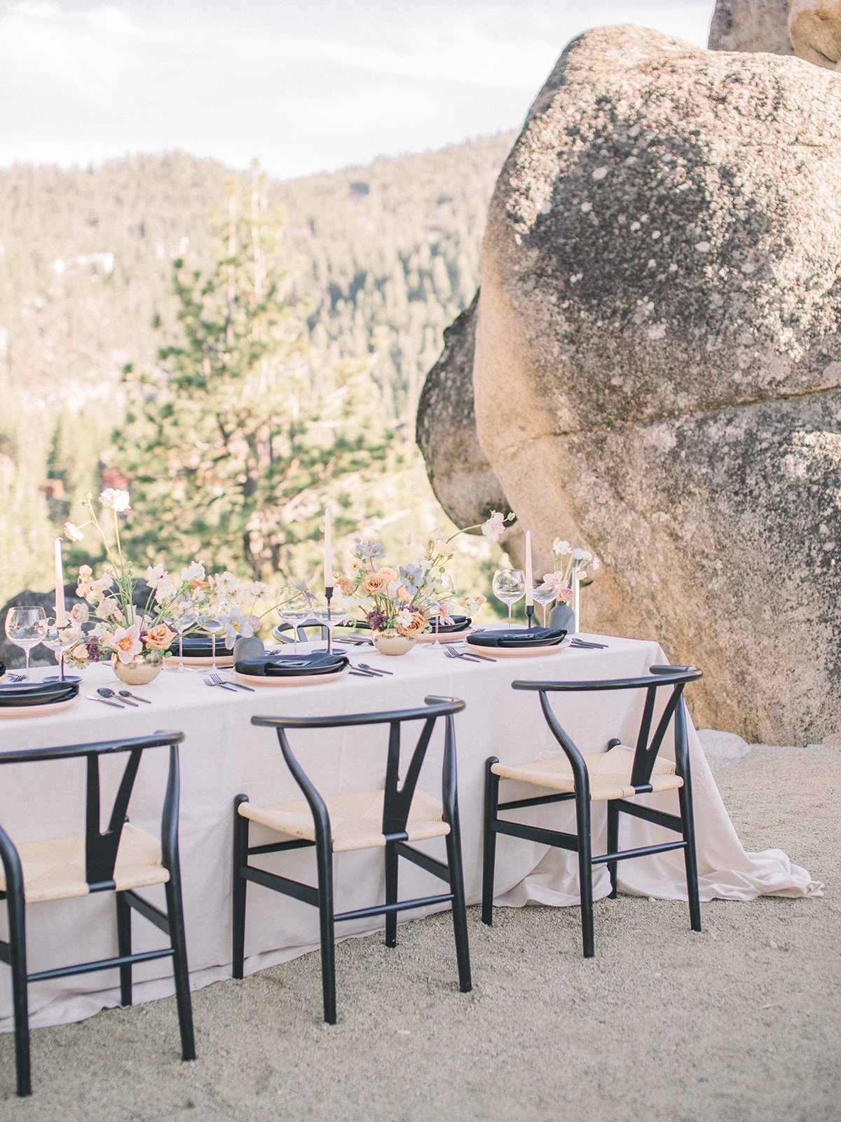 Overlooking the sweeping landscape of California pines, florist Twine Floral Co. designed a modern broken arch with tons of textured florals that brought bohemian flair in an oh-so elegant way. And take a look at that color palette! Blues, purples, and neutrals run wild through the floral design as black ferns complement the modern black flatware, chairs, plates, napkins, and other accents seen throughout the shoot.