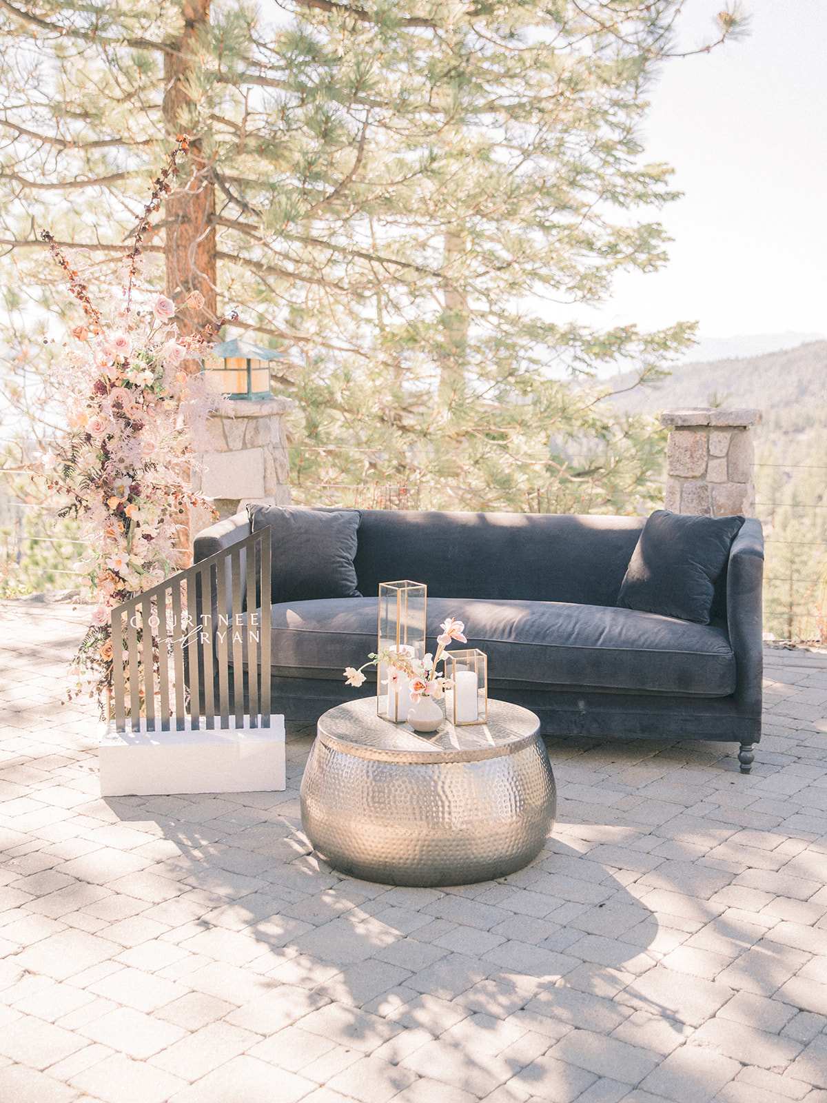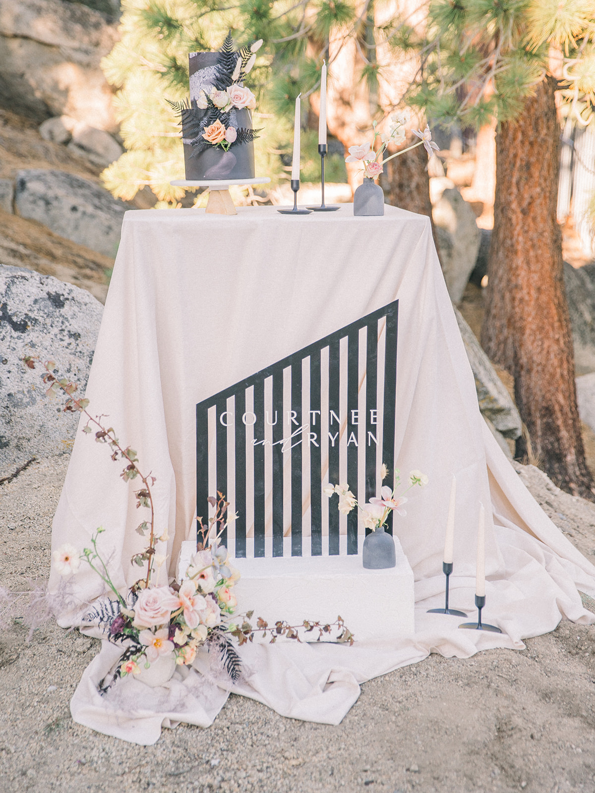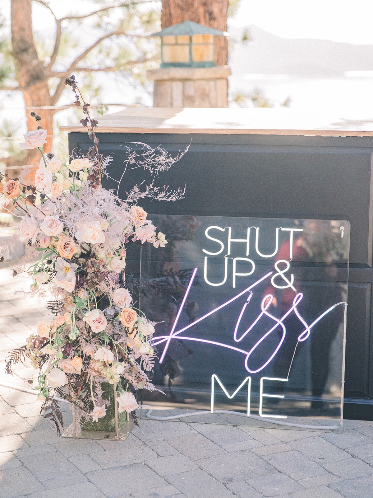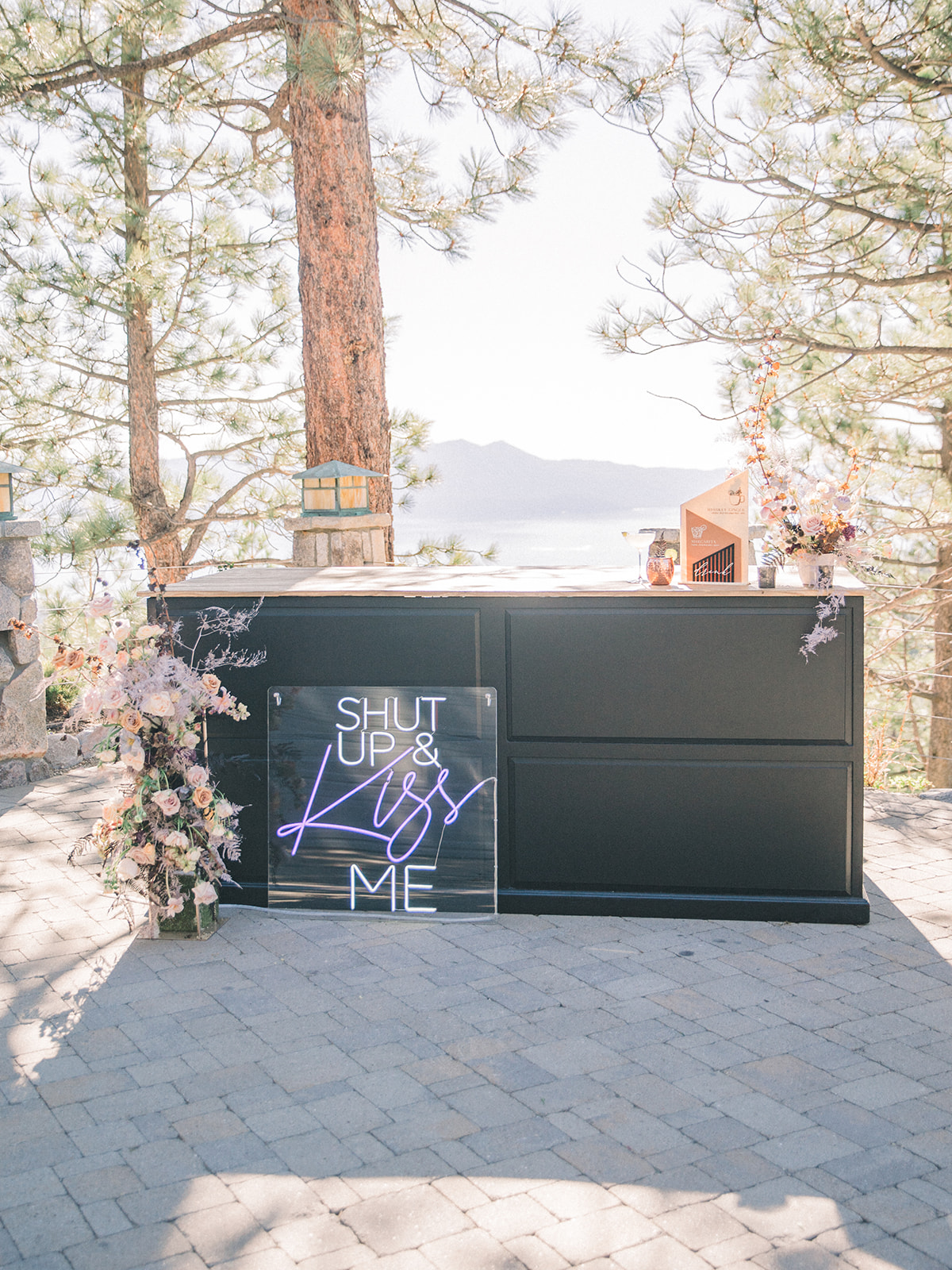 Coordination + Design: Curated by Grace and White | Photography: Lauren Alisse Photography | Venue: Tahoe Blue Estate | Florist: Twine Floral Co. | Signage + Invitation Suite: Shimmer + Stain | Neon Sign: SacTown Neon | Cake: Let Them Eat Cake Davis | HMUA: All Dolled Up Norcal | Rentals: Theoni Collection | Linens: BJJ Linen | Dresses: Pronovias & Leanne Marshall from Grace + White Bridal