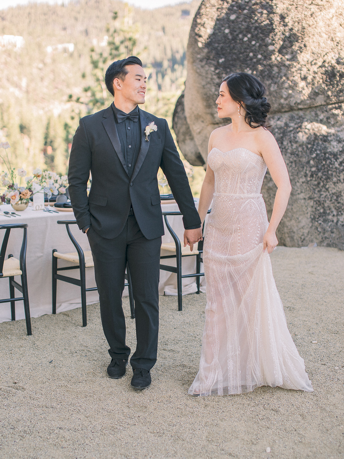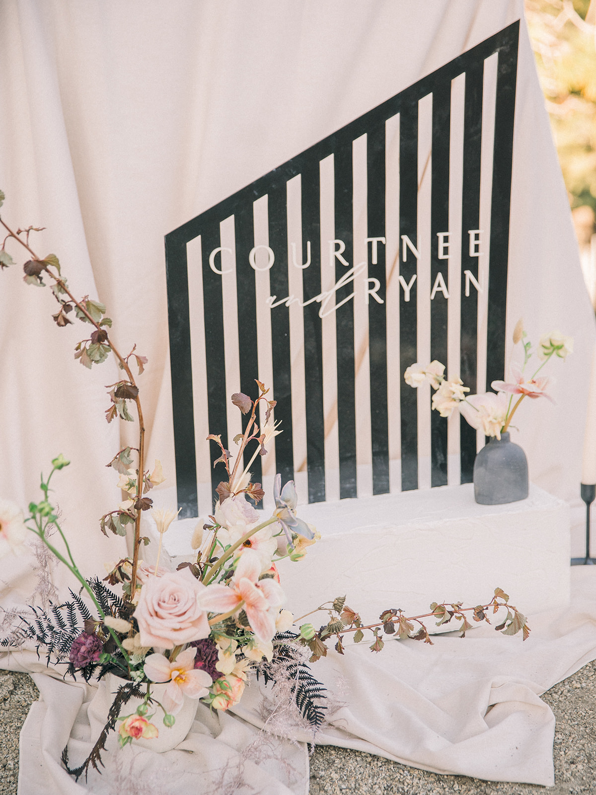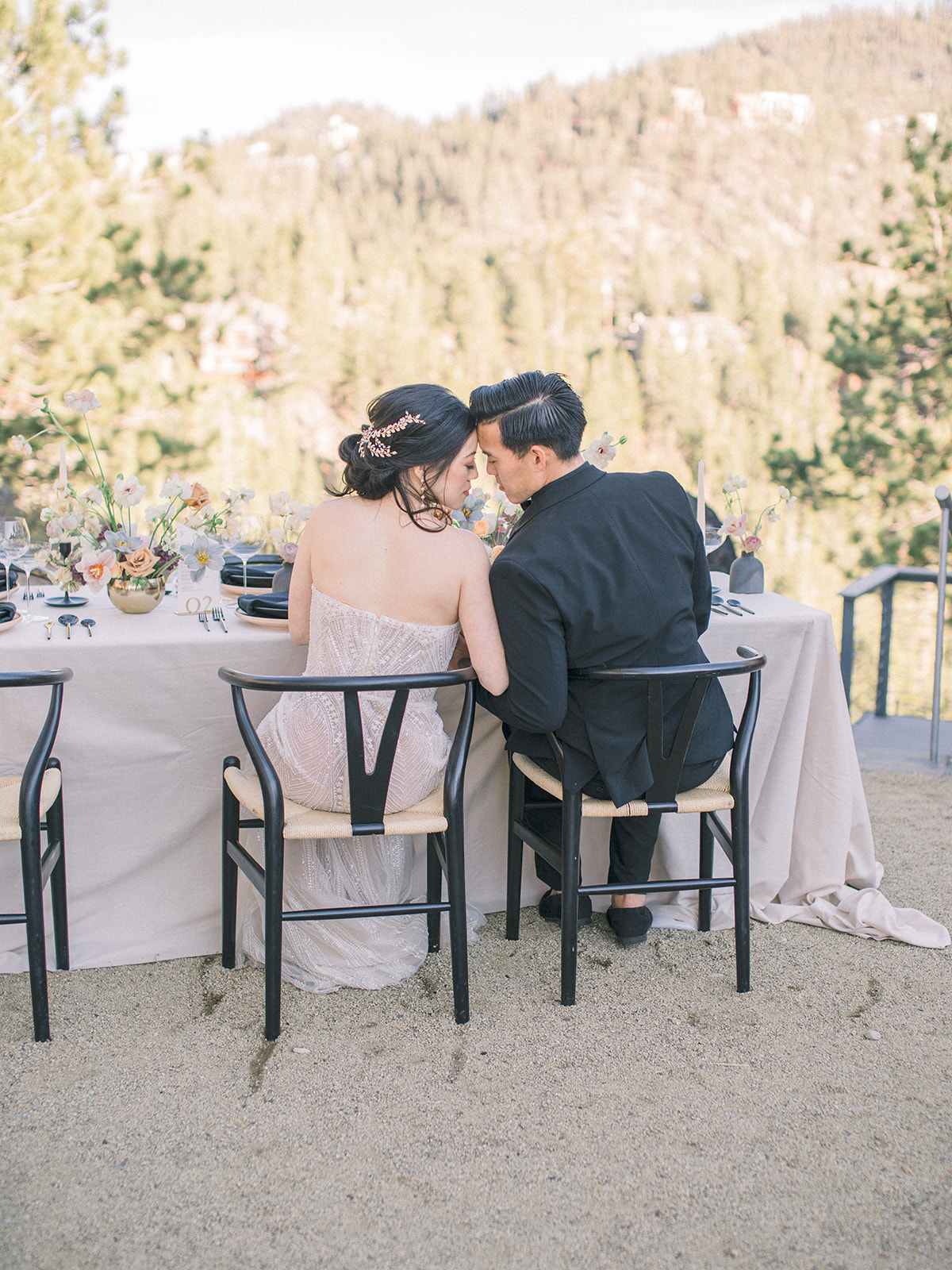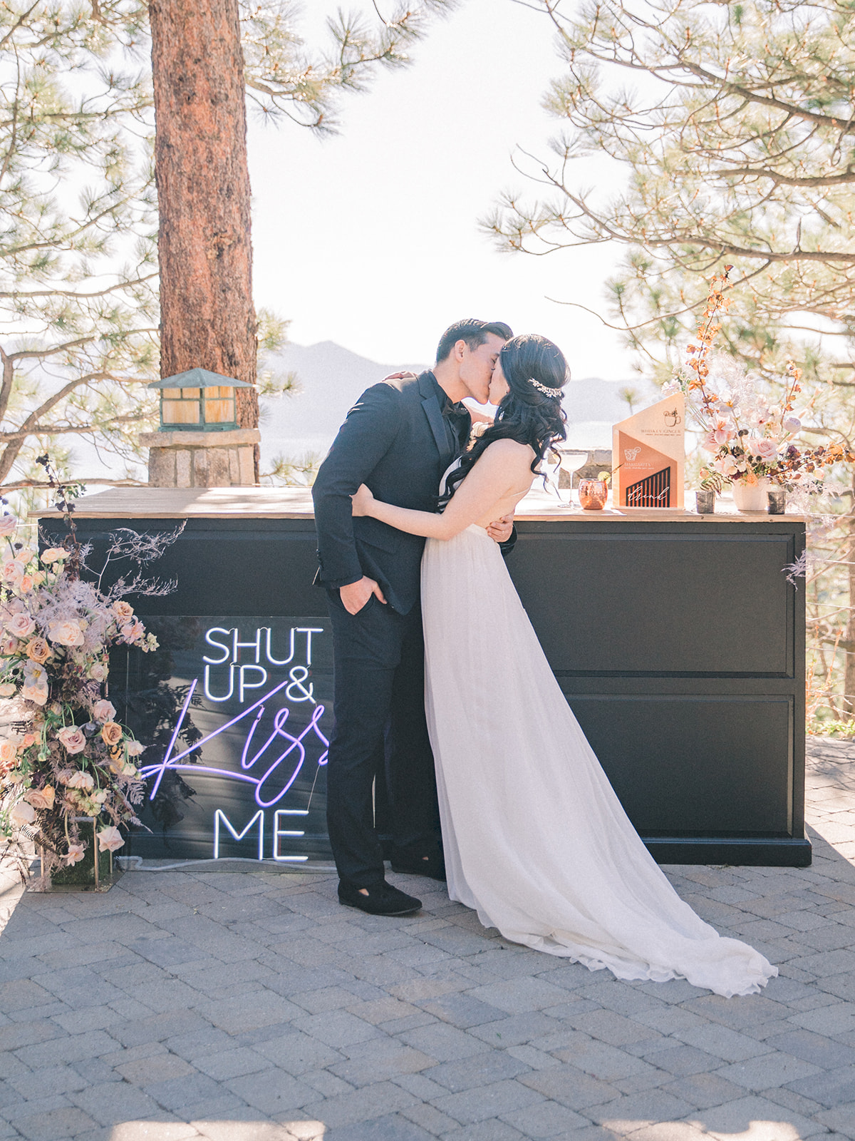 Coordination + Design: Curated by Grace and White | Photography: Lauren Alisse Photography | Venue: Tahoe Blue Estate | Florist: Twine Floral Co. | Signage + Invitation Suite: Shimmer + Stain | Neon Sign: SacTown Neon | Cake: Let Them Eat Cake Davis | HMUA: All Dolled Up Norcal | Rentals: Theoni Collection | Linens: BJJ Linen | Dresses: Pronovias & Leanne Marshall from Grace + White Bridal