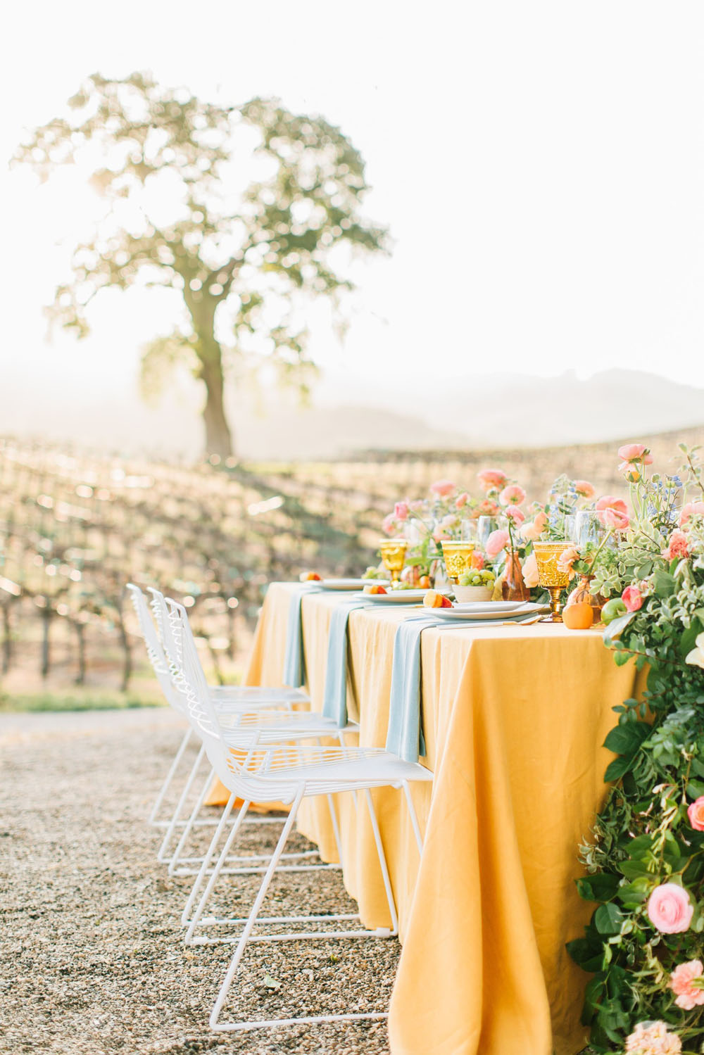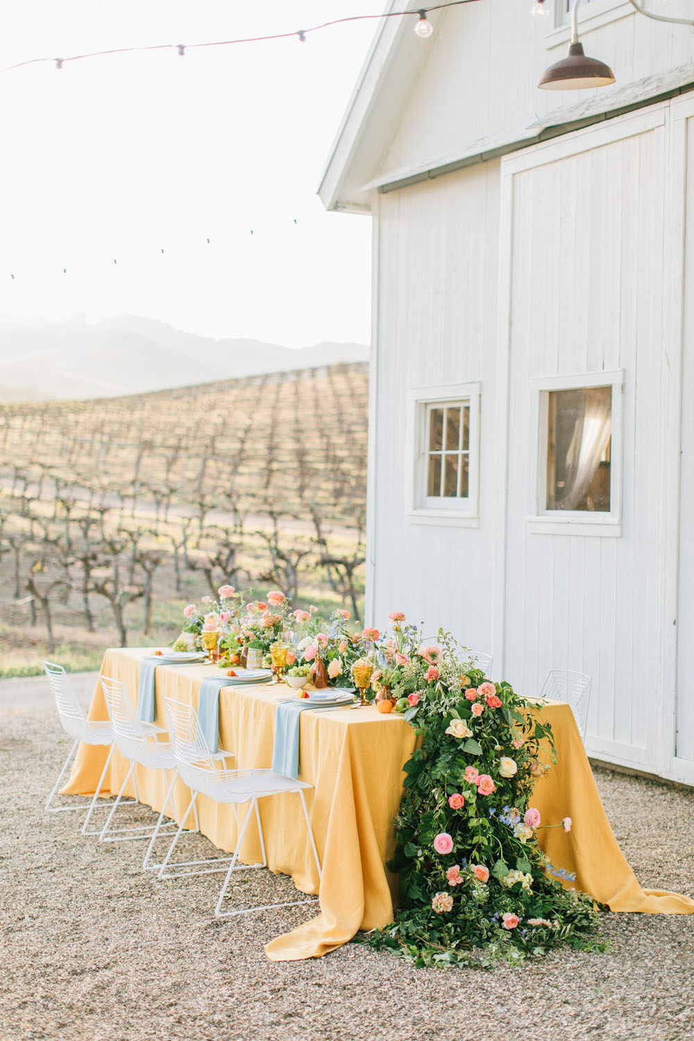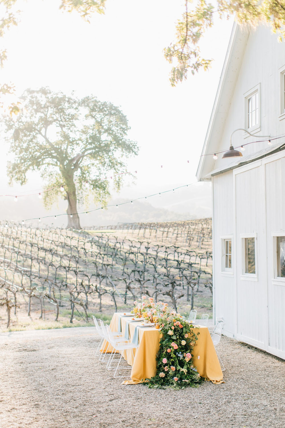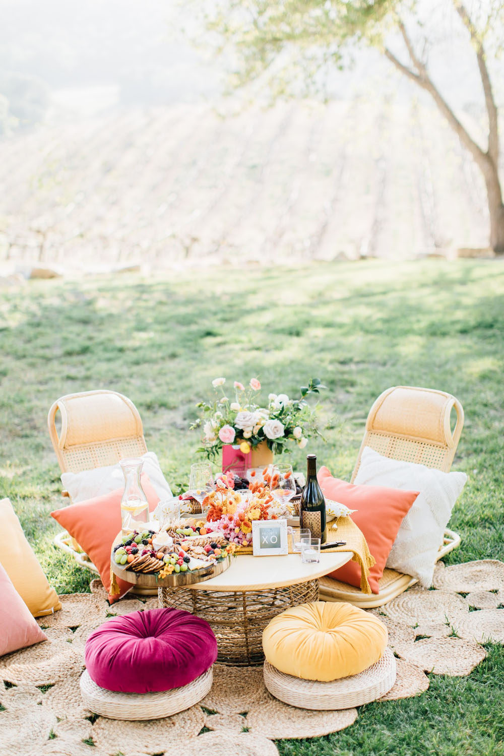 COVID robbed a lot from couples this past year and we felt that those in the planning process needed to experience some joy! Planned by Bundle + Bash and captured by Jessica Sofranko, we melded modern, playful colors with the natural softness of the vineyards. HammerSky provided the perfect blank slate for our pops of color and fun to truly shine. Couples are looking for elements to add to their wedding that are out of the box and so we brought in balloons, a letter marquee, a sweetheart picnic, anything we could think of that screamed fun. Our stationery by Look Good on Paper Co was full of texture with tassels and wax stamps partnered with contemporary diamond edges. Elegant Details softened our modern hand-painted ceremony boxes and chairs with a movement piece of florals, fruit, and ceramic vases. The sweetheart picnic by Project XO provided a romantic alternative to typical cocktail hour seating to enjoy wine and appetizers. Complete with linen tablecloths, amber goblets and tasseled menus, the lush florals draped off of our tablescape inspired by our ceremony backdrop.