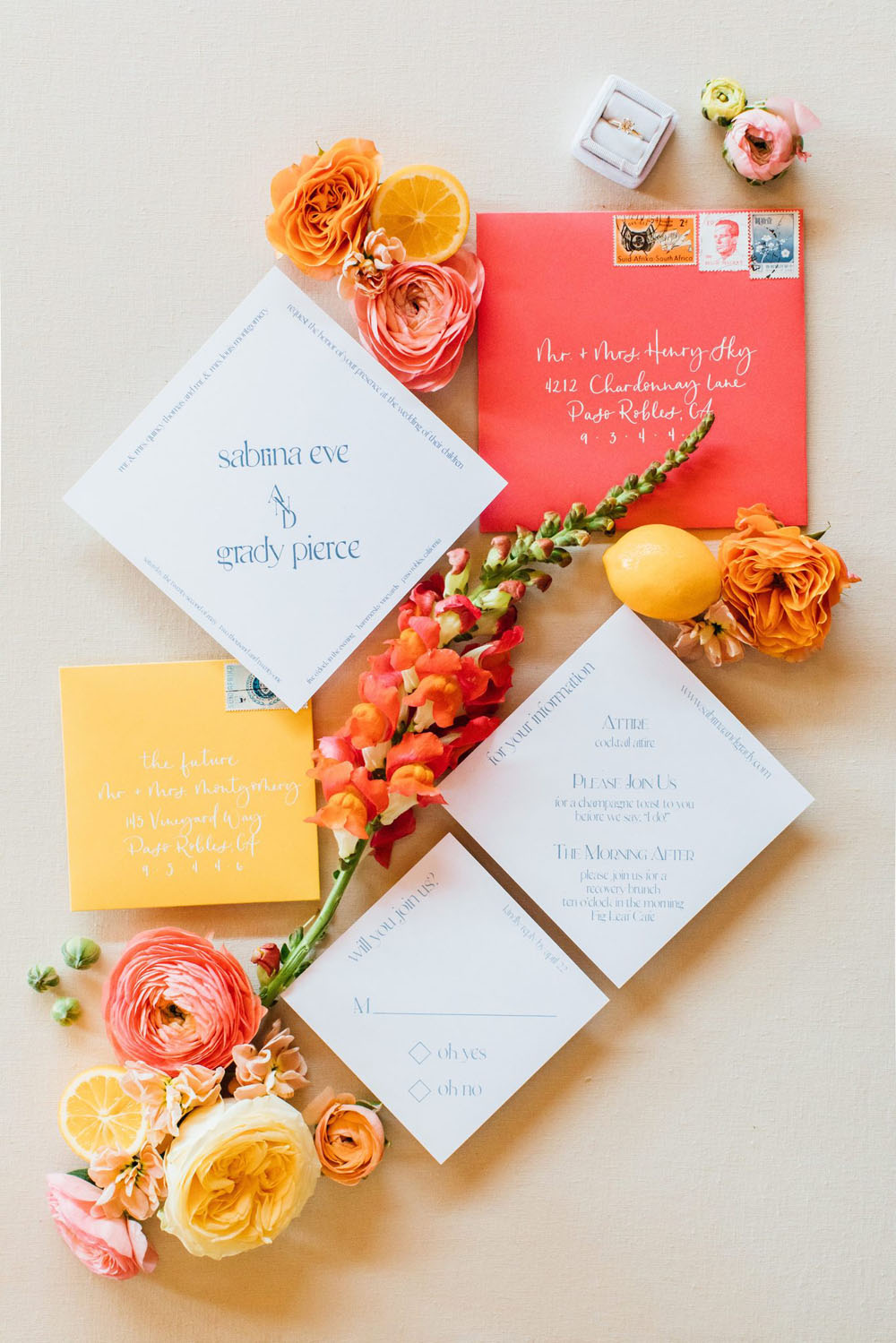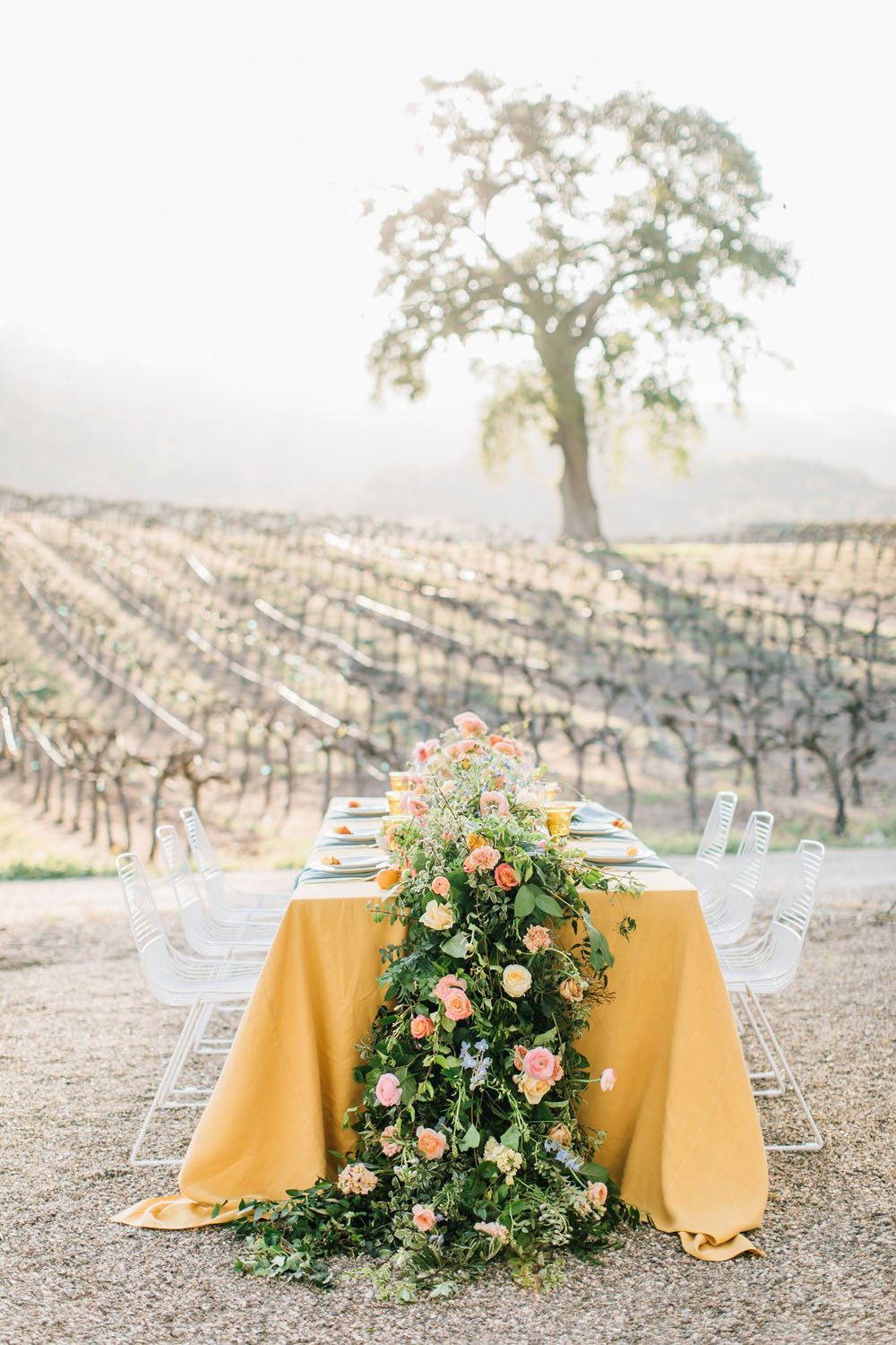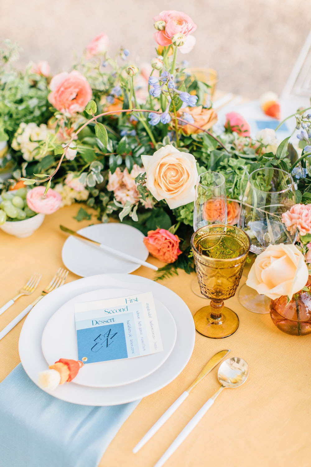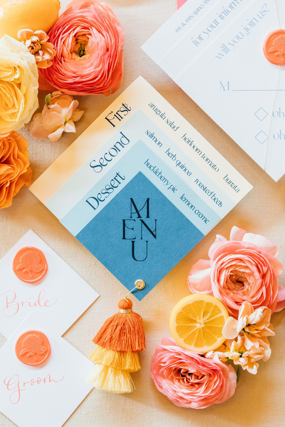 COVID robbed a lot from couples this past year and we felt that those in the planning process needed to experience some joy! Planned by Bundle + Bash and captured by Jessica Sofranko, we melded modern, playful colors with the natural softness of the vineyards. HammerSky provided the perfect blank slate for our pops of color and fun to truly shine. Couples are looking for elements to add to their wedding that are out of the box and so we brought in balloons, a letter marquee, a sweetheart picnic, anything we could think of that screamed fun. Our stationery by Look Good on Paper Co was full of texture with tassels and wax stamps partnered with contemporary diamond edges. Elegant Details softened our modern hand-painted ceremony boxes and chairs with a movement piece of florals, fruit, and ceramic vases. The sweetheart picnic by Project XO provided a romantic alternative to typical cocktail hour seating to enjoy wine and appetizers. Complete with linen tablecloths, amber goblets and tasseled menus, the lush florals draped off of our tablescape inspired by our ceremony backdrop.