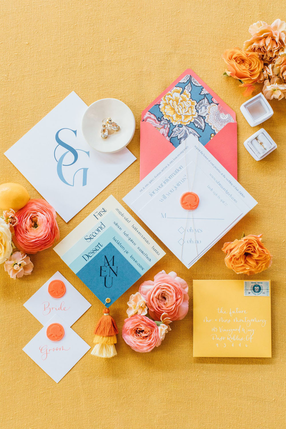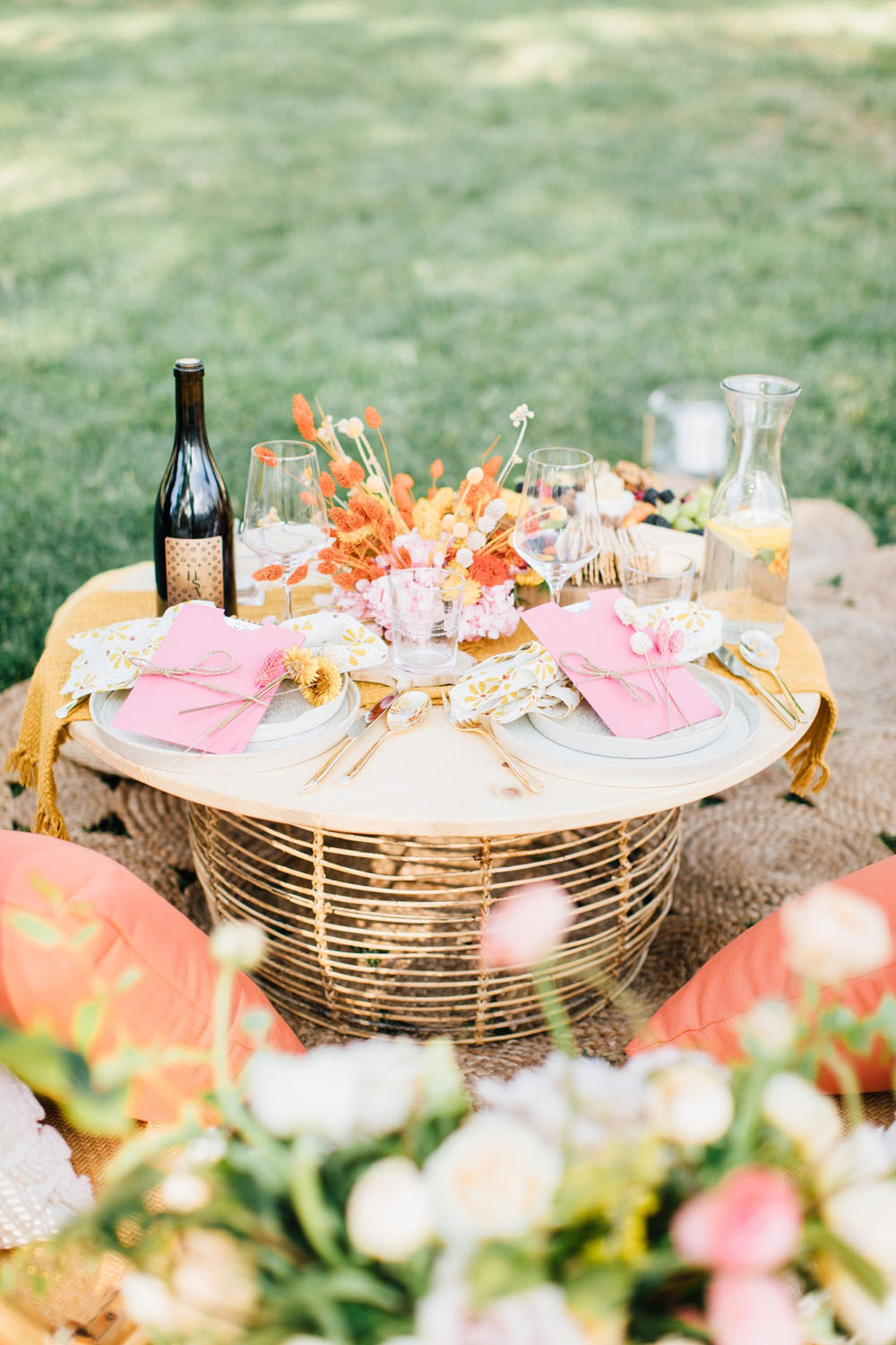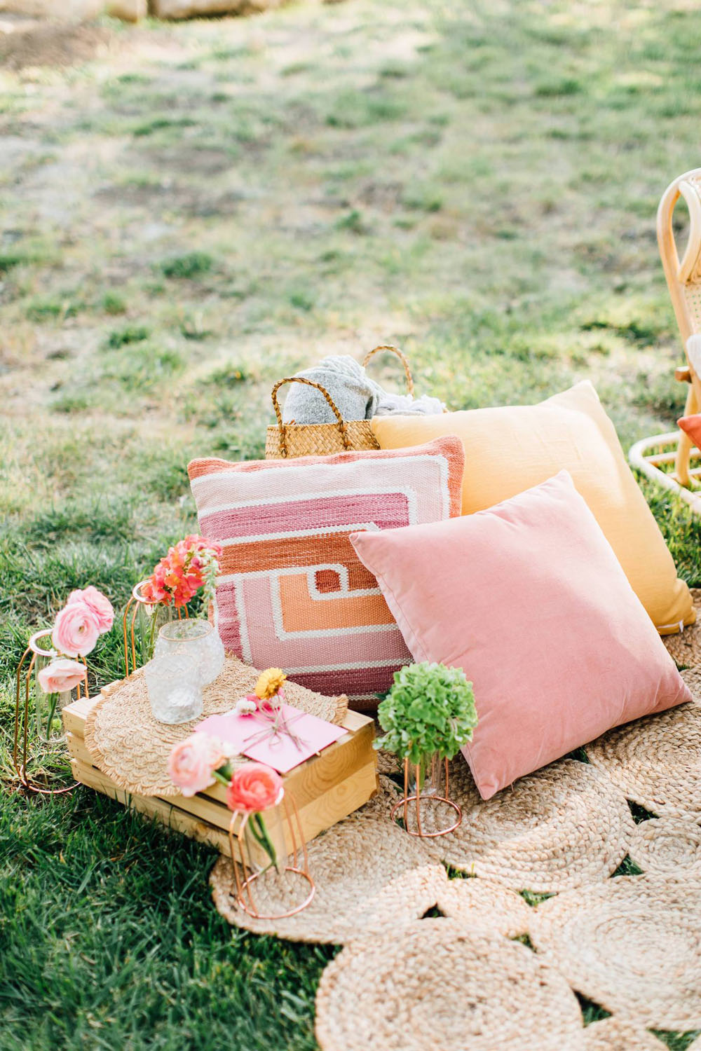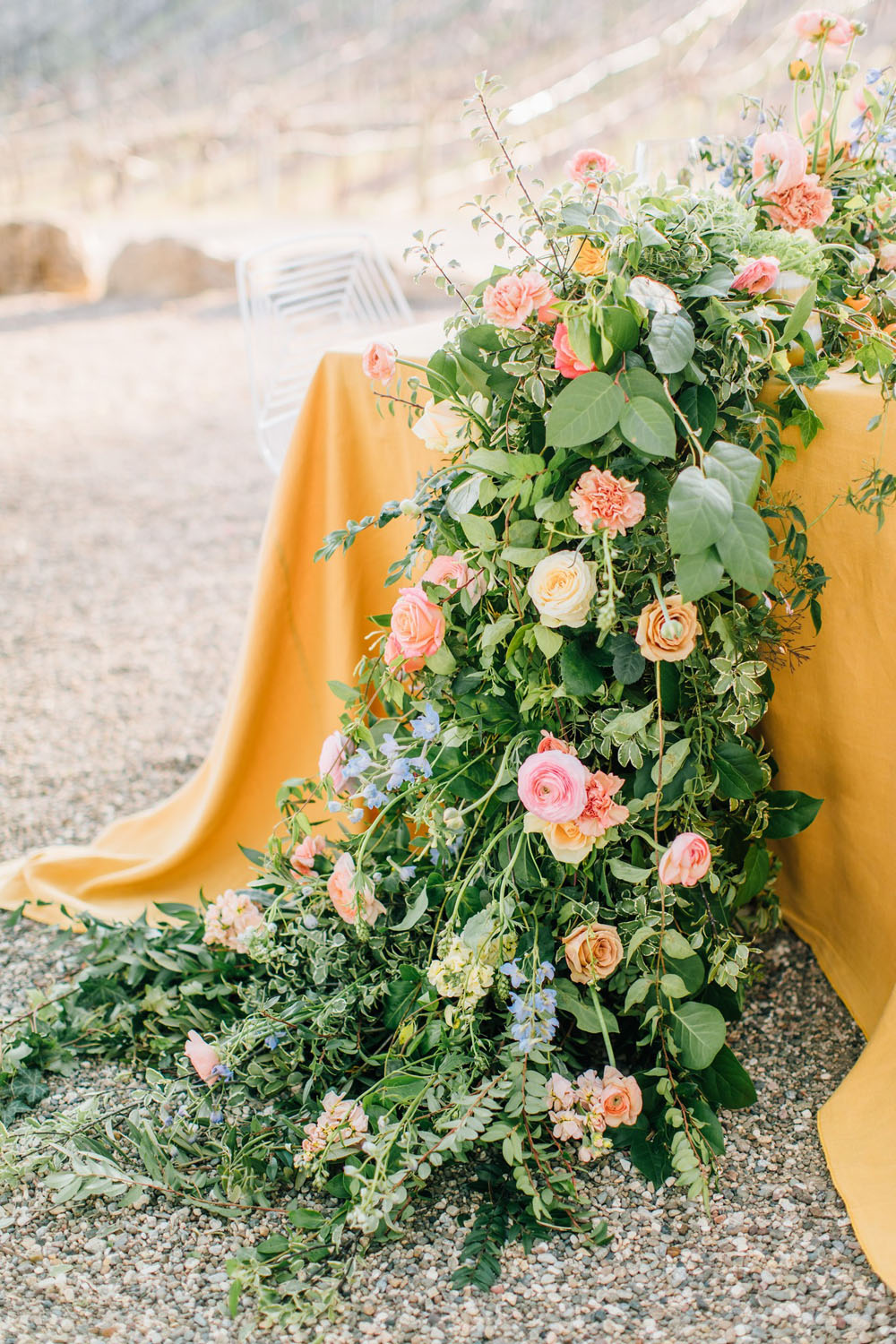 COVID robbed a lot from couples this past year and we felt that those in the planning process needed to experience some joy! Planned by Bundle + Bash and captured by Jessica Sofranko, we melded modern, playful colors with the natural softness of the vineyards. HammerSky provided the perfect blank slate for our pops of color and fun to truly shine. Couples are looking for elements to add to their wedding that are out of the box and so we brought in balloons, a letter marquee, a sweetheart picnic, anything we could think of that screamed fun. Our stationery by Look Good on Paper Co was full of texture with tassels and wax stamps partnered with contemporary diamond edges. Elegant Details softened our modern hand-painted ceremony boxes and chairs with a movement piece of florals, fruit, and ceramic vases. The sweetheart picnic by Project XO provided a romantic alternative to typical cocktail hour seating to enjoy wine and appetizers. Complete with linen tablecloths, amber goblets and tasseled menus, the lush florals draped off of our tablescape inspired by our ceremony backdrop.