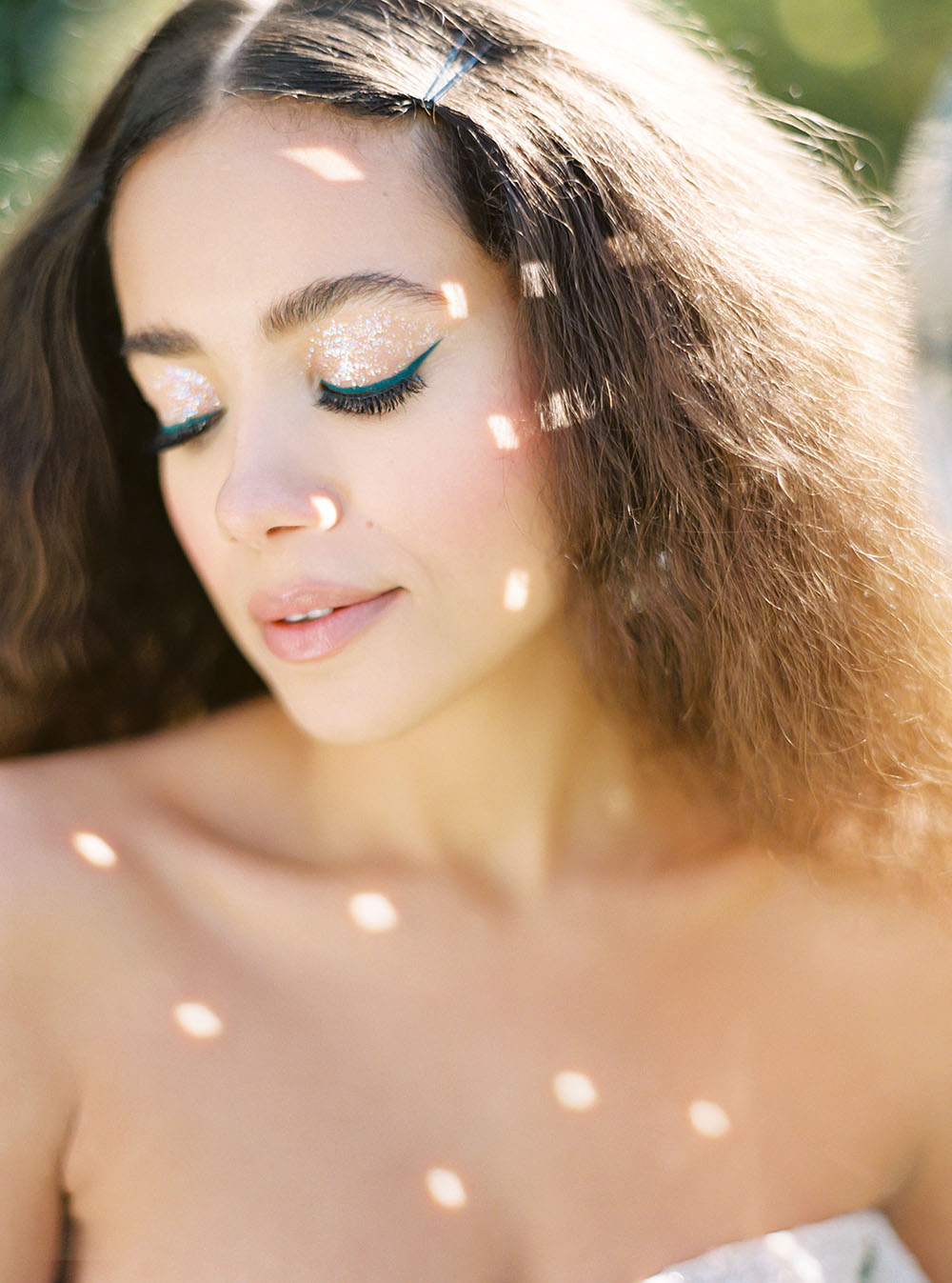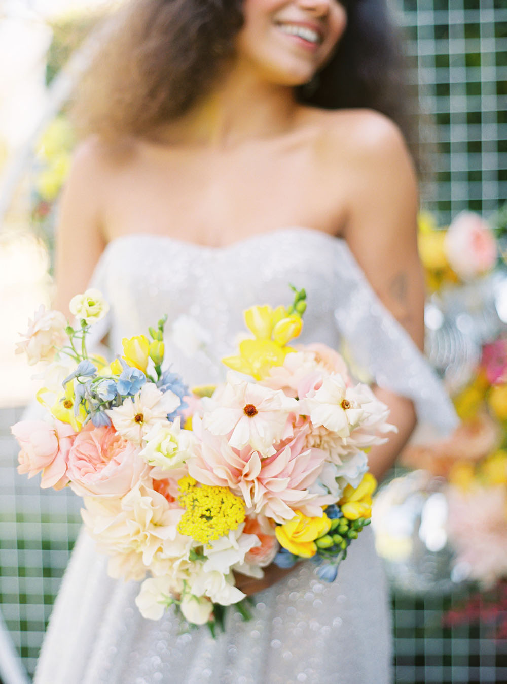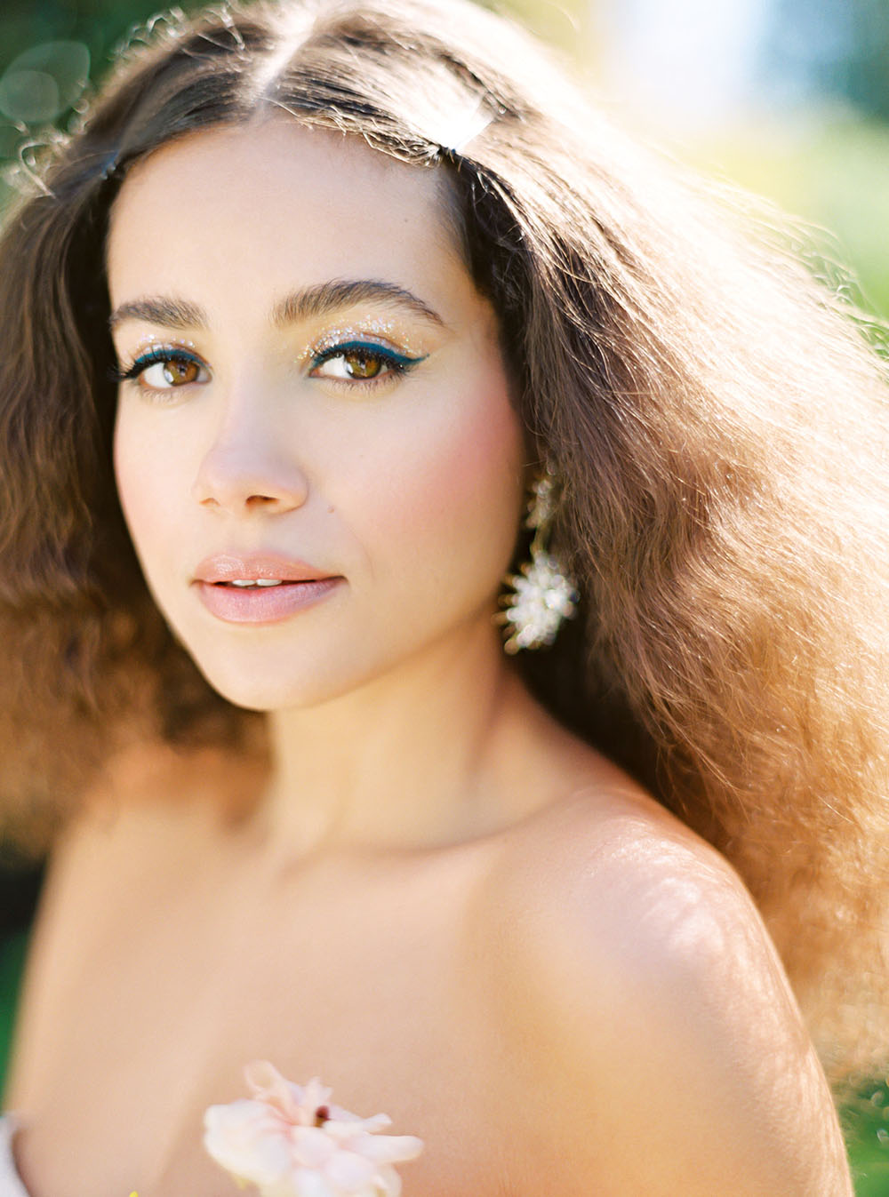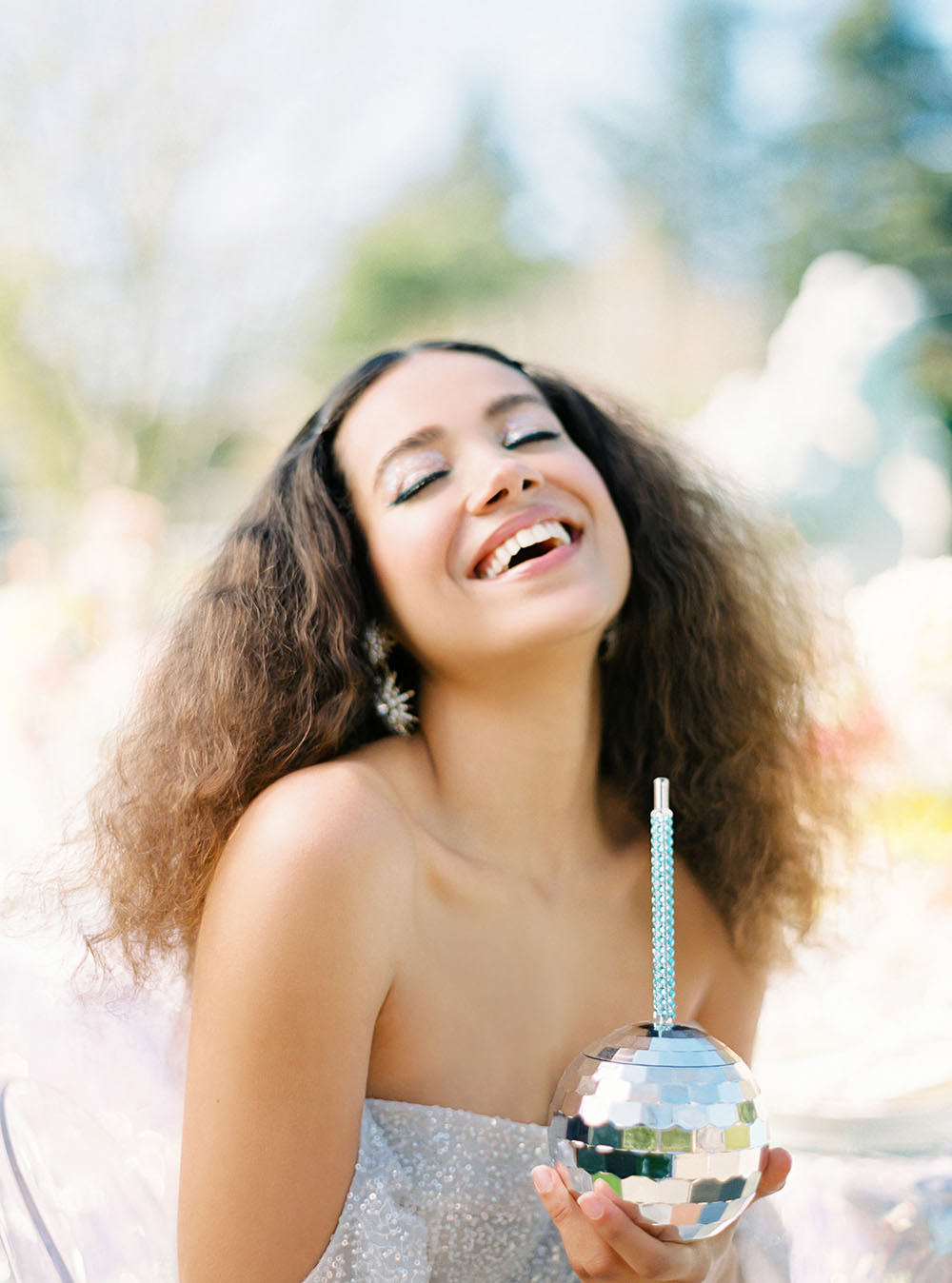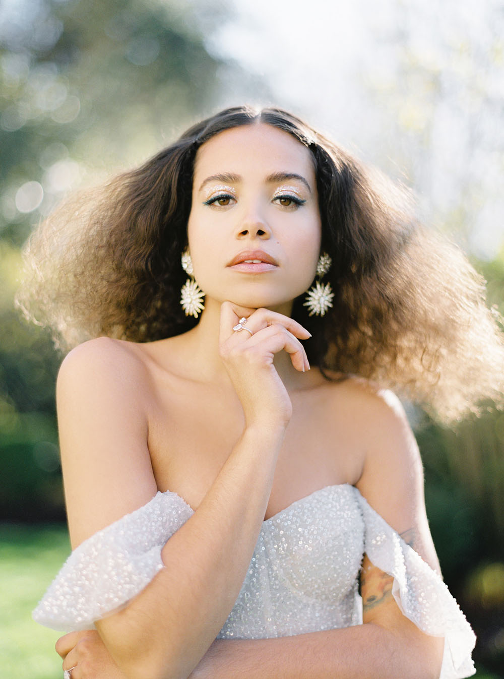 The bride rocked a sparkly Alena Leena wedding dress, a hairstyle inspired by Diana Ross, and a retro-punk inspired blue cat eye.
