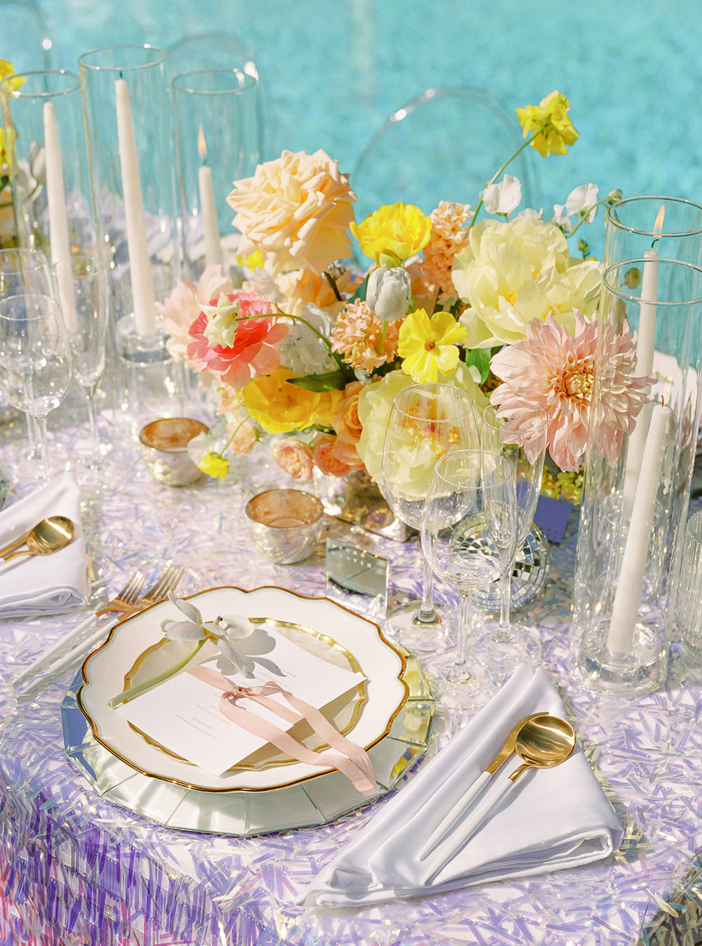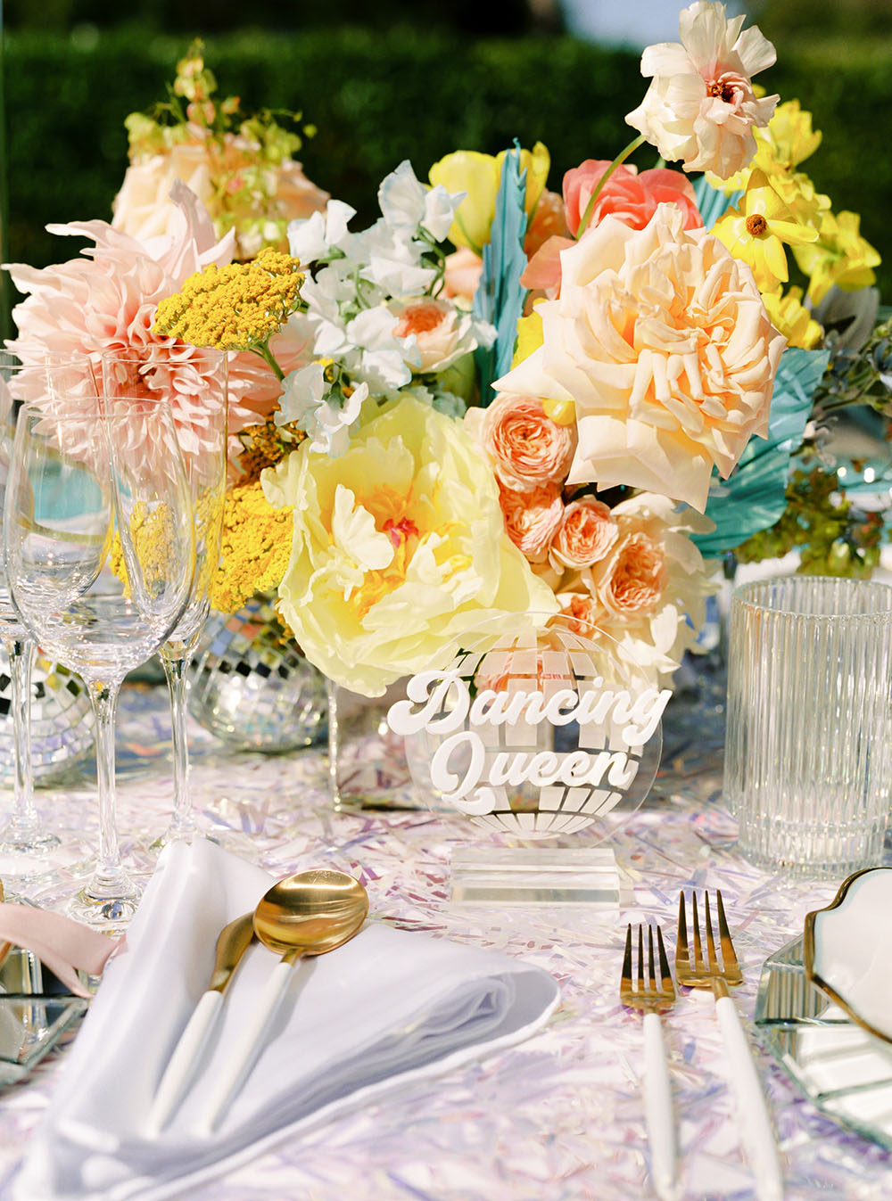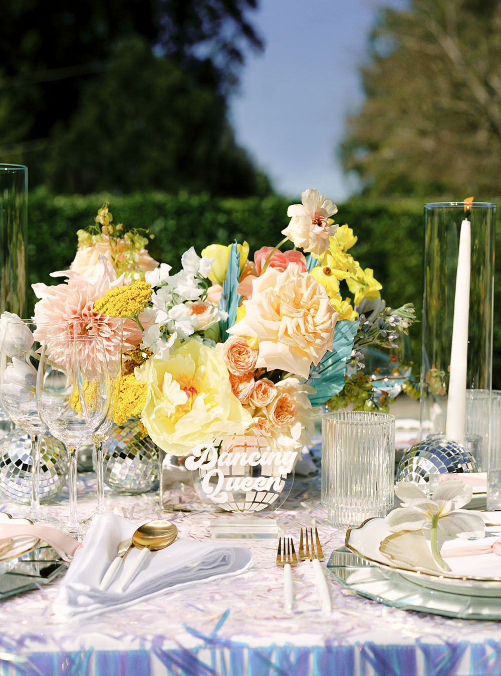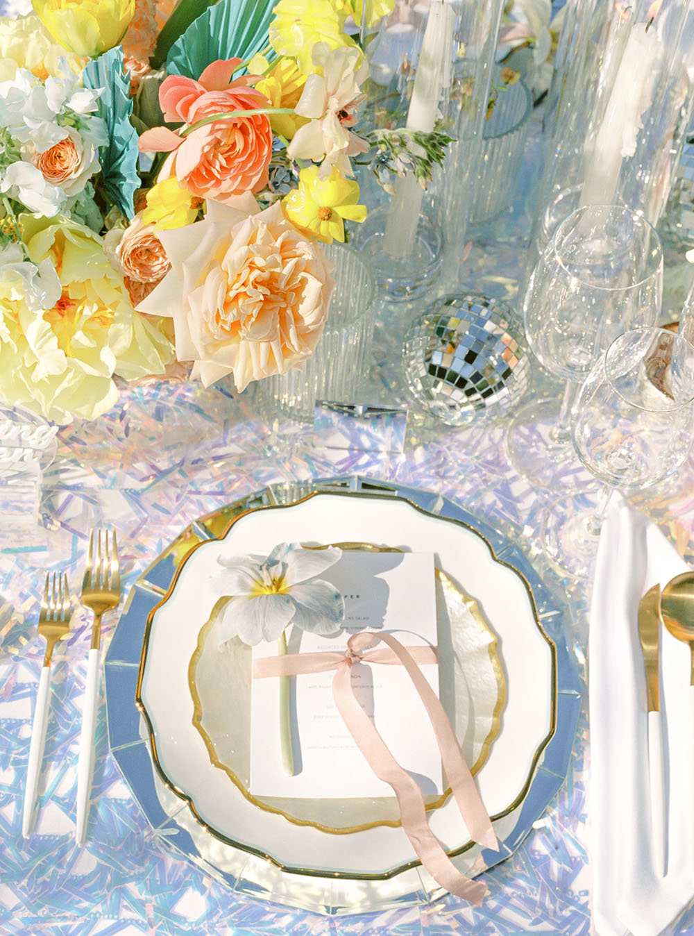 The dinner table decor combined several unexpected disco elements in a modern, chic way. The table linen was made from a holographic material that shimmered in the sunlight like a disco ball and provided a festive backdrop for the dinner setting. Each place setting had mirrored chargers that emulated the shape and tiling of a mirrored disco ball. We incorporated bold, bright colored flowers in the centerpieces at different heights to give the table a young cheerful vibe. We kept most of the other elements on the table very clean and simple in order to provide balance between the flashy theme and more subdued current trends. This modernized the overall tablescape aesthetic and made it a fun but stylish ode to the disco era.
