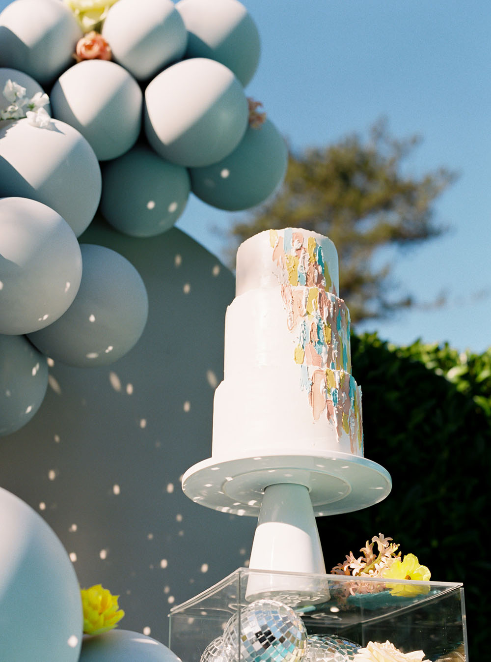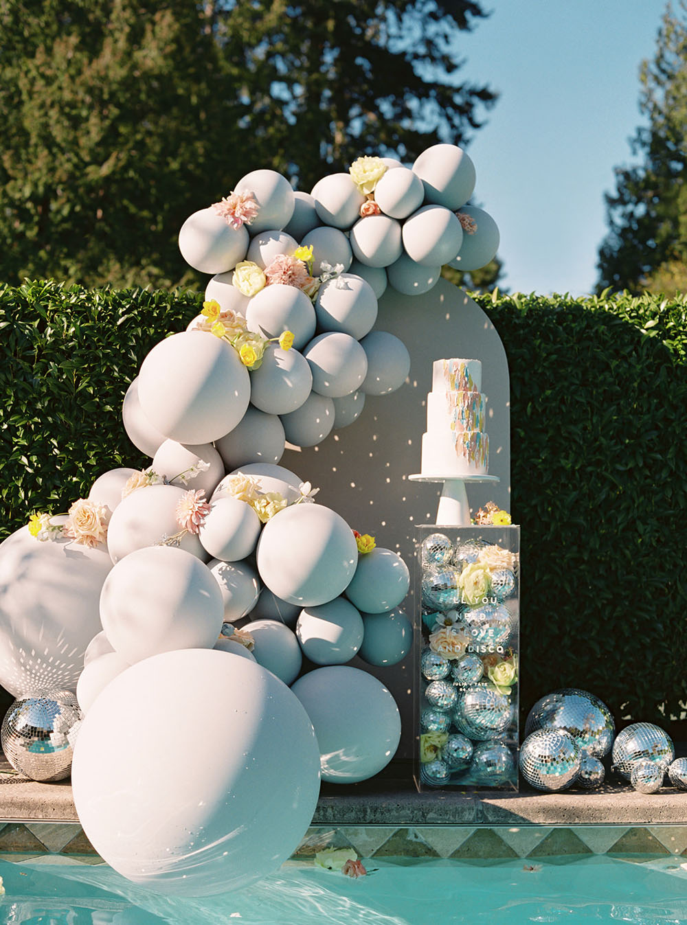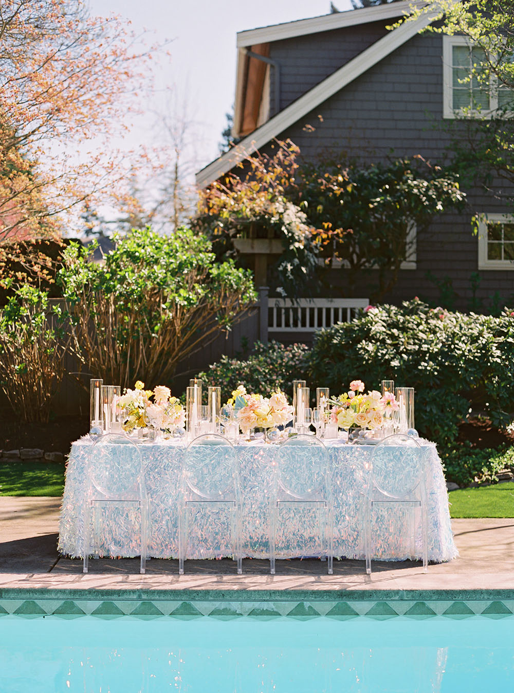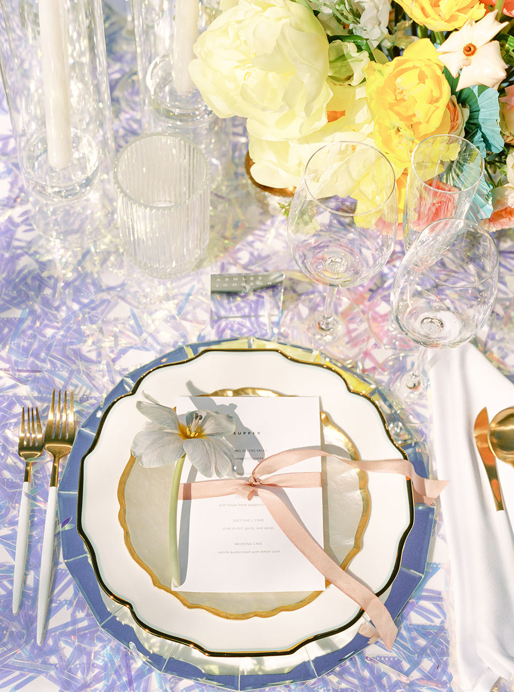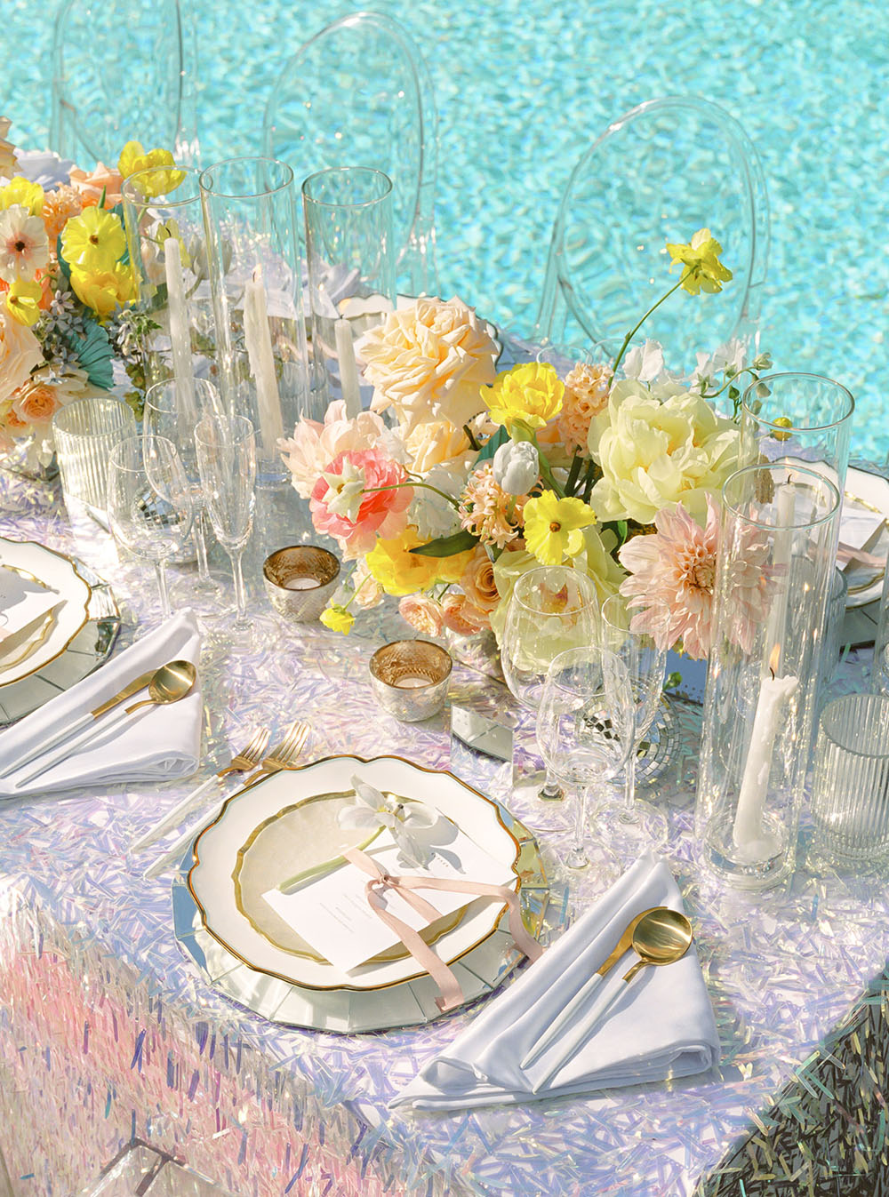 The dinner table decor combined several unexpected disco elements in a modern, chic way. The table linen was made from a holographic material that shimmered in the sunlight like a disco ball and provided a festive backdrop for the dinner setting. Each place setting had mirrored chargers that emulated the shape and tiling of a mirrored disco ball. We incorporated bold, bright colored flowers in the centerpieces at different heights to give the table a young cheerful vibe. We kept most of the other elements on the table very clean and simple in order to provide balance between the flashy theme and more subdued current trends. This modernized the overall tablescape aesthetic and made it a fun but stylish ode to the disco era.