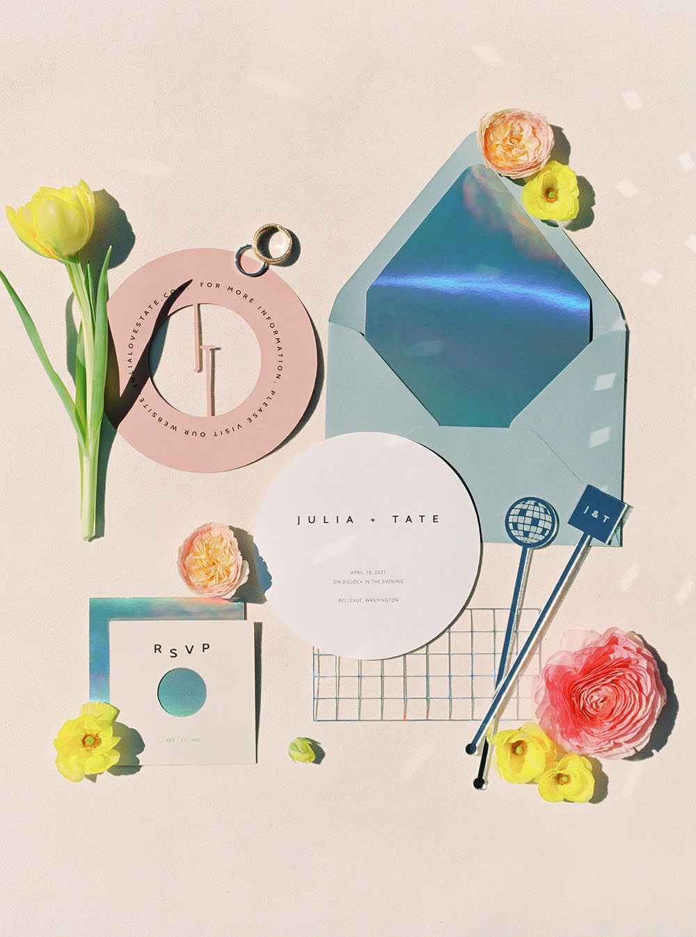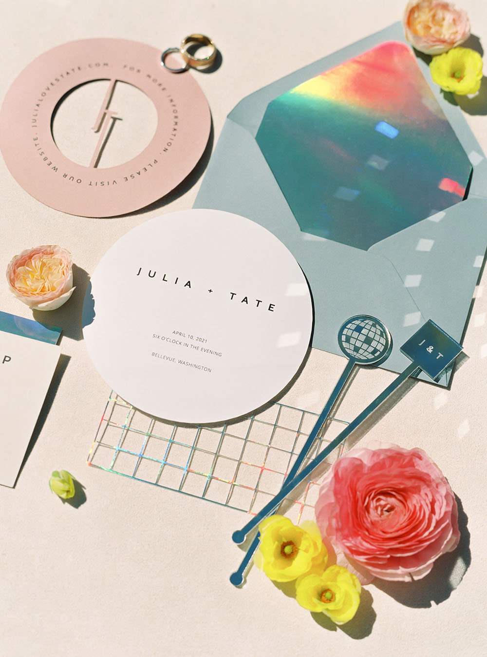 The Fancy Cat Paper Studio included several subtle homages to the disco era in the invitation suite, like a record inspired invitation, a record sleeve RSVP card, and a holographic disco ball-inspired belly band. A holographic invitation liner tied the suite together in a playful and refreshing way.