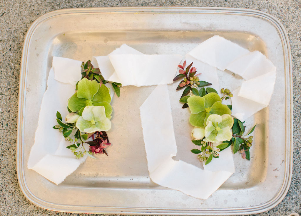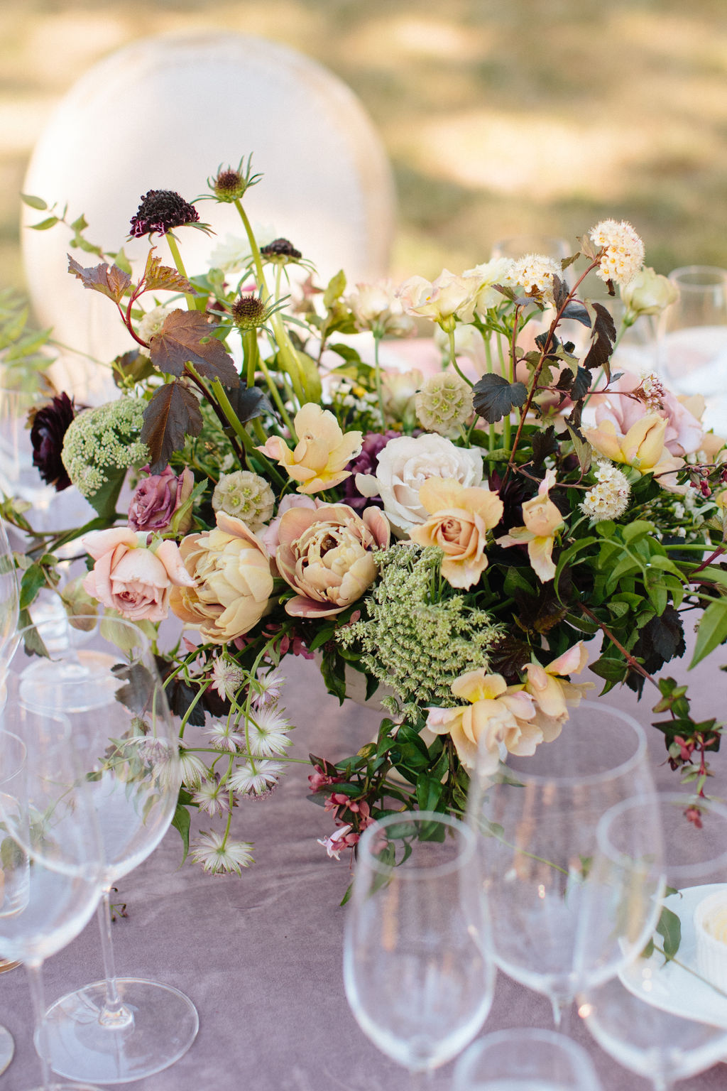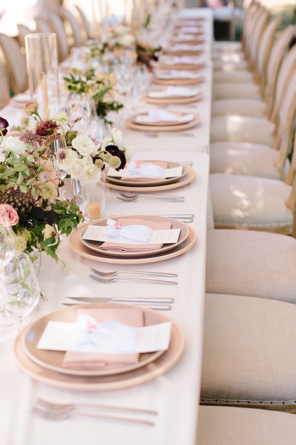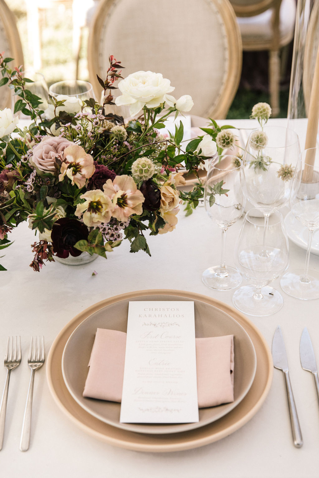 The tablescape featured beautiful neutral tabletop rentals from Theoni, and a mix of low flower arrangements and ikebana arrangements by Max Gill.