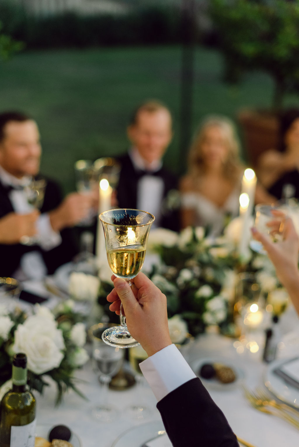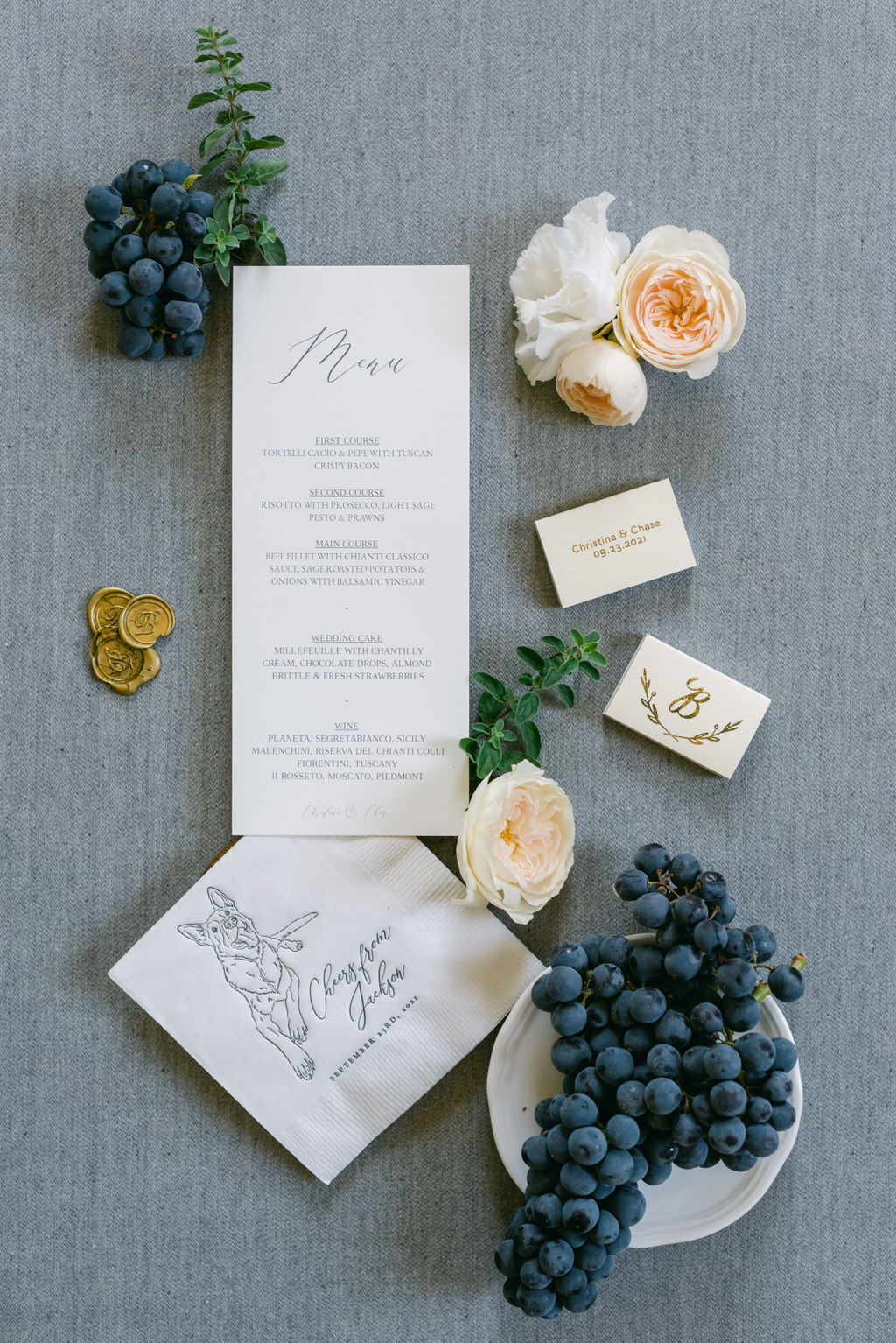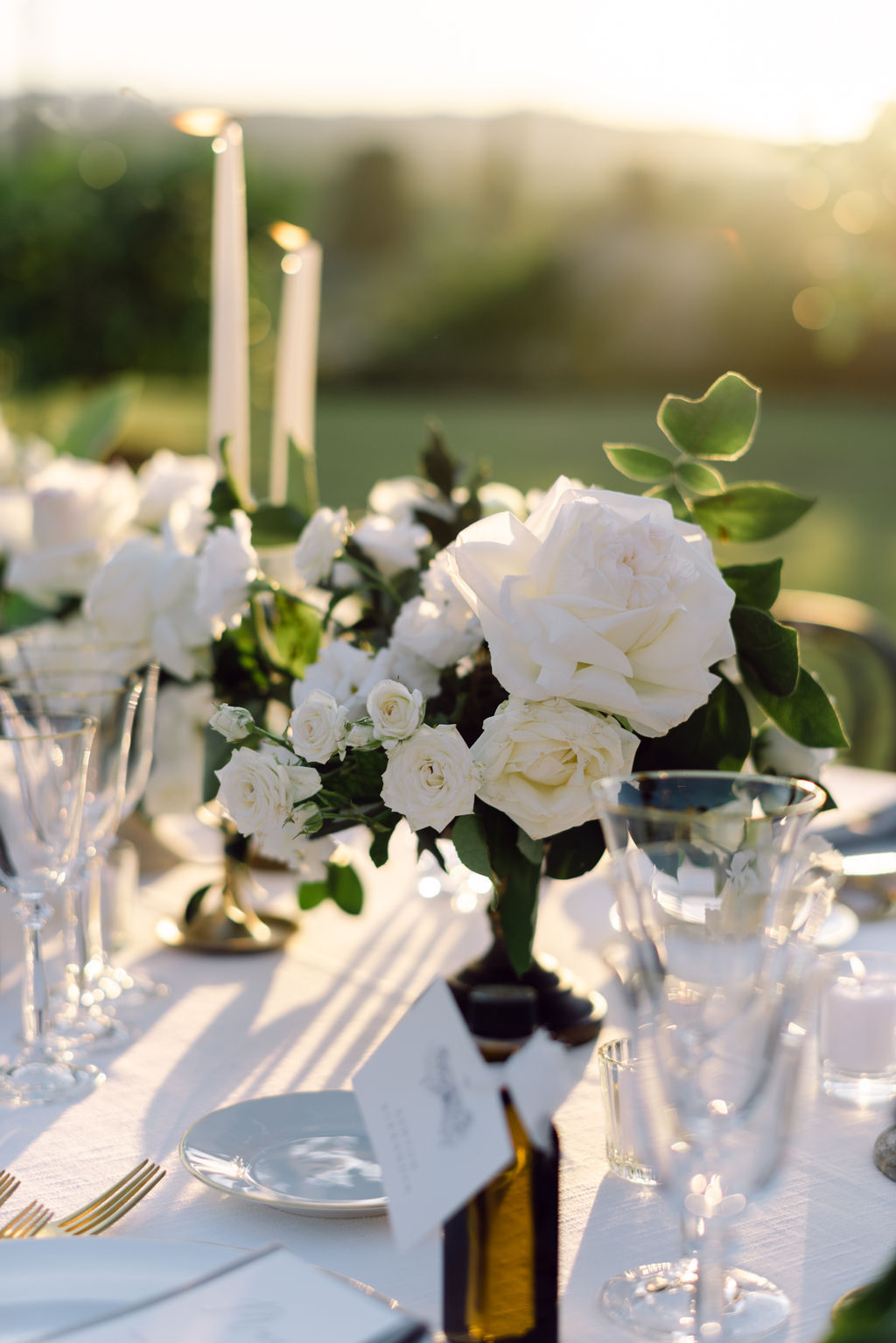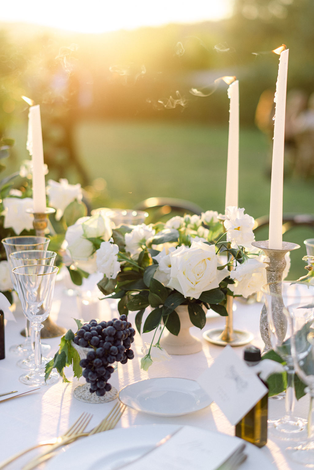 A few tips from the planners… The venue is also a vineyard, and being the middle of September it is the ‘vendemmia’ or grape harvest season, so we draped grapes within the table decor to add a layer of interest and styling that also was in keeping with the darker tones and black accents seen throughout. Understandably the idea of having ‘black’ accents for a wedding seems a bit odd at first, but done tastefully it can really elevate a design and with the dress code as black tie, it really worked. The addition of the black ‘Thonet’ chairs brought everything together for both the ceremony and dinner- and we cannot underline enough what a difference the right chair choice can make to your overall wedding design. They are physically a ‘large’ item so naturally they have a big impact too.