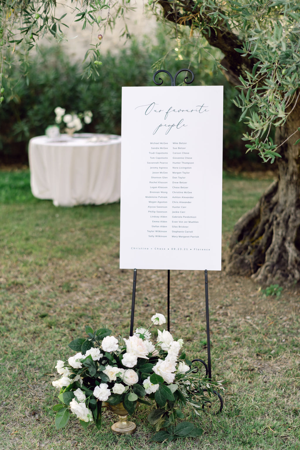 The team tells us, In terms of design for the wedding day, we wanted to create something timeless and typically ‘Tuscan’ but with a unique and slightly modern edge so that the design really stood out. The design process began with classic greens and whites, but Christina trusted our vision to bring in some darker tones as well as different floral shades to add depth to the design and really bring it to life.