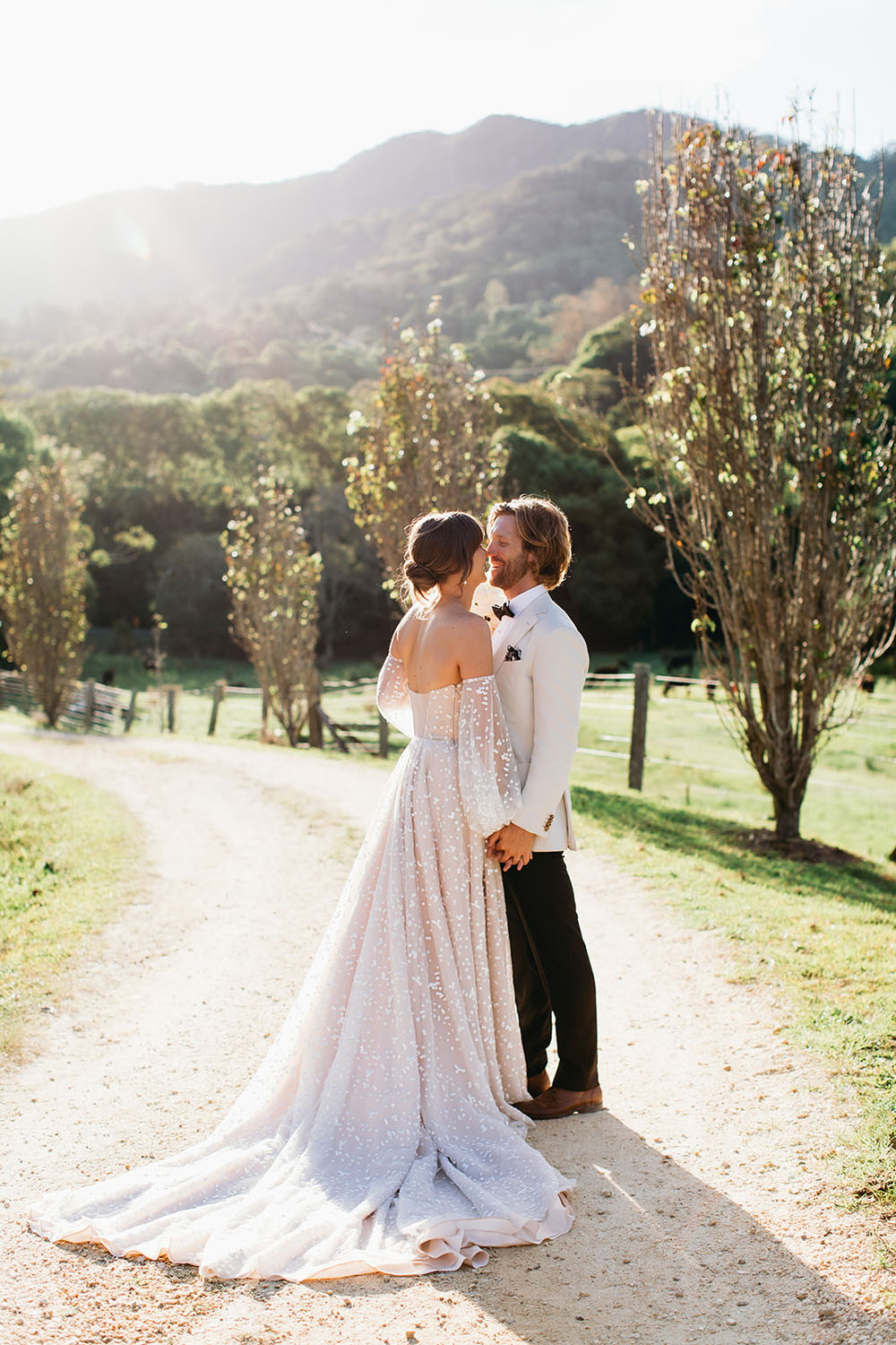 From the bride’s beautiful dotted wedding dress with custom bell sleeves to the bridal party in white to all of the romantic details set against an amazing farm backdrop, we’re swooning over every moment Figtree Pictures captured at Hillview Homestead on the Gold Coast in Australia. Courtney + Paul enlisted Joy Creative Co to bring their all-neutral design to life within the styling, signage, and stationery while Gloriosa Florals channeled the theme with lots of greenery and white blooms. Soak up all the beauty below!