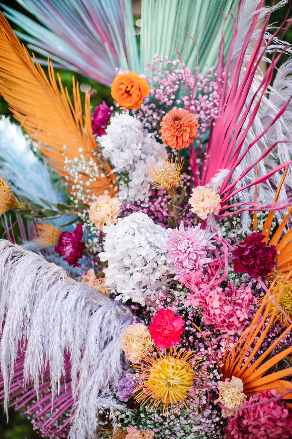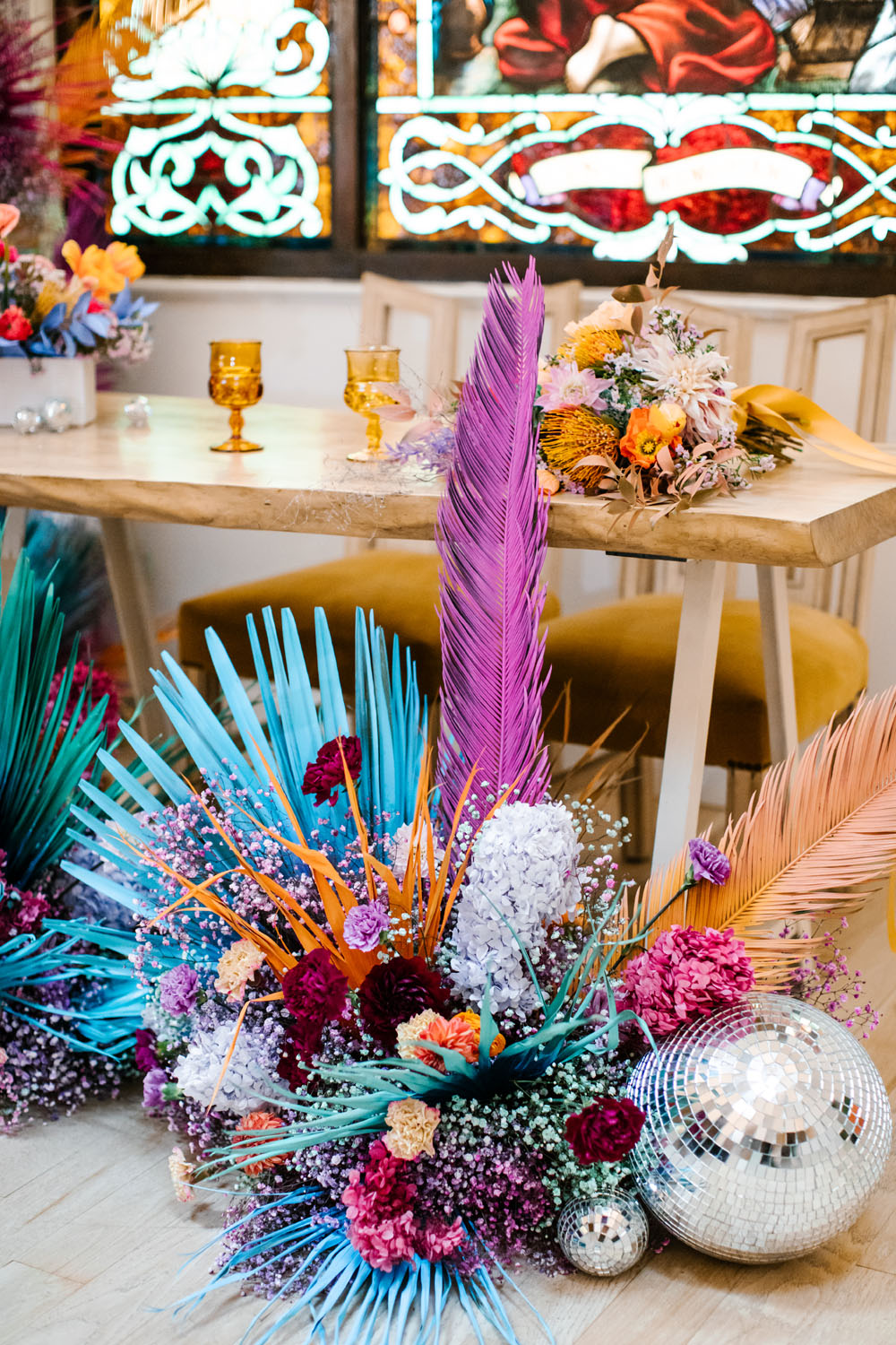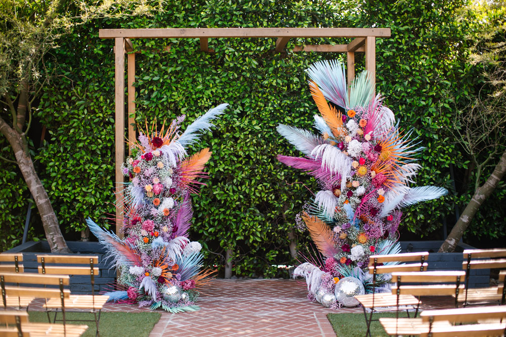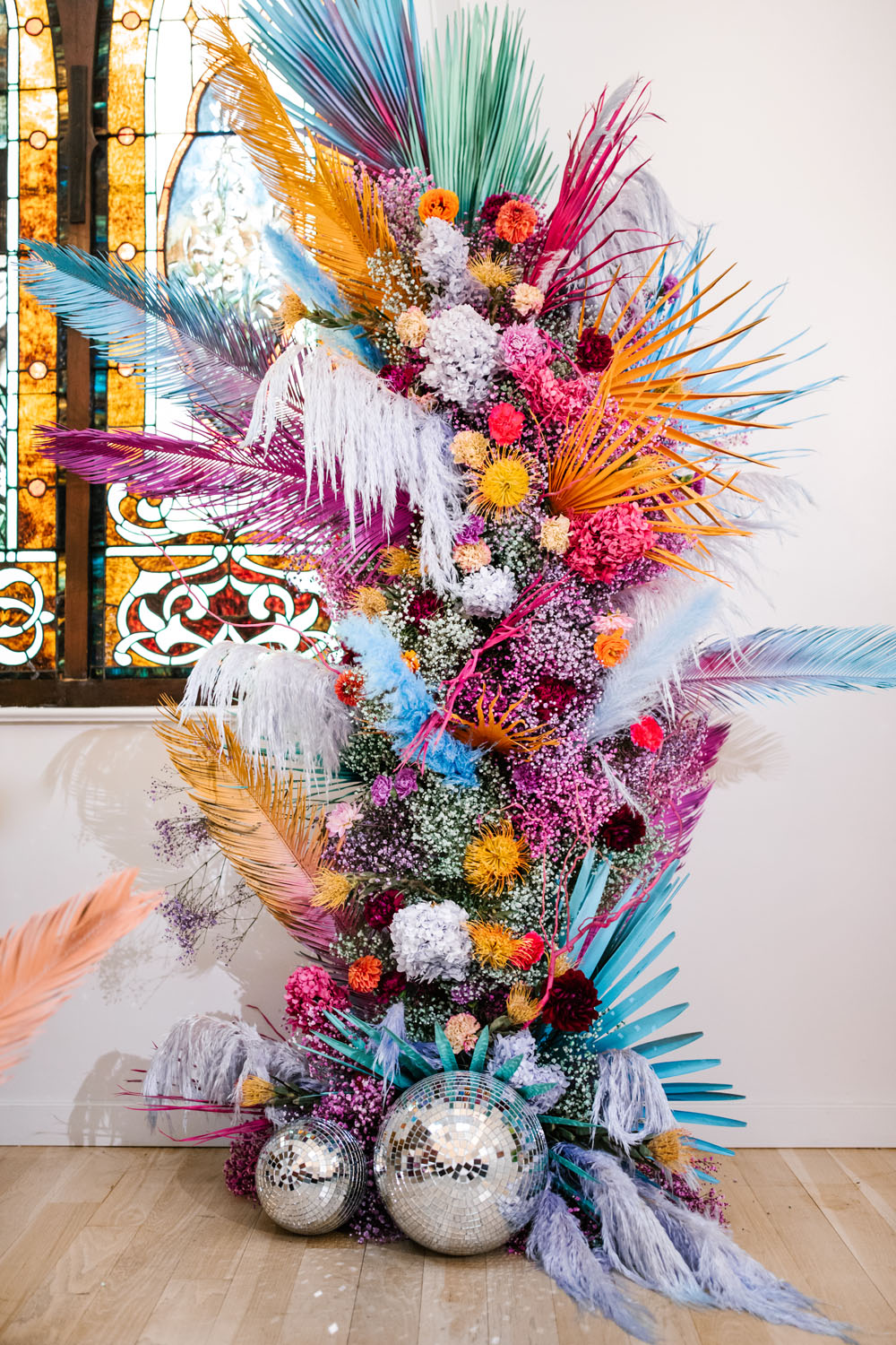 This ceremony arch! Colorful florals, grasses, and disco balls?! Anthurium Untold truly transformed the space.