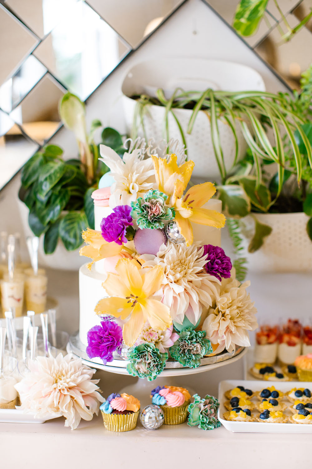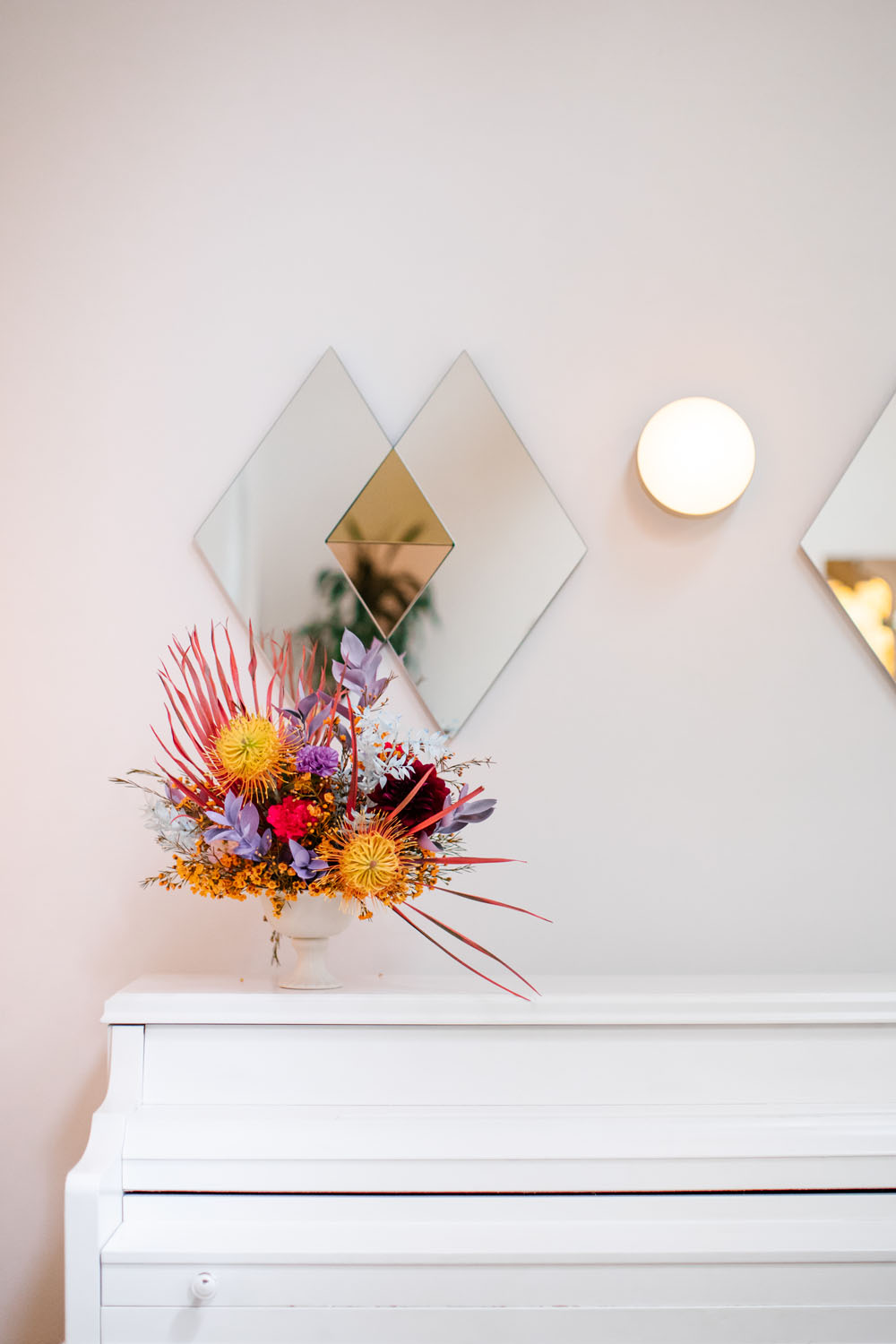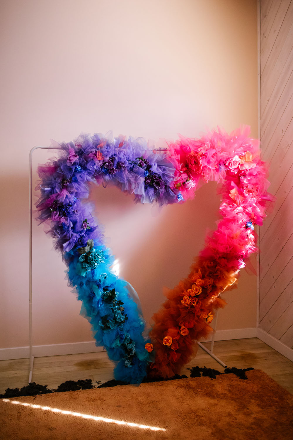 This ceremony arch! Colorful florals, grasses, and disco balls?! Anthurium Untold truly transformed the space.
