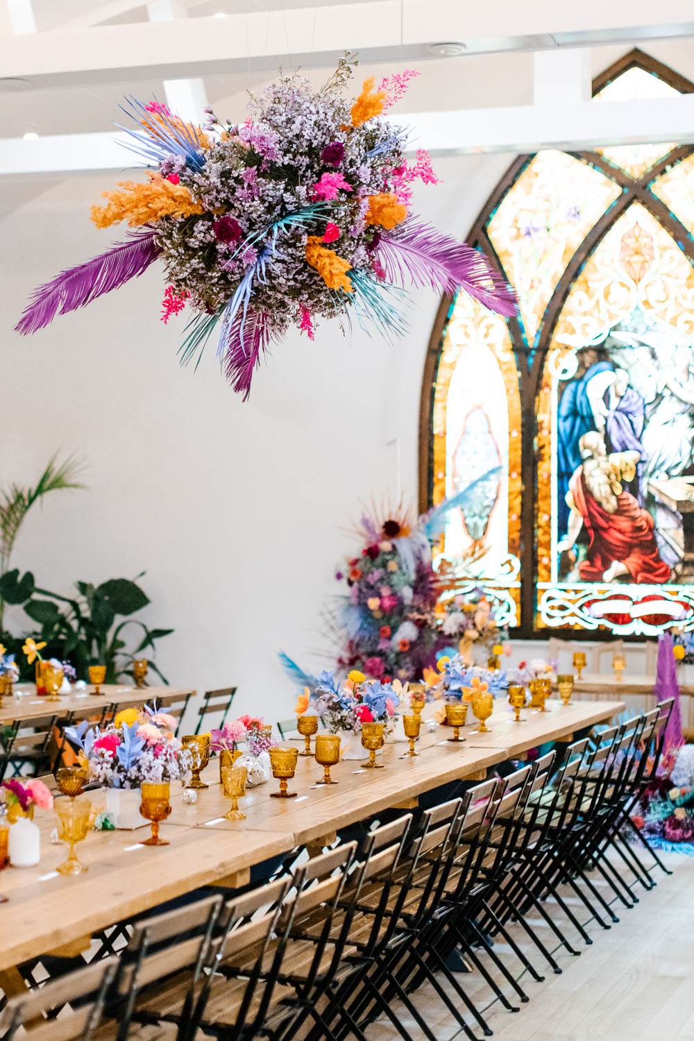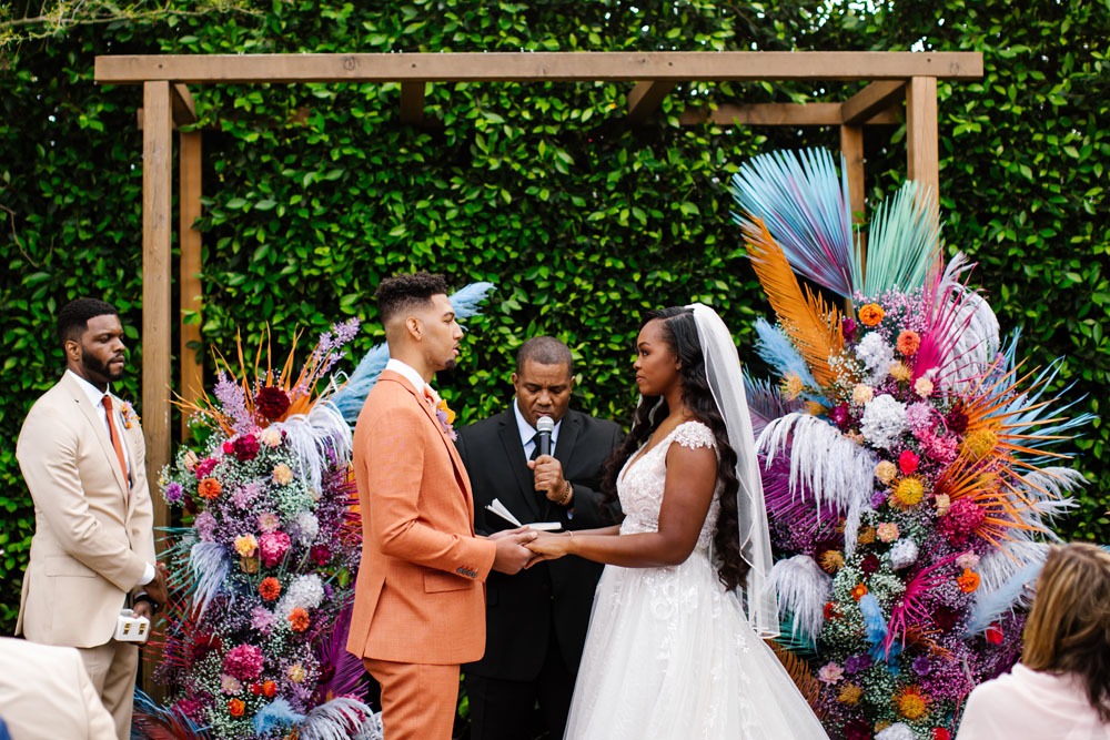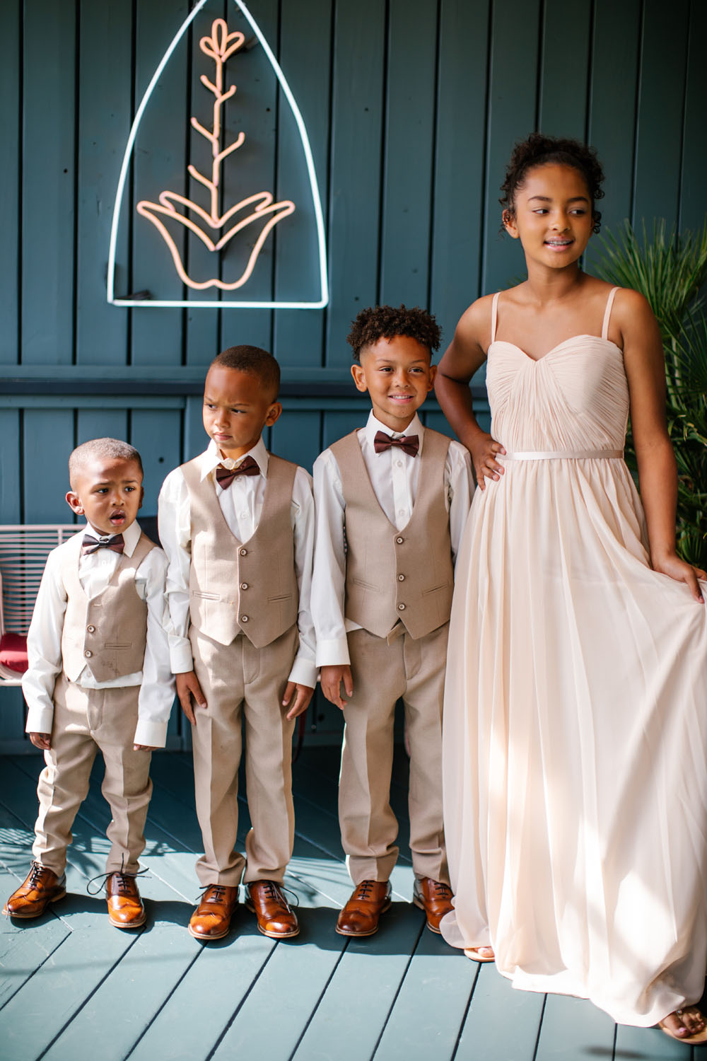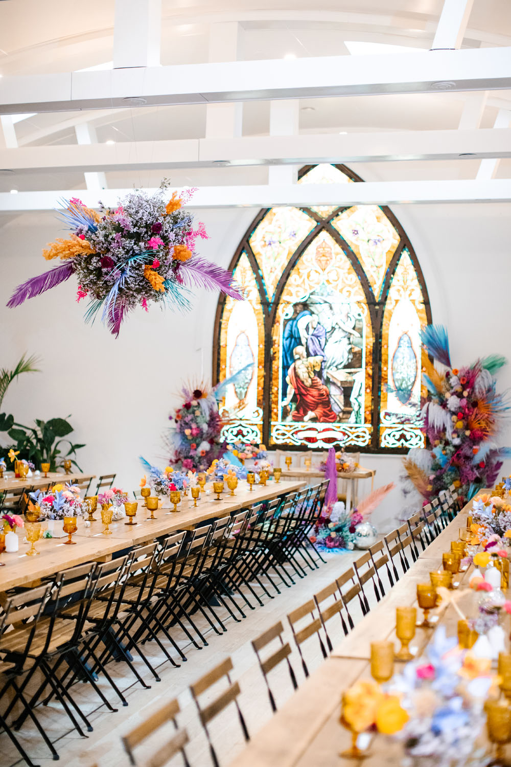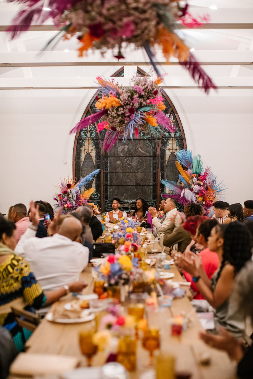 Don’t you love it when couples aren’t afraid to channel bold color in their weddings? The big day is all about celebrating love, so why not make it as cheerful as possible? Sharea and Mikal loved the colorful and modern style of The Ruby Street, especially those gorgeous stained glass windows. It inspired them to highlight the simplicity of its modern style while bringing in a bright, whimsical, and celebratory vibe. With five children celebrating right alongside them, a fun, family-centric event was another high priority. They brought in lots of activities (like a cotton candy cart and caricature artist) for all ages to enjoy, and of course, everyone could appreciate the stylish details throughout. Anna Zajac Weddings was behind the lens and Kindred Weddings & Events helped them bring it all together.