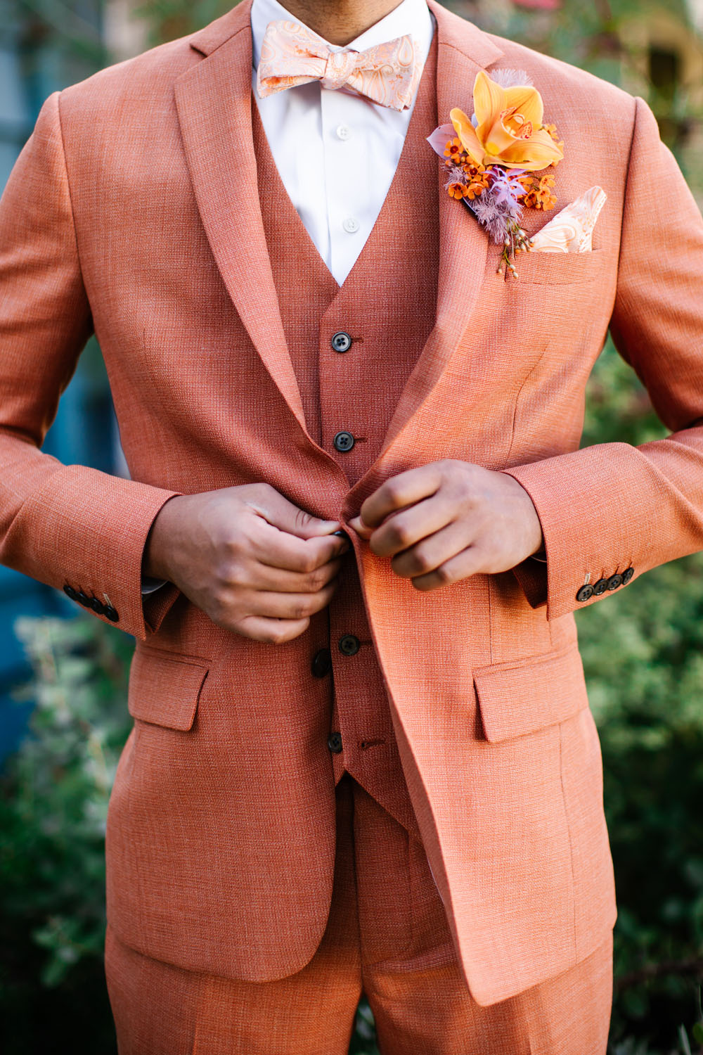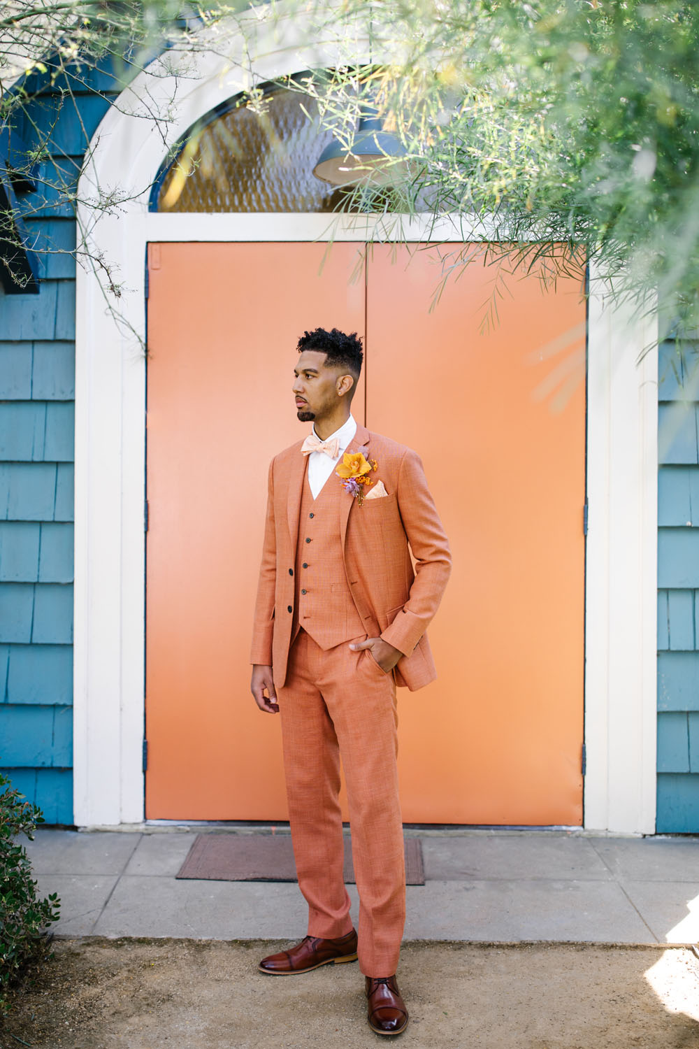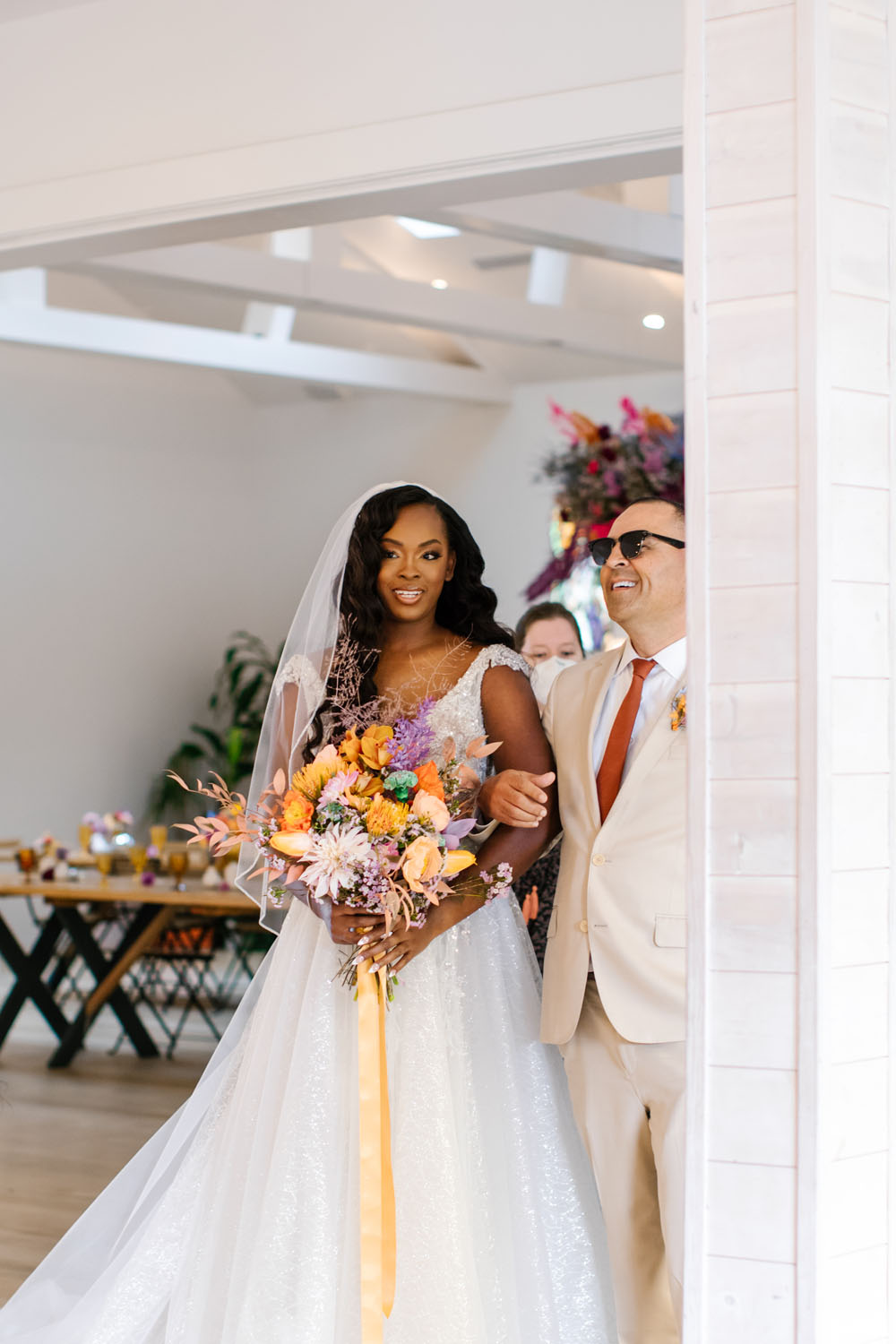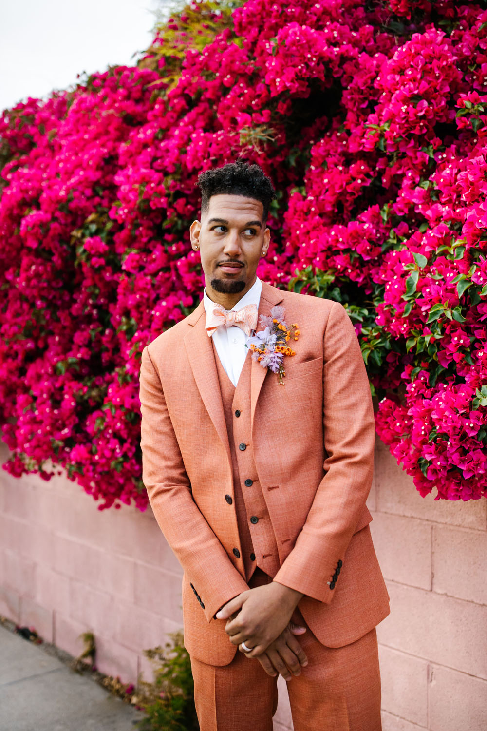 The bougainvillea backdrop sure fits perfectly with the colorful vibe, huh? This first look is so cute!