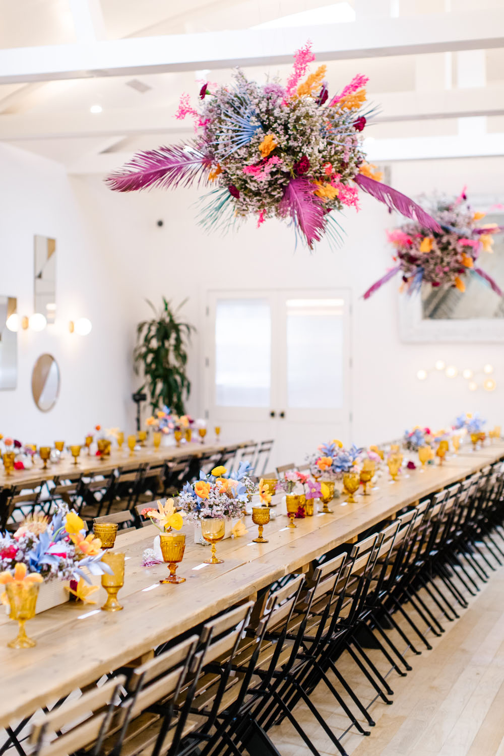For the reception, they brought in the bold colors and textures we saw in the ceremony, but kept the tables more minimal to really blend with the modern, airy space.