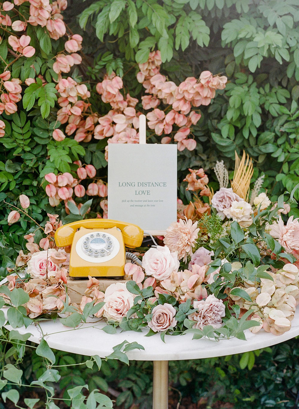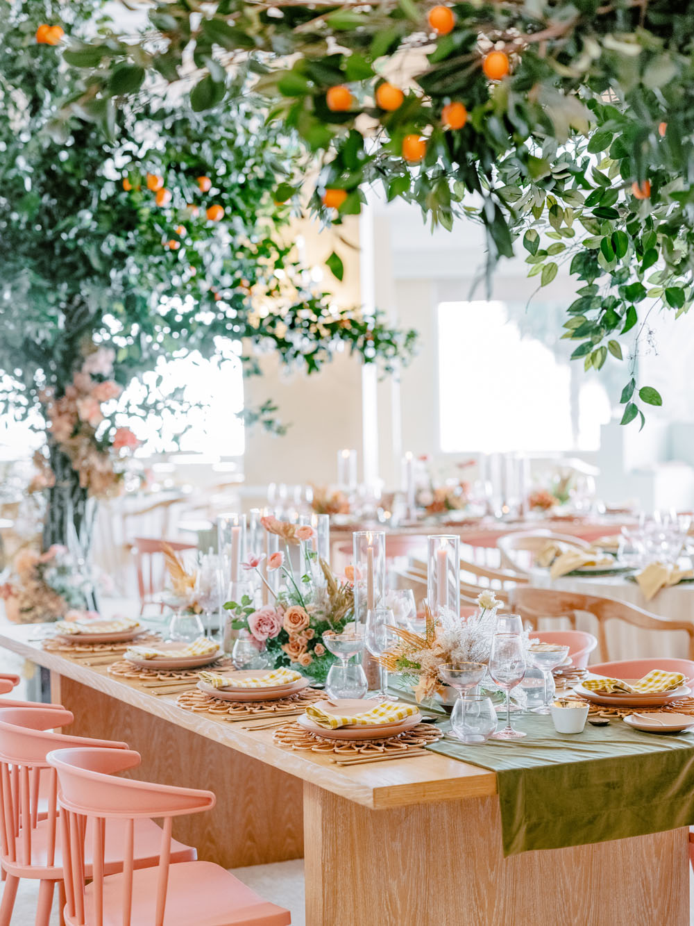 Blush plates and glassware were paired with brighter pinks and yellows for a cheerful palette perfect for a San Diego wedding.