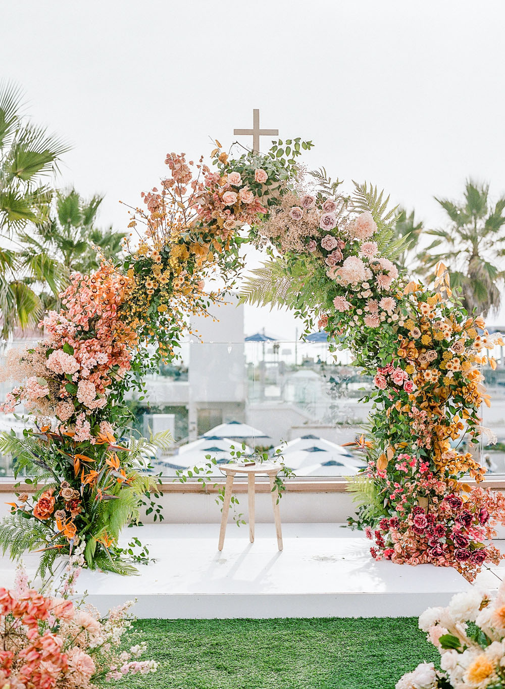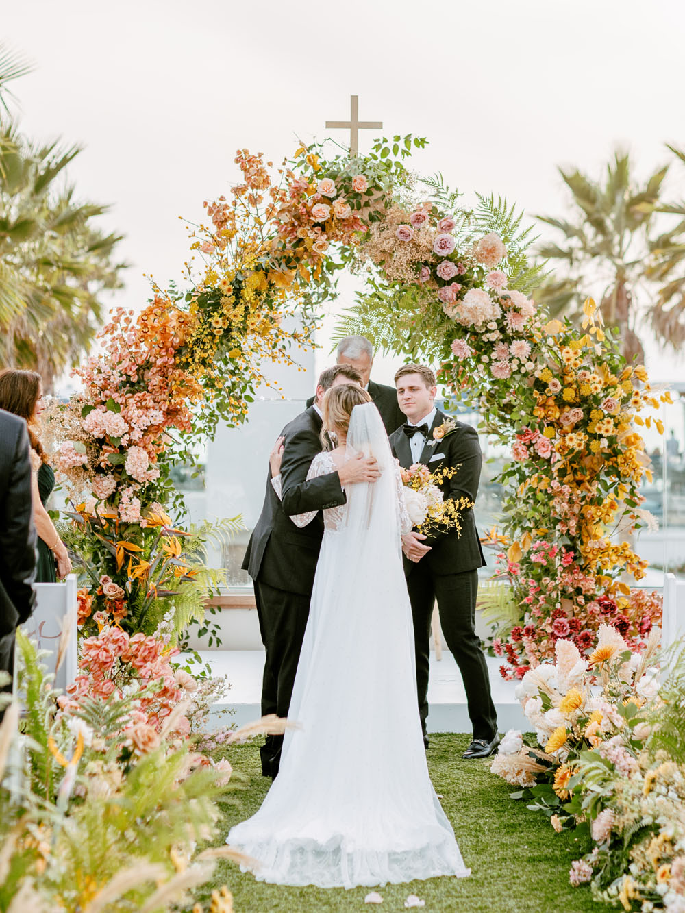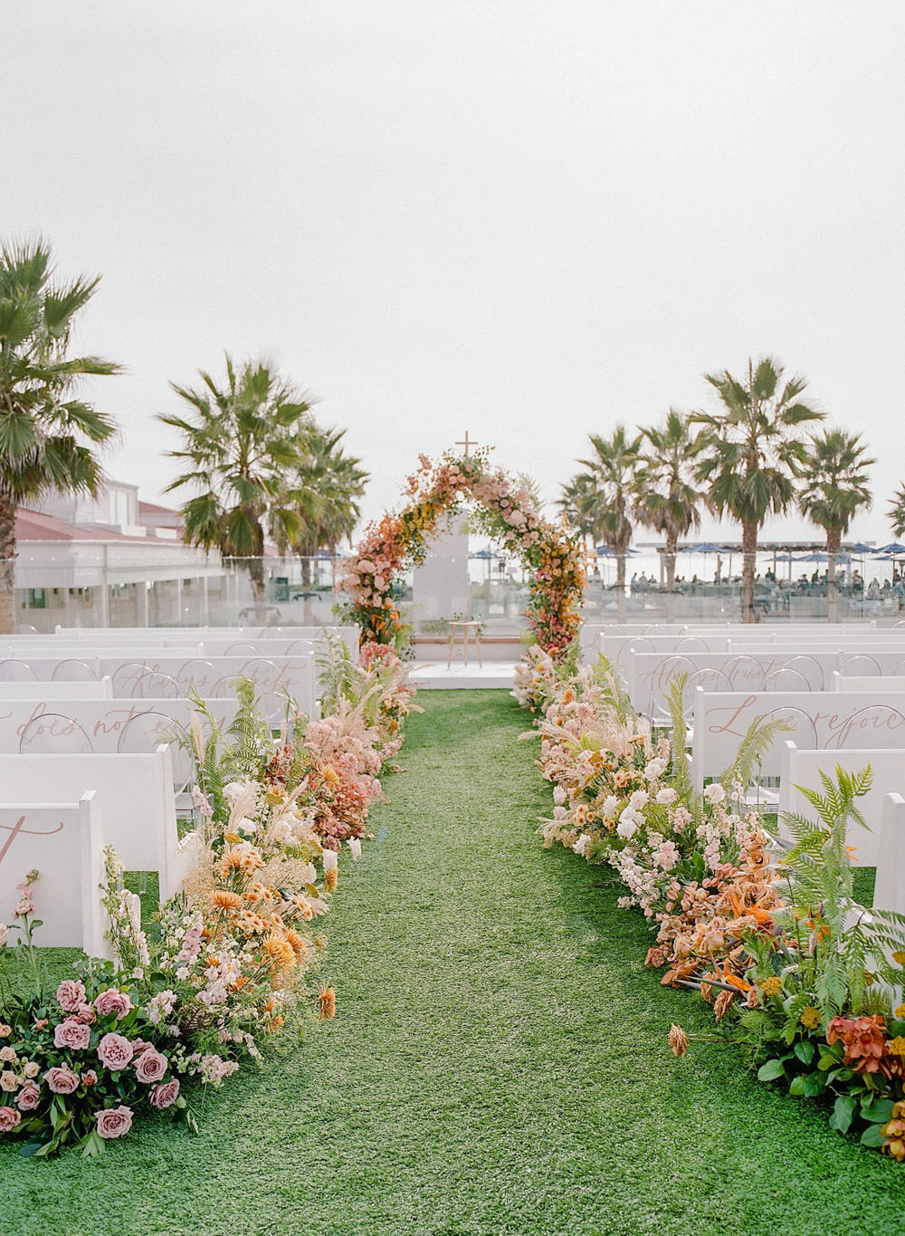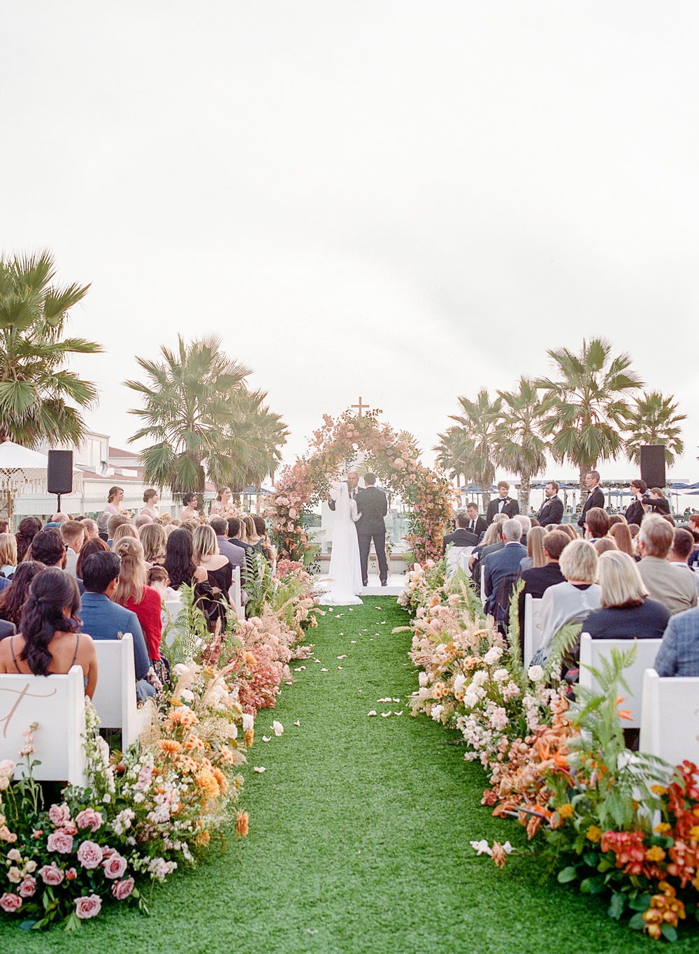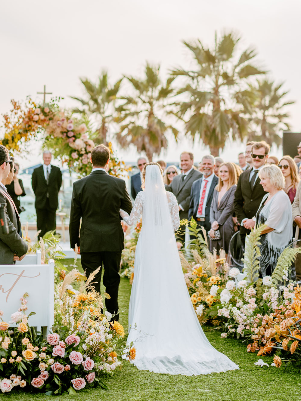 These ceremony florals!!! Wow wow wow. Native Poppy incorporated the couple’s muted rainbow palette with a gradient of blooms at the altar and lining the aisle at Hotel Del Coronado.