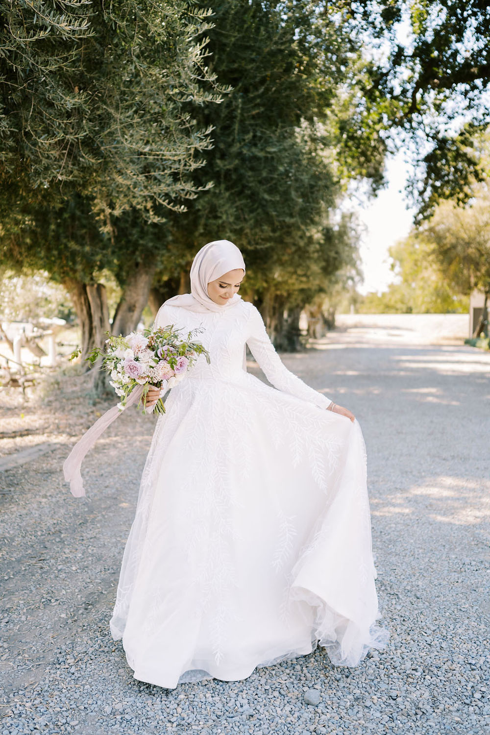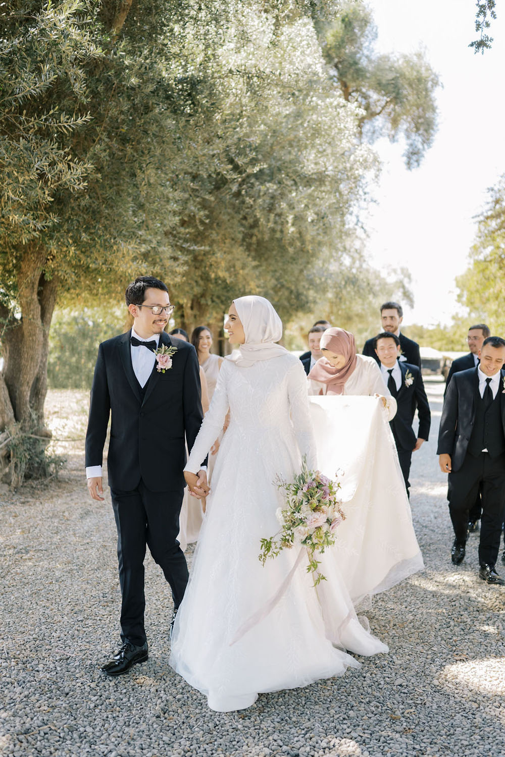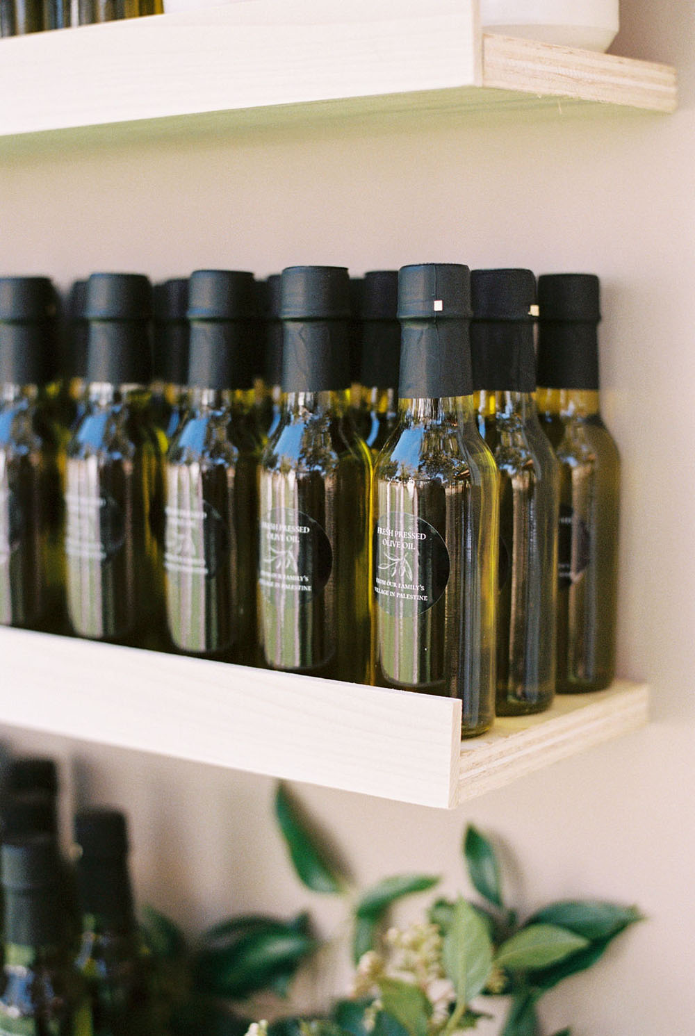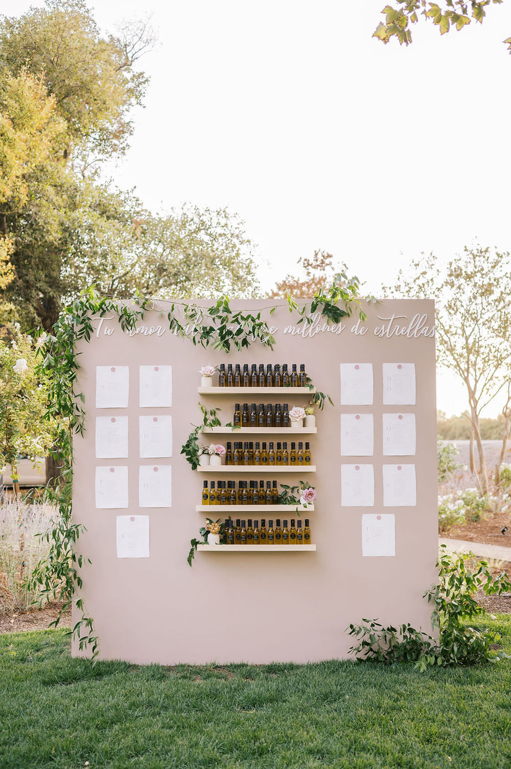 Kristina explains, The bride placed a high importance on sharing her Palestinian culture through the symbol of the olive branch. This small yet significant detail was found embroidered on her custom dress, found on the invitations, and used in their personalized wax stamps and signage. The boutonnieres and bouquets included small olives to tie into the theme. And their venue even aligned with this vision as the driveway leading up to the property is eloquently lined in olive trees. Lastly, the favors they chose to gift was a bottle of olive oil—each one packaged and shipped from her grandmother’s olive grove in Palestine. These bottles were displayed on a stunning escort chart adorned with greenery and a romantic Spanish phrase giving nod to the groom’s Hispanic culture.