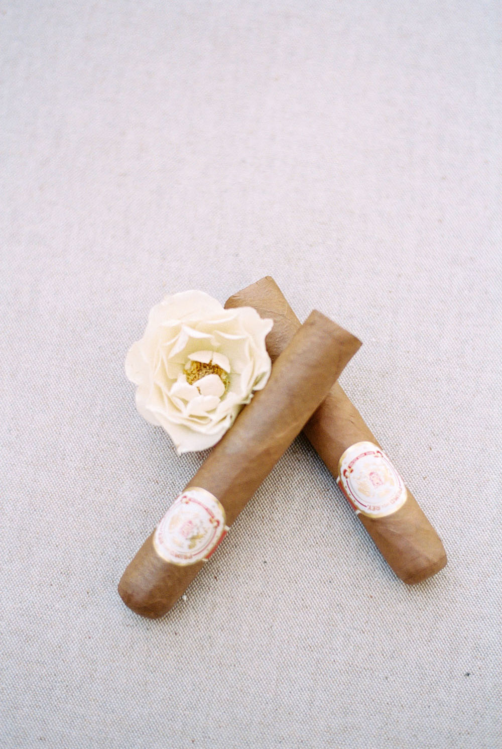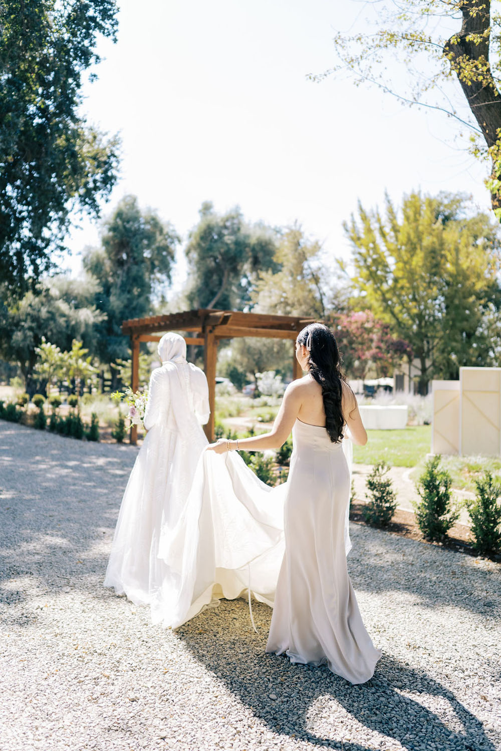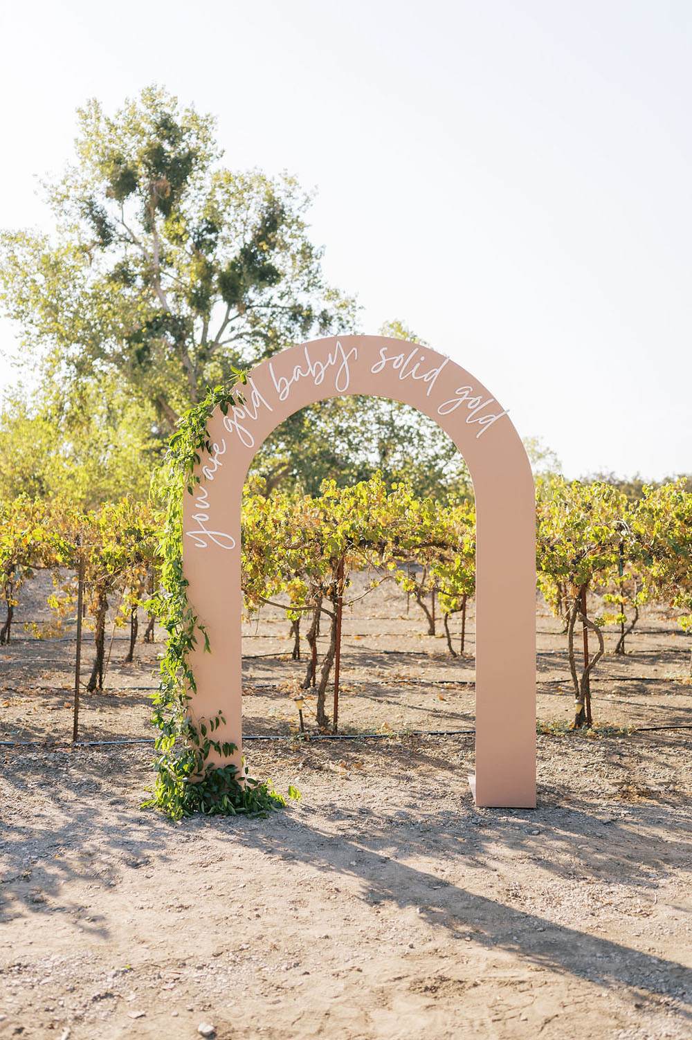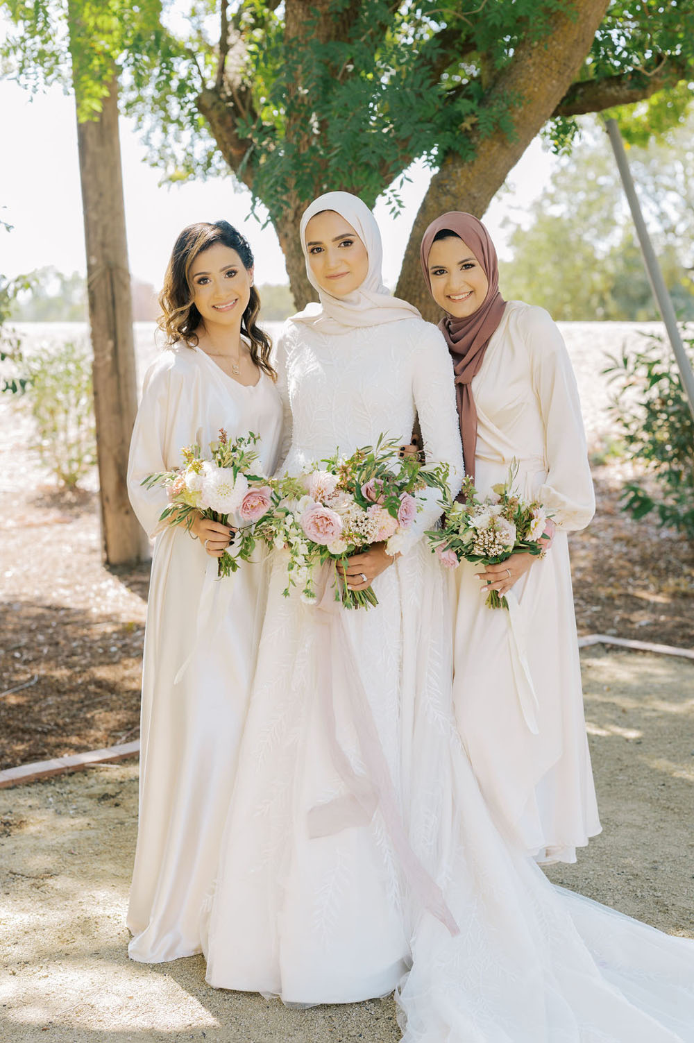 Kristina explains, The bride placed a high importance on sharing her Palestinian culture through the symbol of the olive branch. This small yet significant detail was found embroidered on her custom dress, found on the invitations, and used in their personalized wax stamps and signage. The boutonnieres and bouquets included small olives to tie into the theme. And their venue even aligned with this vision as the driveway leading up to the property is eloquently lined in olive trees. Lastly, the favors they chose to gift was a bottle of olive oil—each one packaged and shipped from her grandmother’s olive grove in Palestine. These bottles were displayed on a stunning escort chart adorned with greenery and a romantic Spanish phrase giving nod to the groom’s Hispanic culture.