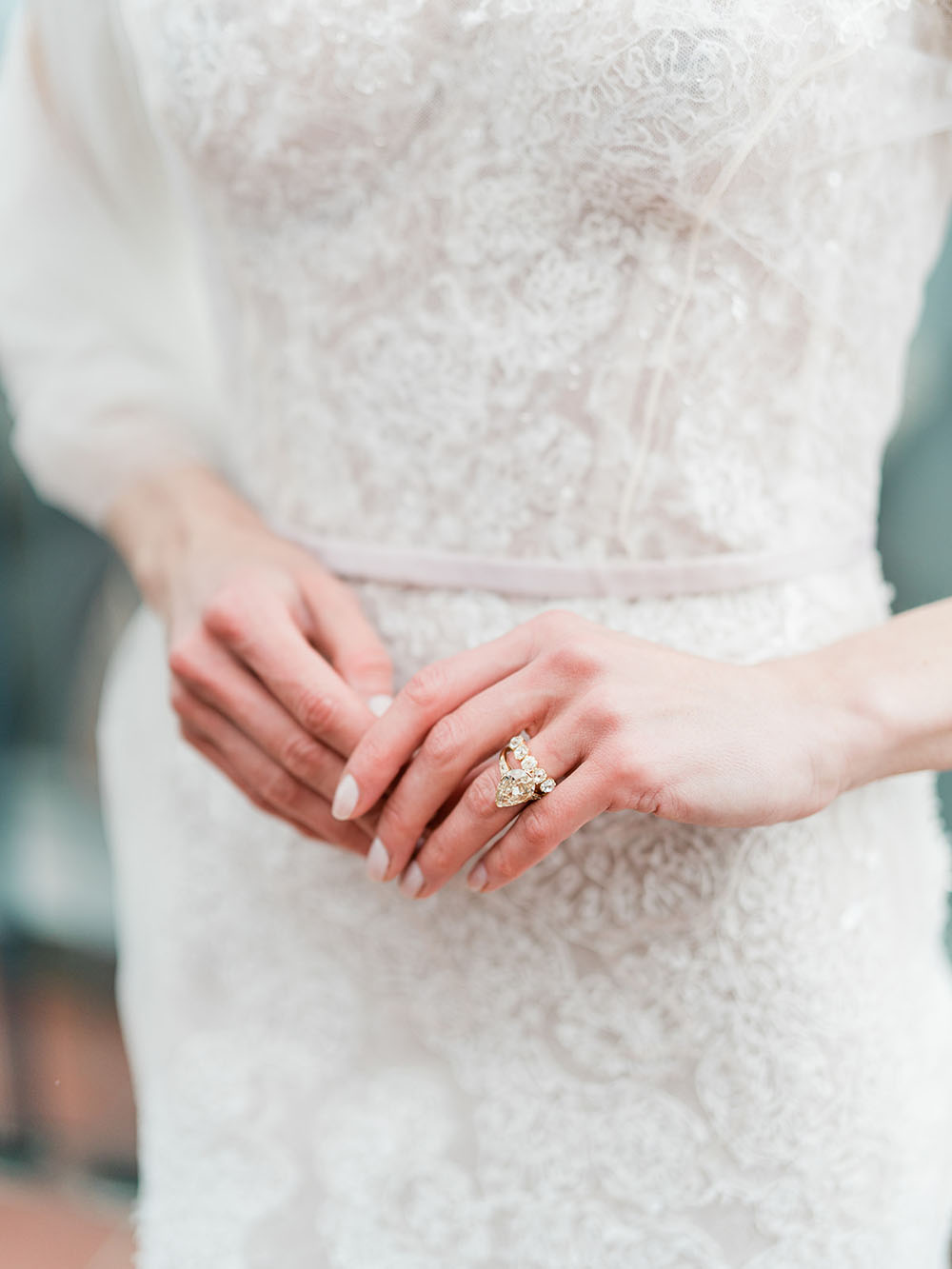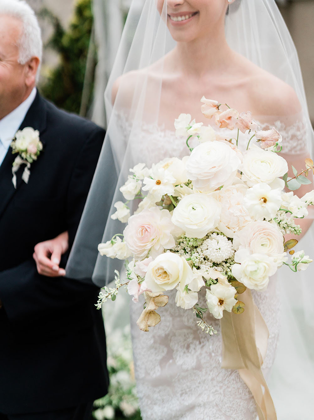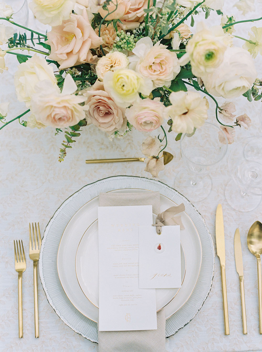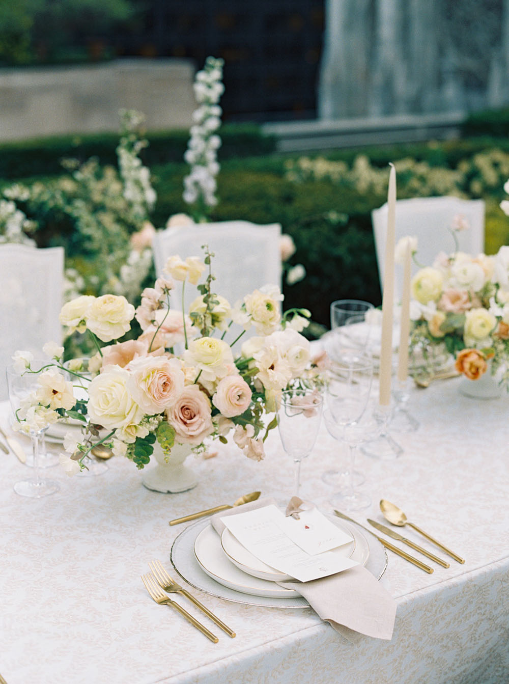 From the team… Inspired by the color tones of the iconic St. Patrick’s Cathedral, we created an intimate, luxurious wedding design at 620 Loft and Garden that combined a spring English garden with the chic, couture vibe of NYC. While using the more neutral/gray palette as our base, we added warmth and texture to the design with gold, soft blushes, textured tablecloths, and an organic floral design.