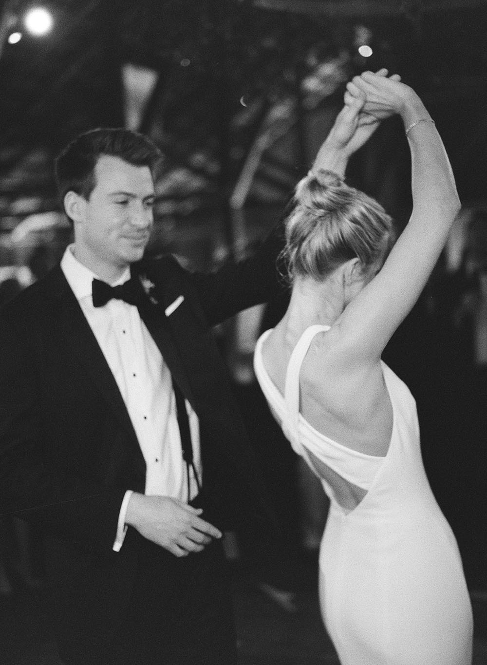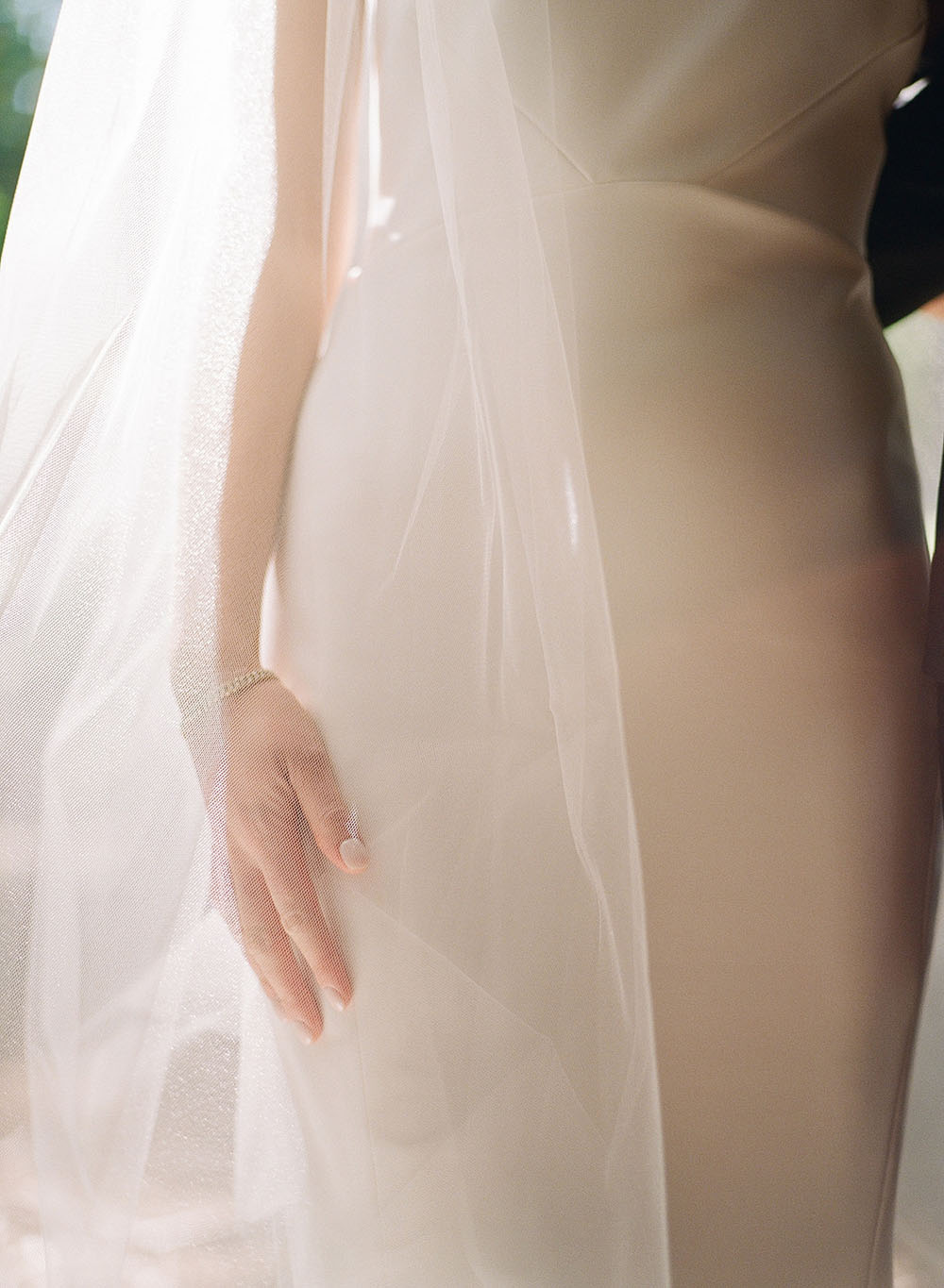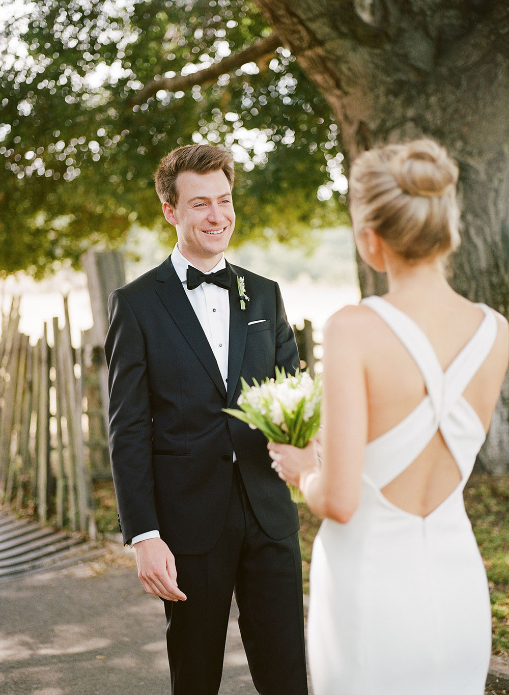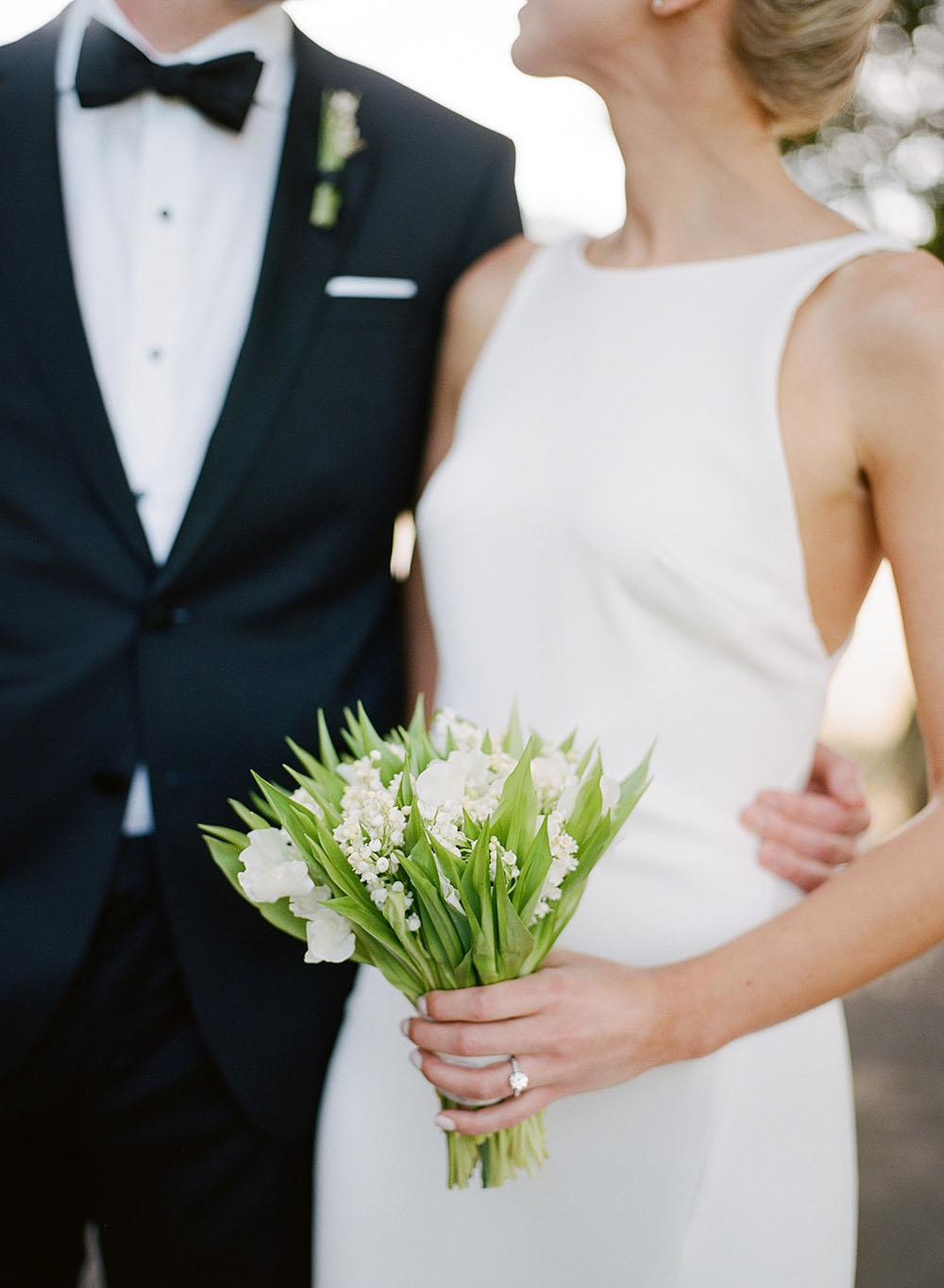 The bride chose a sleek, classic wedding dress to channel the understated elegance of the day.