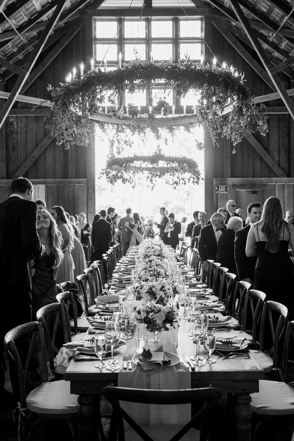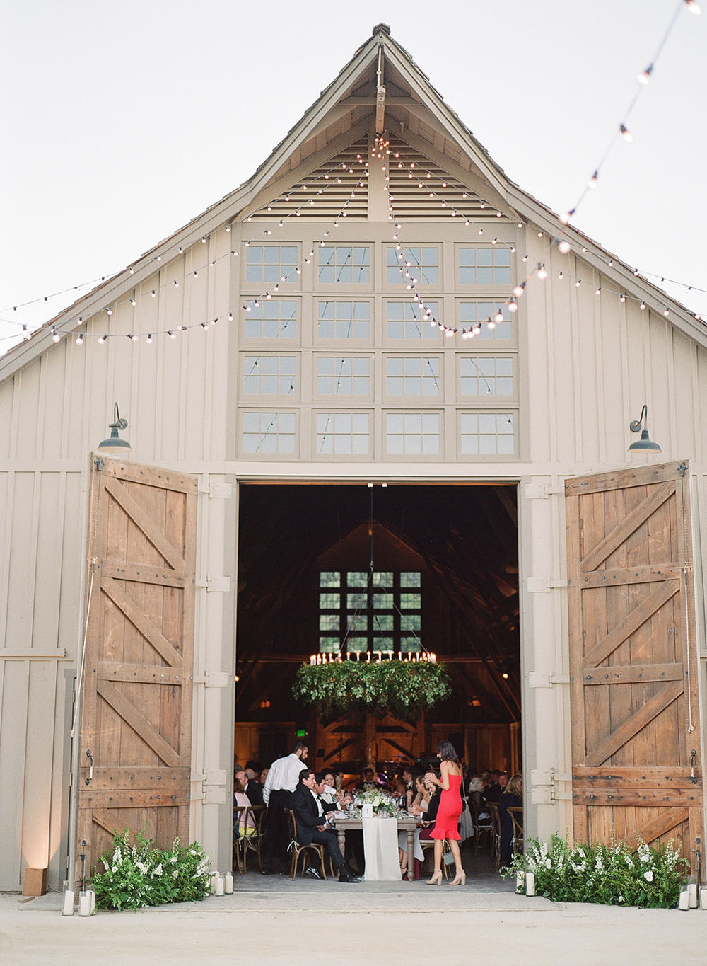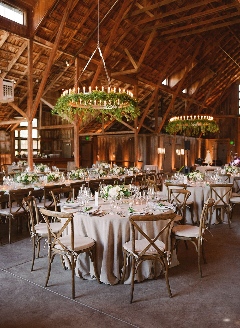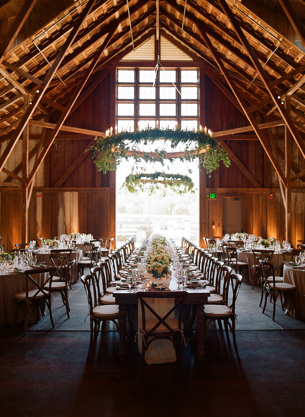 For dinner and dancing, the couple and their guests entered the gorgeous barn space, the tall ceilings referencing the tall redwoods, all filled with garden inspired arrangements and greenery hanging from the chandeliers.