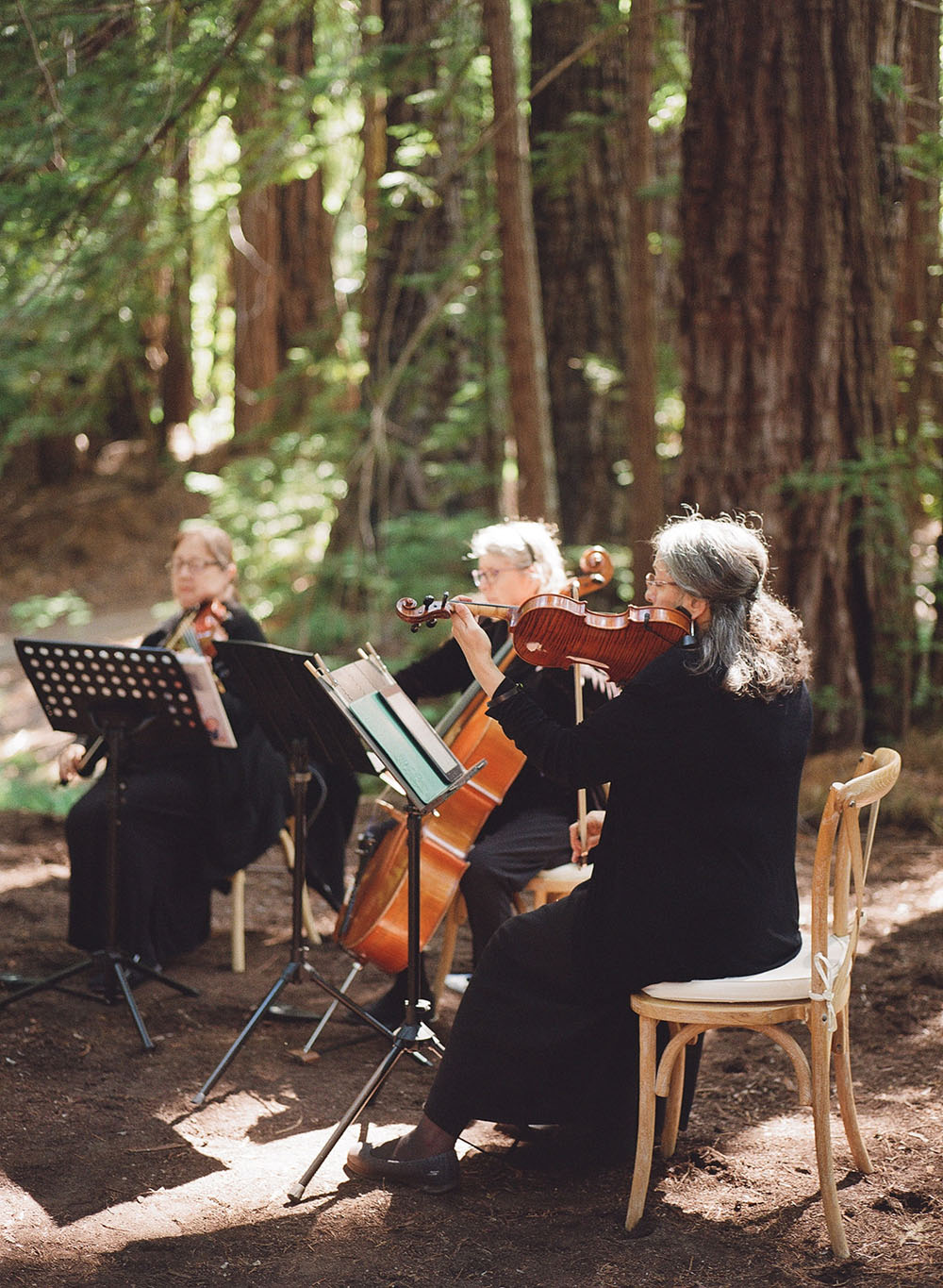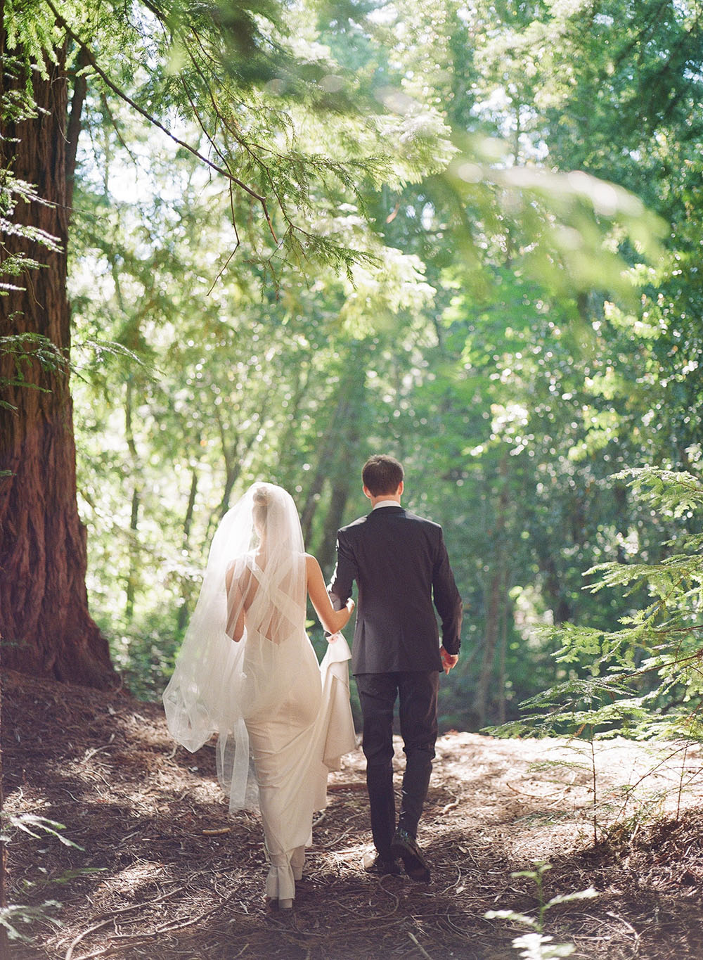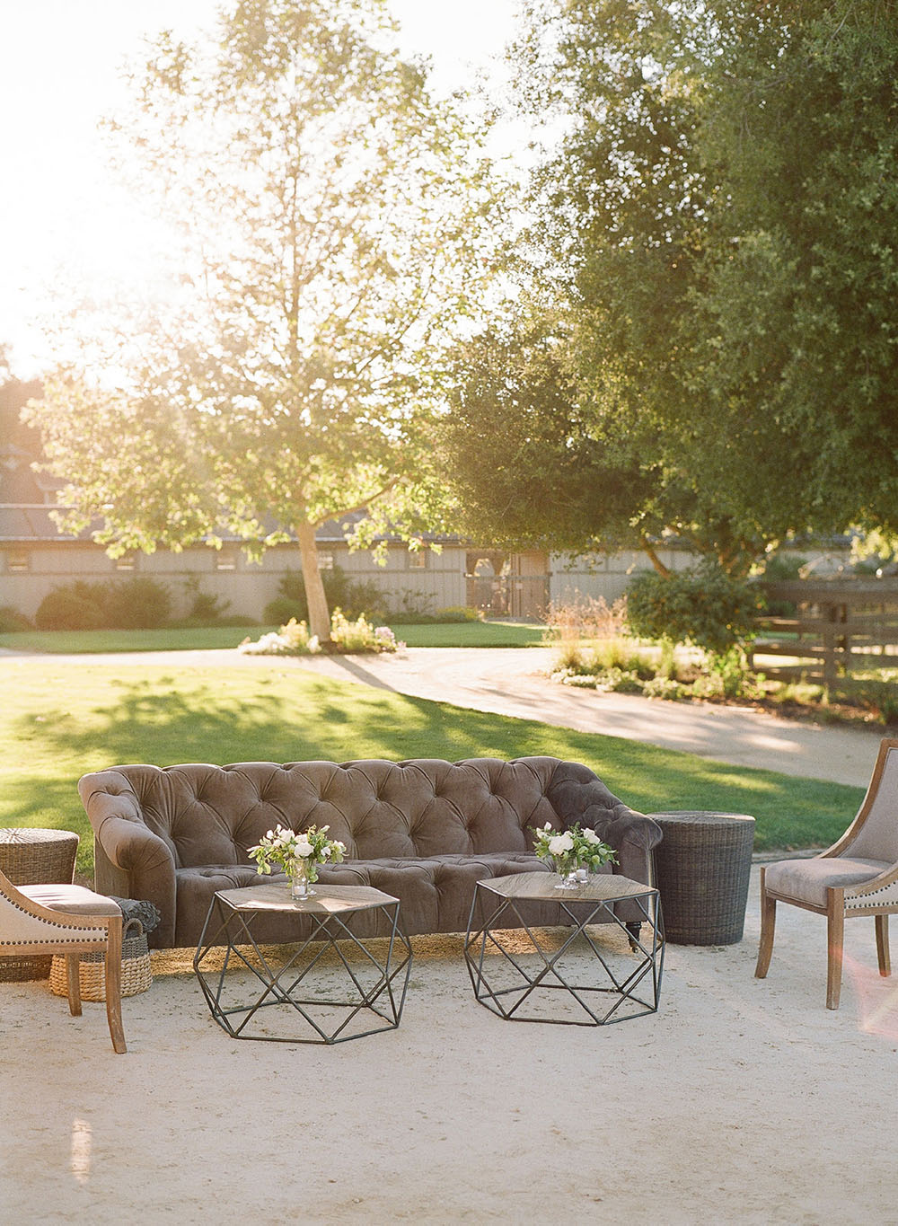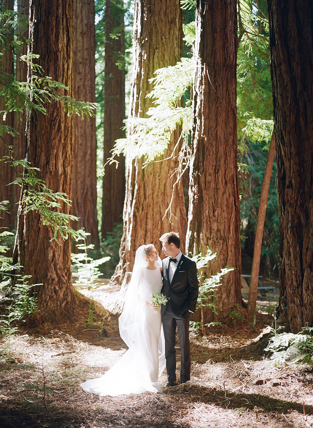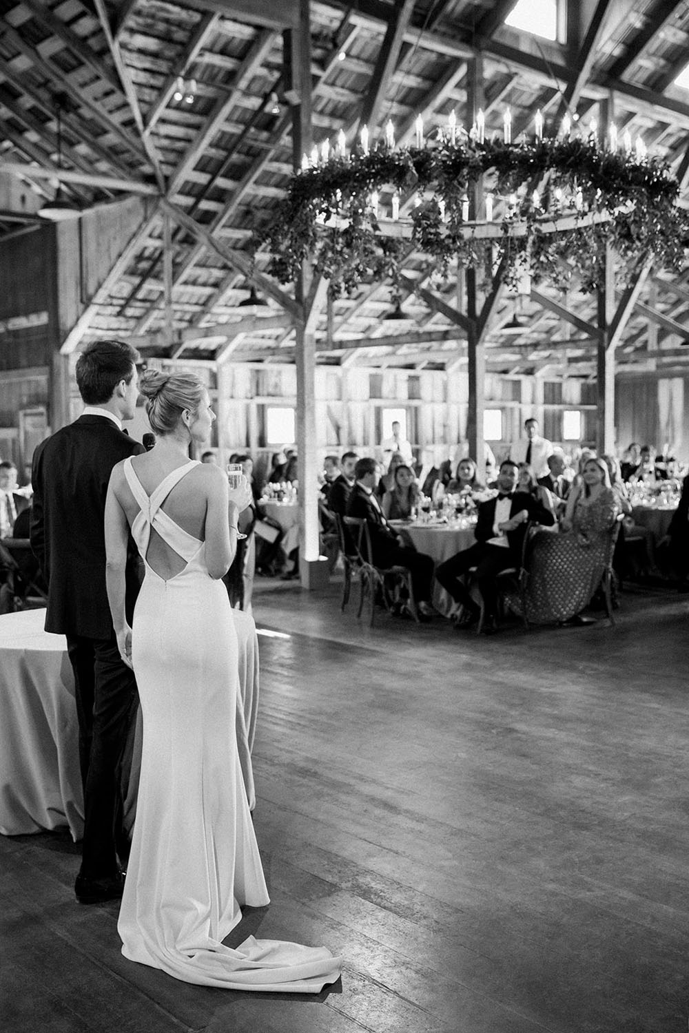 For dinner and dancing, the couple and their guests entered the gorgeous barn space, the tall ceilings referencing the tall redwoods, all filled with garden inspired arrangements and greenery hanging from the chandeliers.