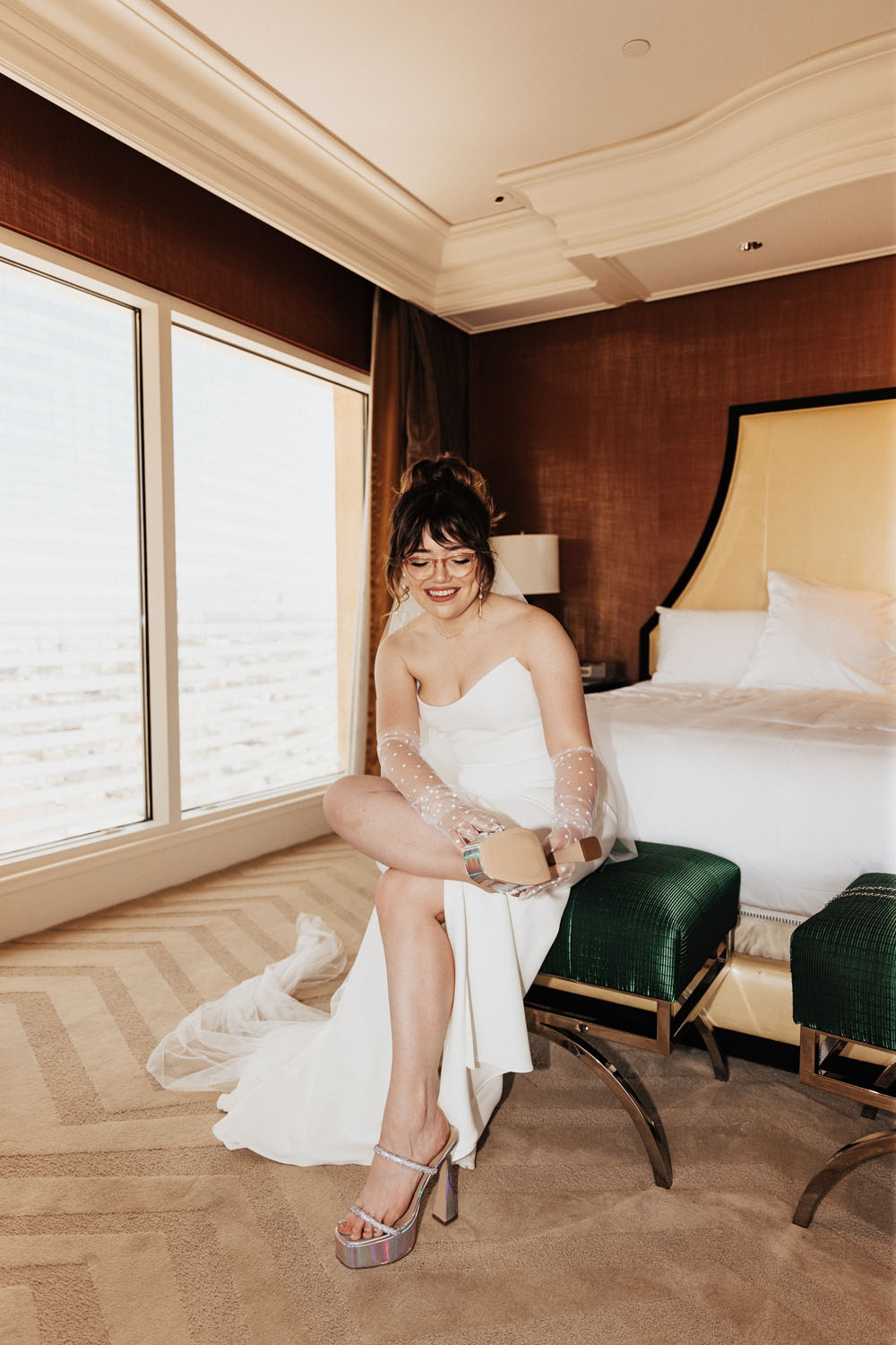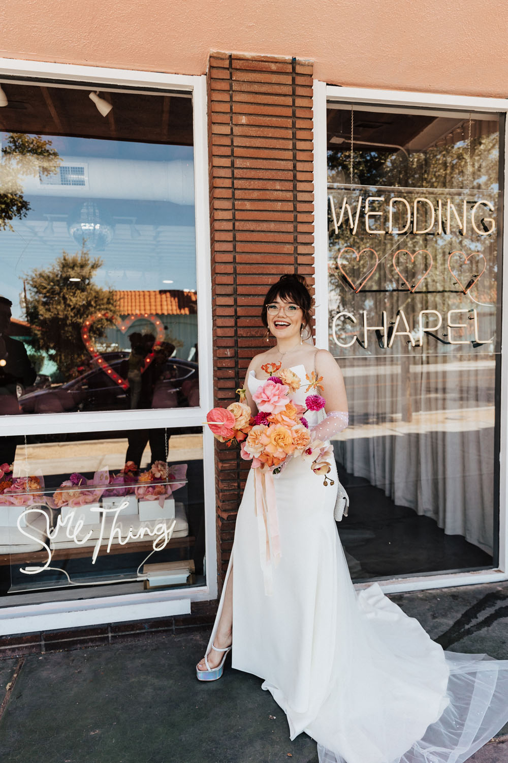 Photography: Erin Roberts Photography | Florals: Lucid Juliet | Venue: Sure Thing Chapel | Female Elvis: Heidi Reider | Surely the Elephant Showgirl: Victoria Hogan | Bride’s Dress, Veil & Gloves: Sarah Seven |Videographer/Super8: Amy Lee | Hair & Makeup: Emily Rae Amaya-Laveau | Bride’s Shoes: Steve Madden