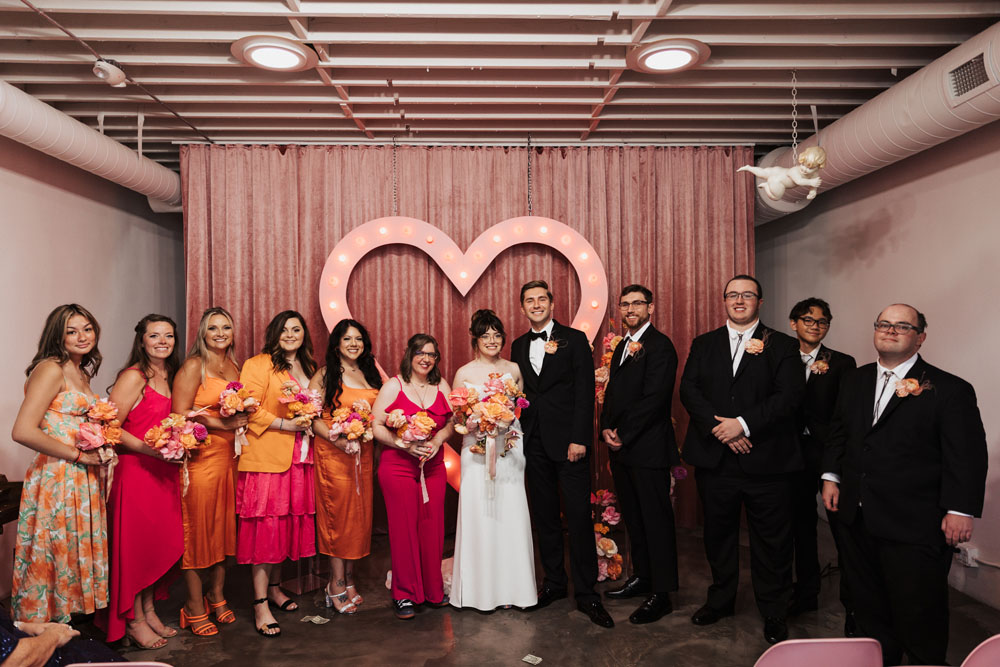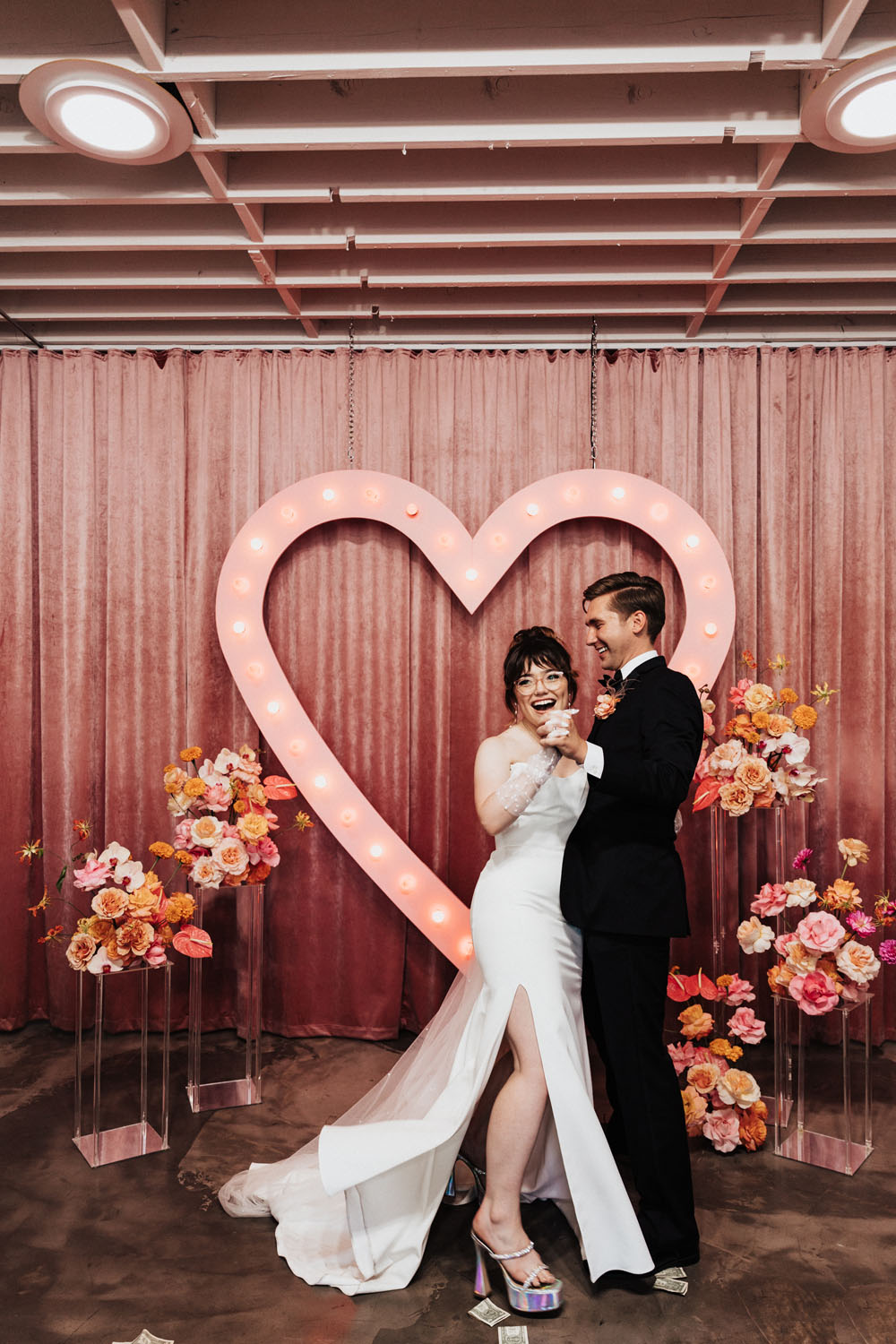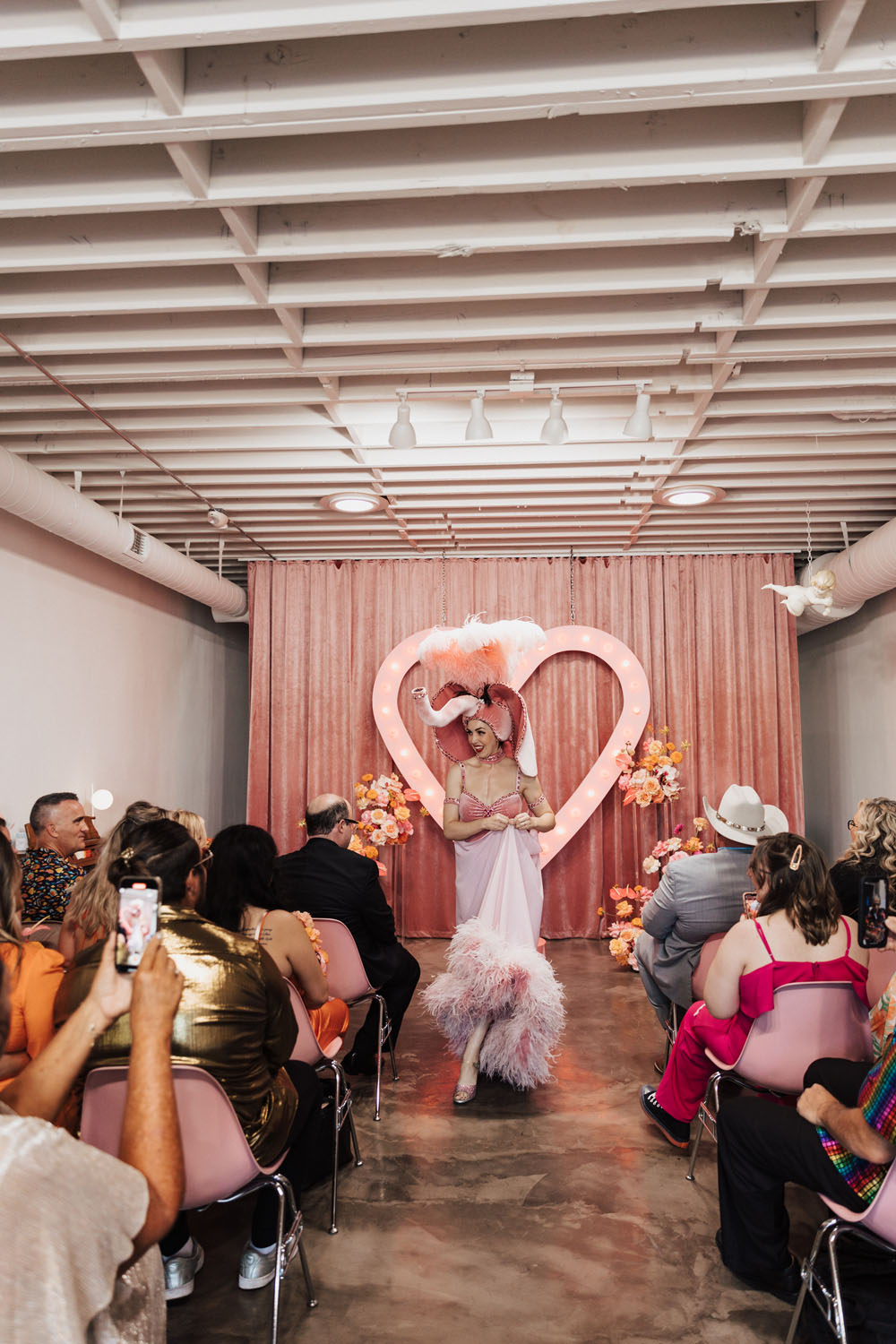 The couple explains, Our ceremony at Sure Thing Wedding Chapel had everything we could ask for and more. We laughed and we cried as Elvis was guiding us through our vows, and it was so perfectly us. It had our pink and orange colors with our florals and backdrop. We loved seeing our guests taking inspiration from our groovy Vegas glam western cowboy suggested attire.