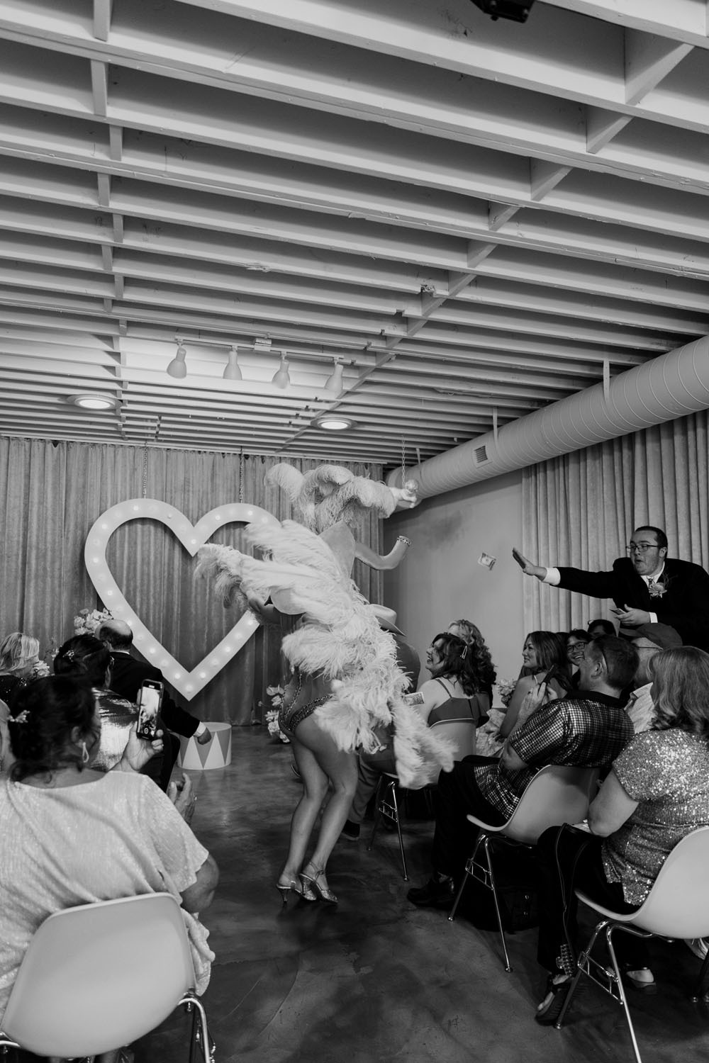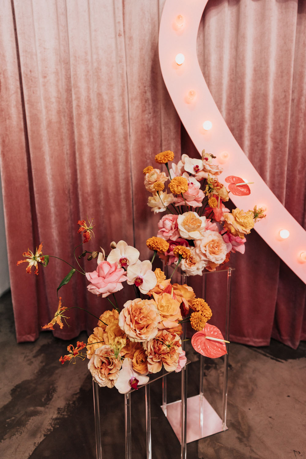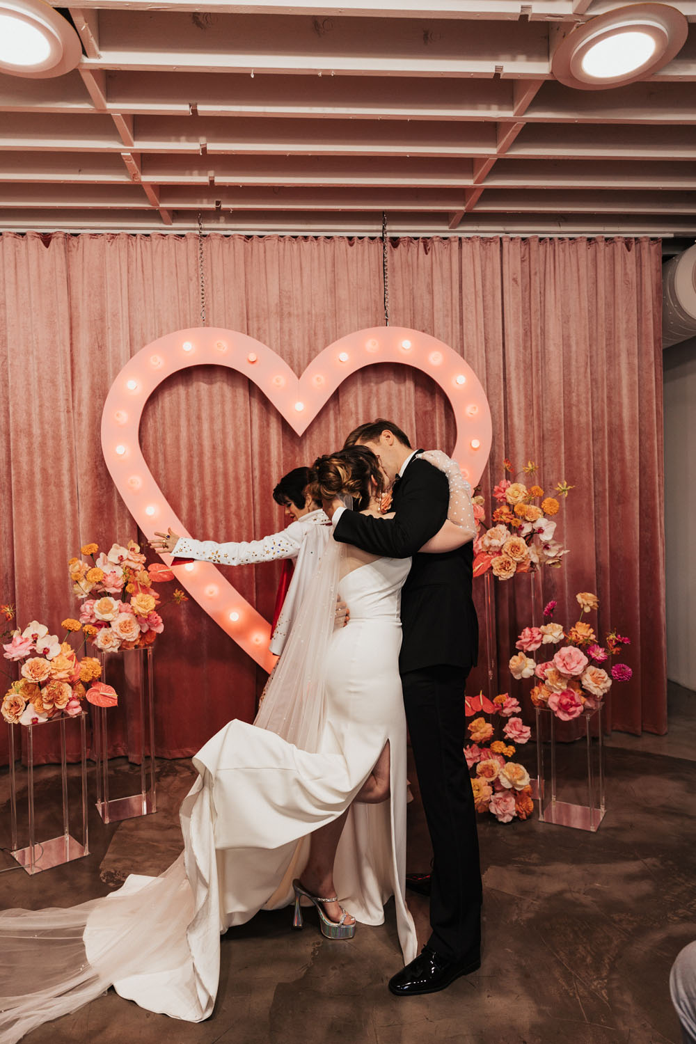 The couple explains, Our ceremony at Sure Thing Wedding Chapel had everything we could ask for and more. We laughed and we cried as Elvis was guiding us through our vows, and it was so perfectly us. It had our pink and orange colors with our florals and backdrop. We loved seeing our guests taking inspiration from our groovy Vegas glam western cowboy suggested attire.