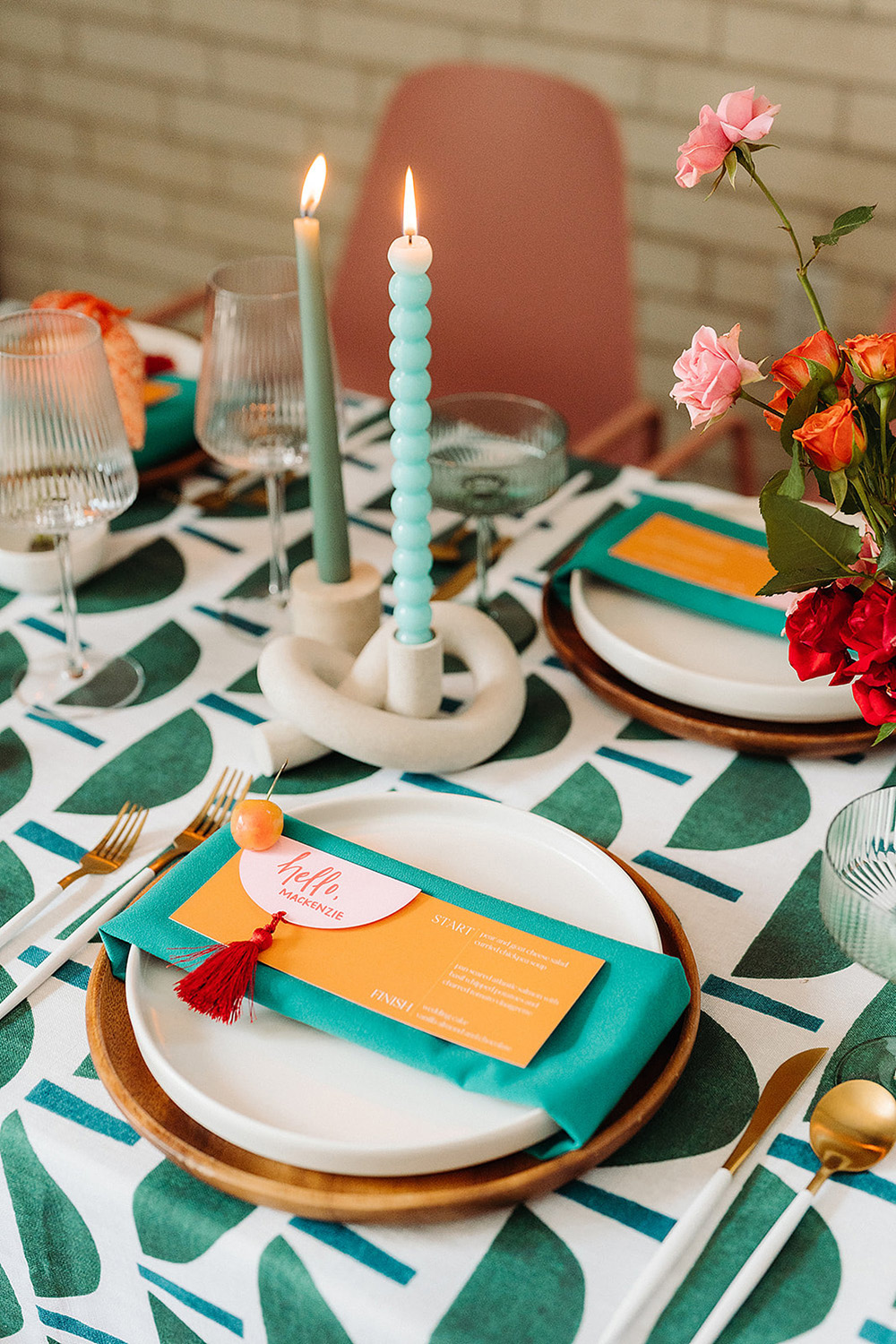 The guest table spreads are filled with odd shapes, bold colors, and mixed textures. While it was so much fun bringing color into the design, it was important to bring in a touch of masculinity; queue the wooden chargers and cement candlesticks. Table Manners provided an excellent variety of flatware, plateware, and glassware and BBJ Tavola tied it all together with the half-moon patterned linens and bold peacock-green napkins.