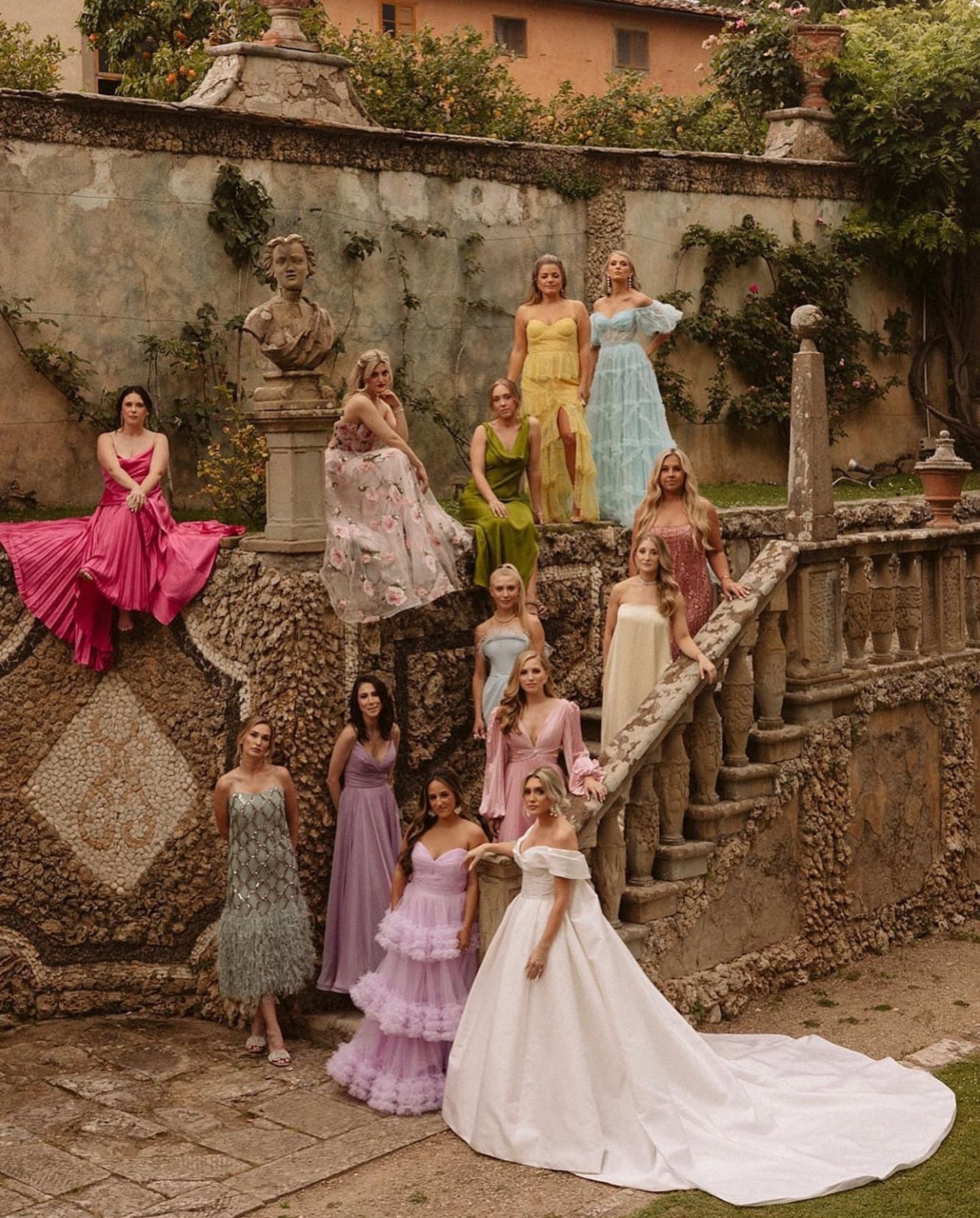 …Like this colorful spring bridal party anchored in different shades of pink.