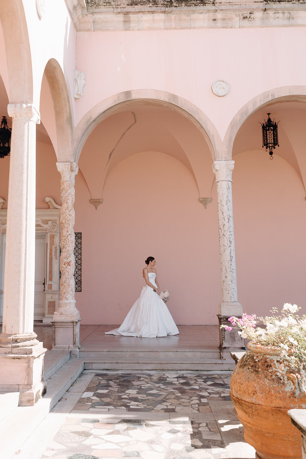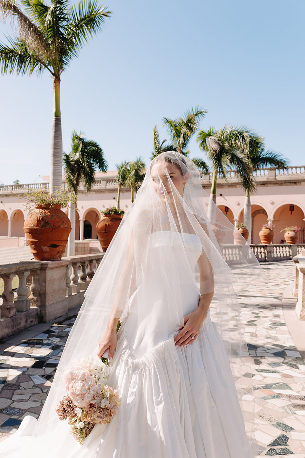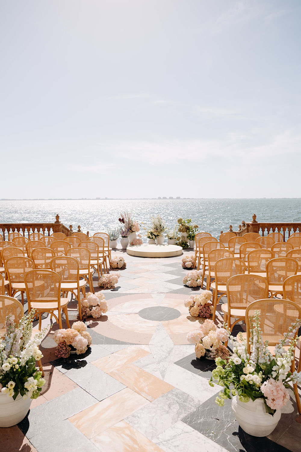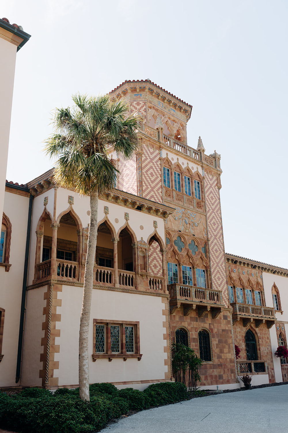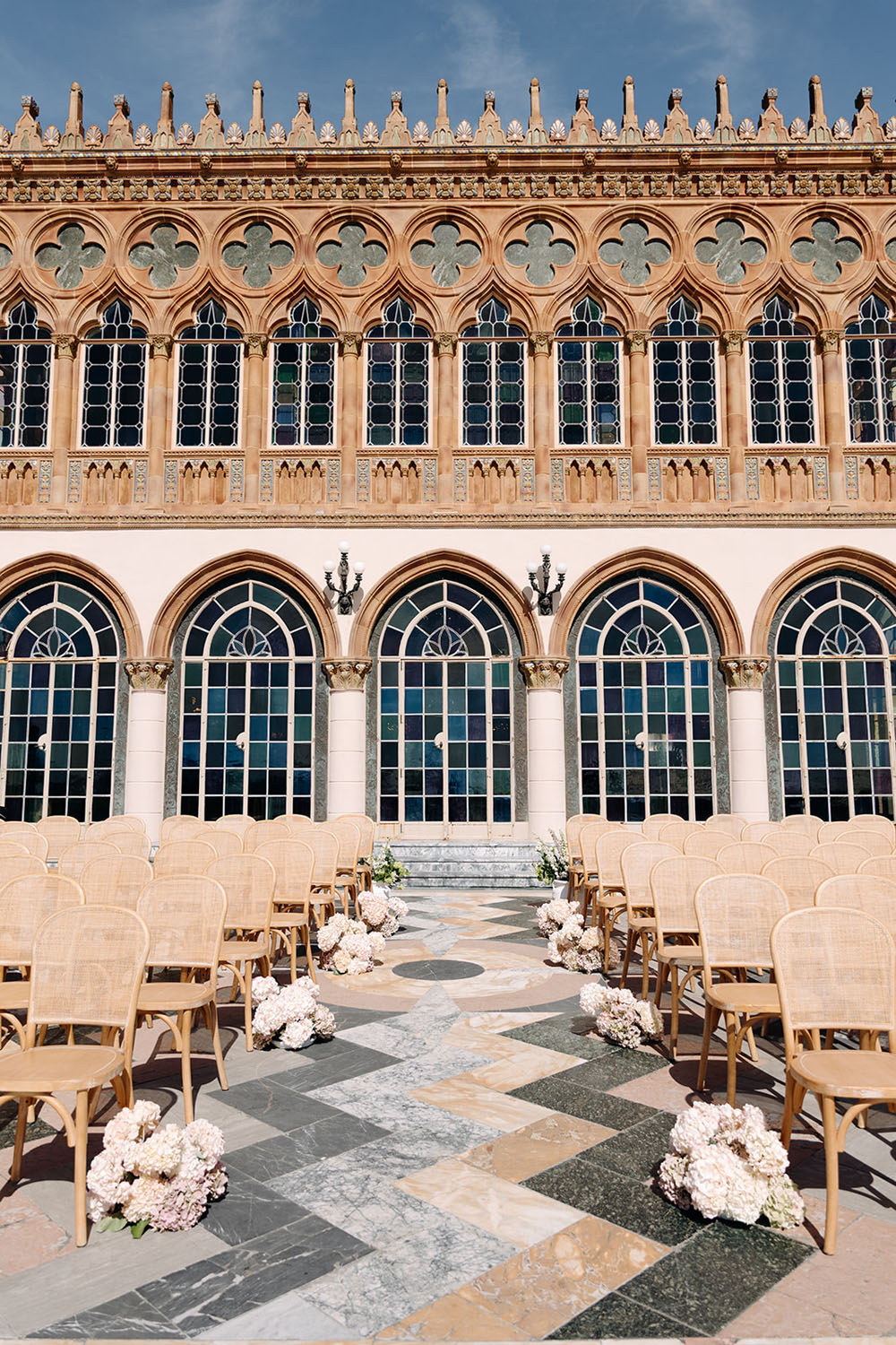 Alyssa tells us, “The John and Mable Ringling Museum of Art was right under our noses in Sarasota. Its European architecture felt just as special on our wedding day as it did the first time we saw it—there are “wow” factors everywhere you turn. We didn’t want our decor to detract from (or compete with) the museum in any way, so we kept our decor complementary to each space. At our ceremony, for example, the chairs mimicked the rounded shapes and chestnut colors of the Ca’ d’Zan façade, and the florals emphasized light pink and cream tones in the terrace’s tiles. As a result, we did not have “wedding colors”. The “theme” we were always striving for was more of a feeling. Put as simply as I can, we wanted a refined and perfect balance of: simple yet memorable, European yet Florida, formal yet fun, traditional yet updated, summery yet spring!”
