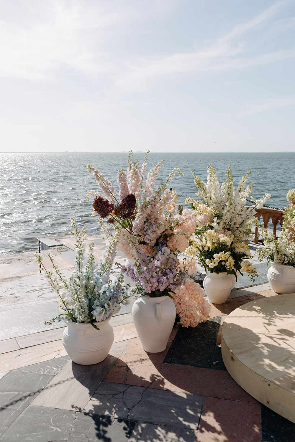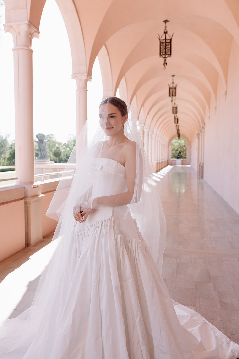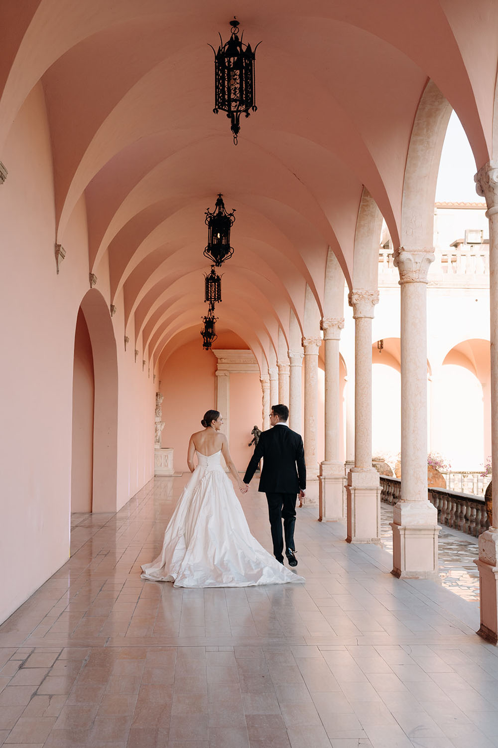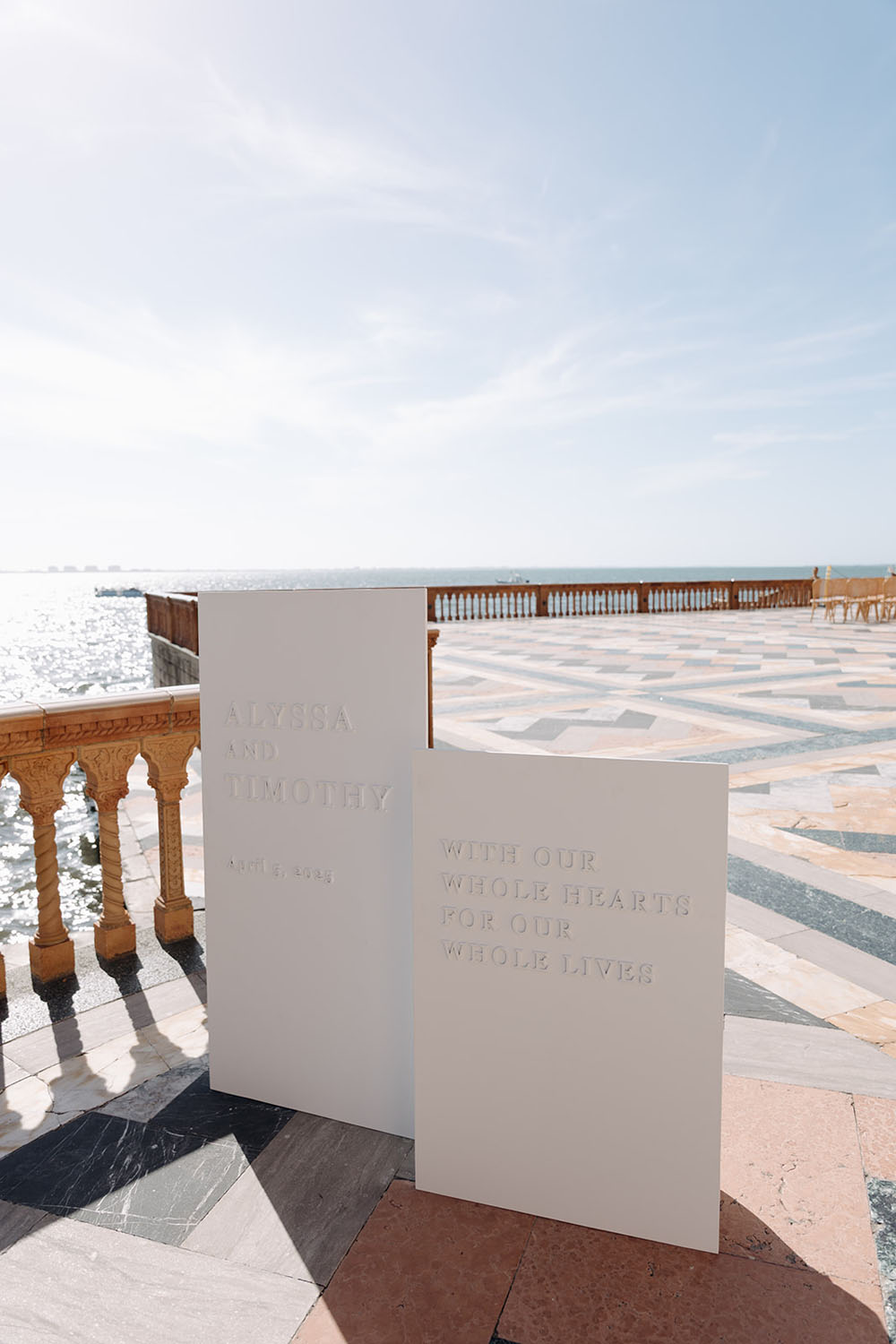 Alyssa tells us, “The John and Mable Ringling Museum of Art was right under our noses in Sarasota. Its European architecture felt just as special on our wedding day as it did the first time we saw it—there are “wow” factors everywhere you turn. We didn’t want our decor to detract from (or compete with) the museum in any way, so we kept our decor complementary to each space. At our ceremony, for example, the chairs mimicked the rounded shapes and chestnut colors of the Ca’ d’Zan façade, and the florals emphasized light pink and cream tones in the terrace’s tiles. As a result, we did not have “wedding colors”. The “theme” we were always striving for was more of a feeling. Put as simply as I can, we wanted a refined and perfect balance of: simple yet memorable, European yet Florida, formal yet fun, traditional yet updated, summery yet spring!”