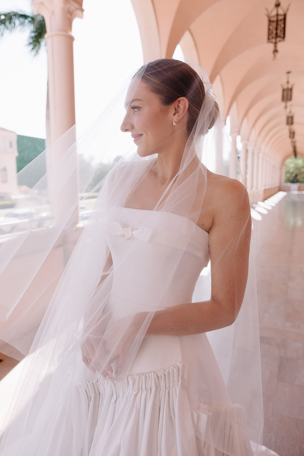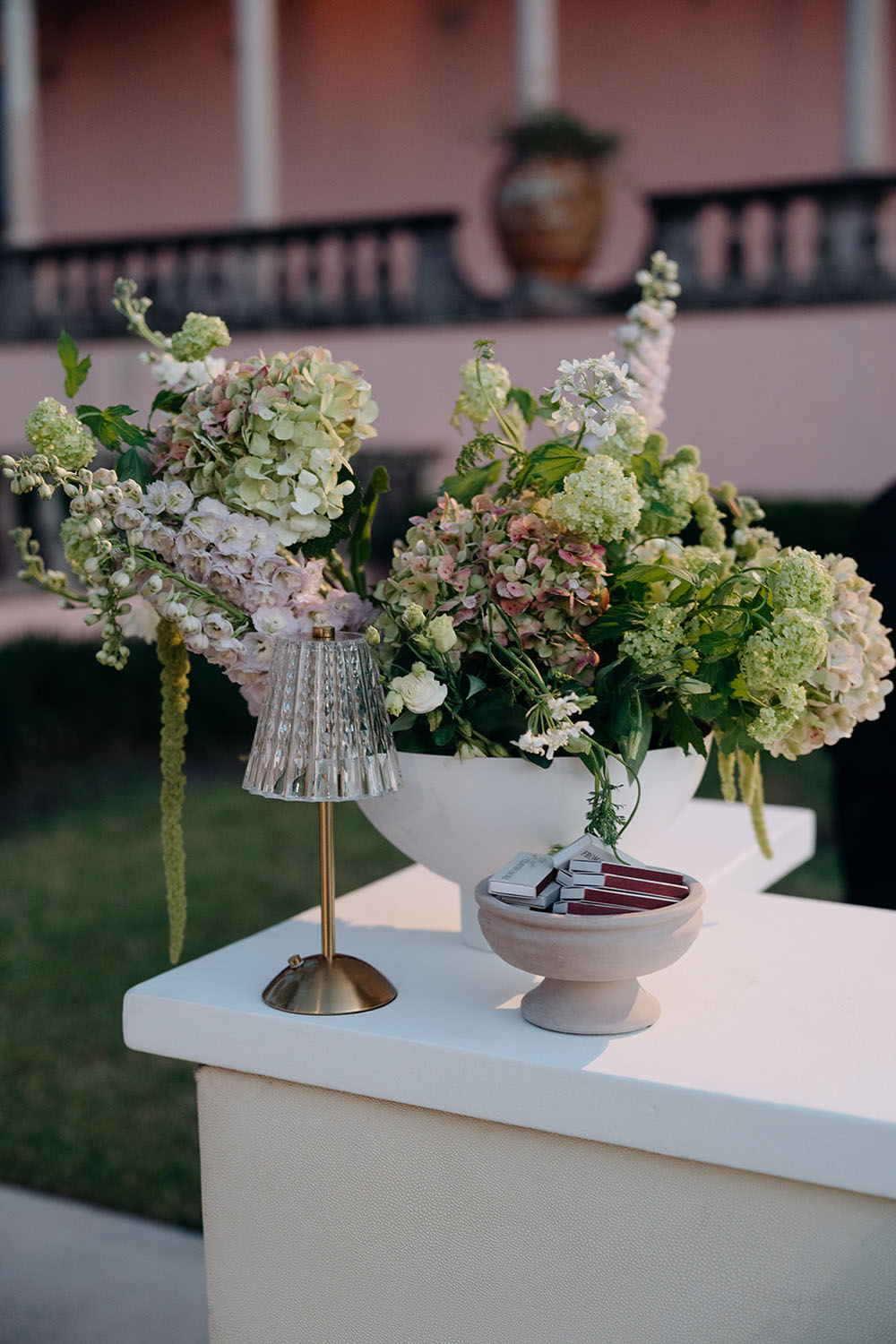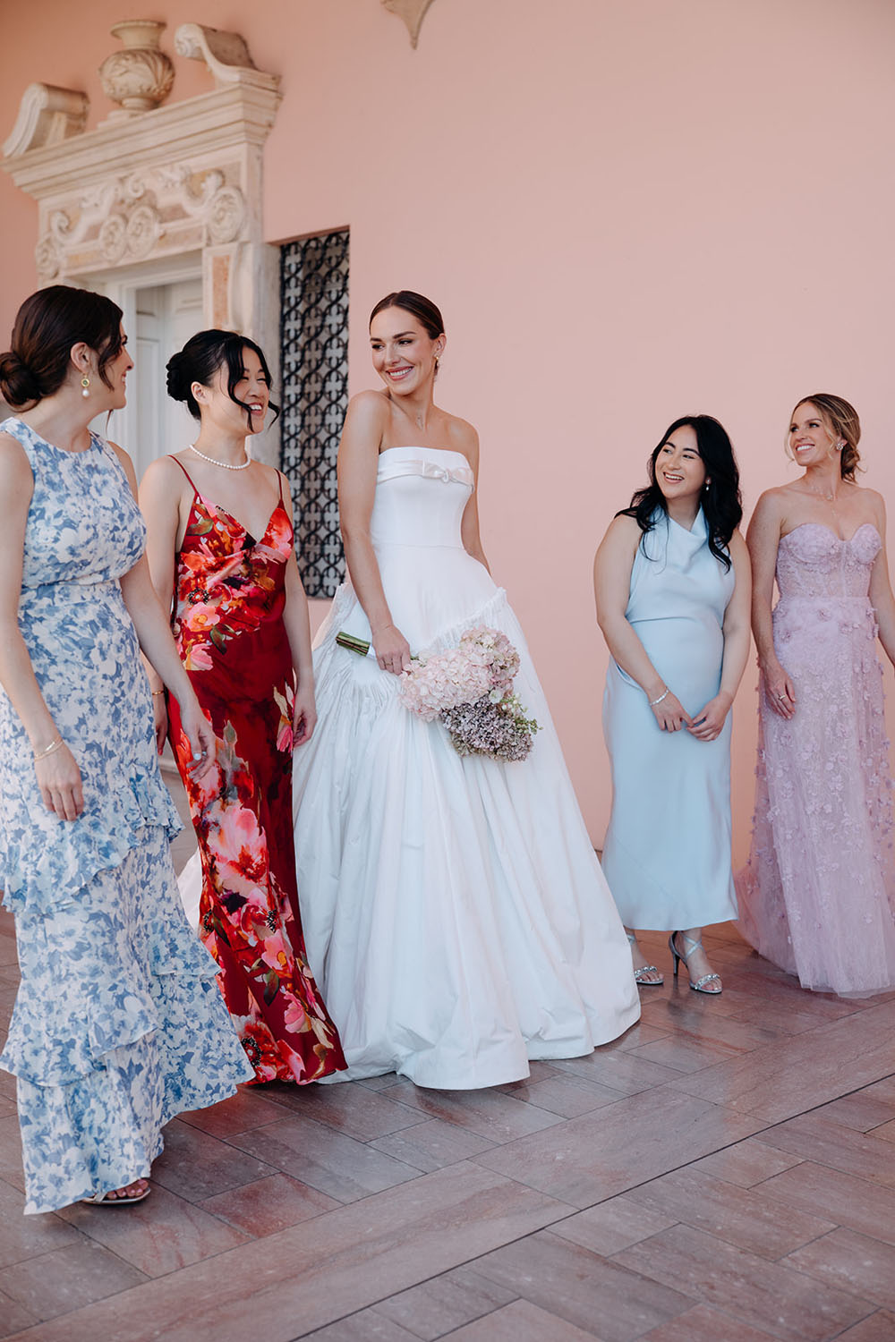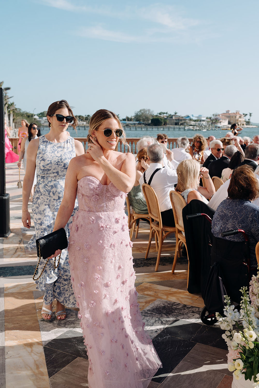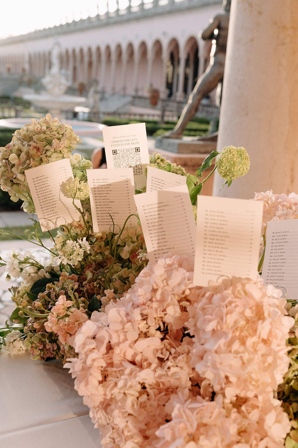 Alyssa tells us, “The John and Mable Ringling Museum of Art was right under our noses in Sarasota. Its European architecture felt just as special on our wedding day as it did the first time we saw it—there are “wow” factors everywhere you turn. We didn’t want our decor to detract from (or compete with) the museum in any way, so we kept our decor complementary to each space. At our ceremony, for example, the chairs mimicked the rounded shapes and chestnut colors of the Ca’ d’Zan façade, and the florals emphasized light pink and cream tones in the terrace’s tiles. As a result, we did not have “wedding colors”. The “theme” we were always striving for was more of a feeling. Put as simply as I can, we wanted a refined and perfect balance of: simple yet memorable, European yet Florida, formal yet fun, traditional yet updated, summery yet spring!”