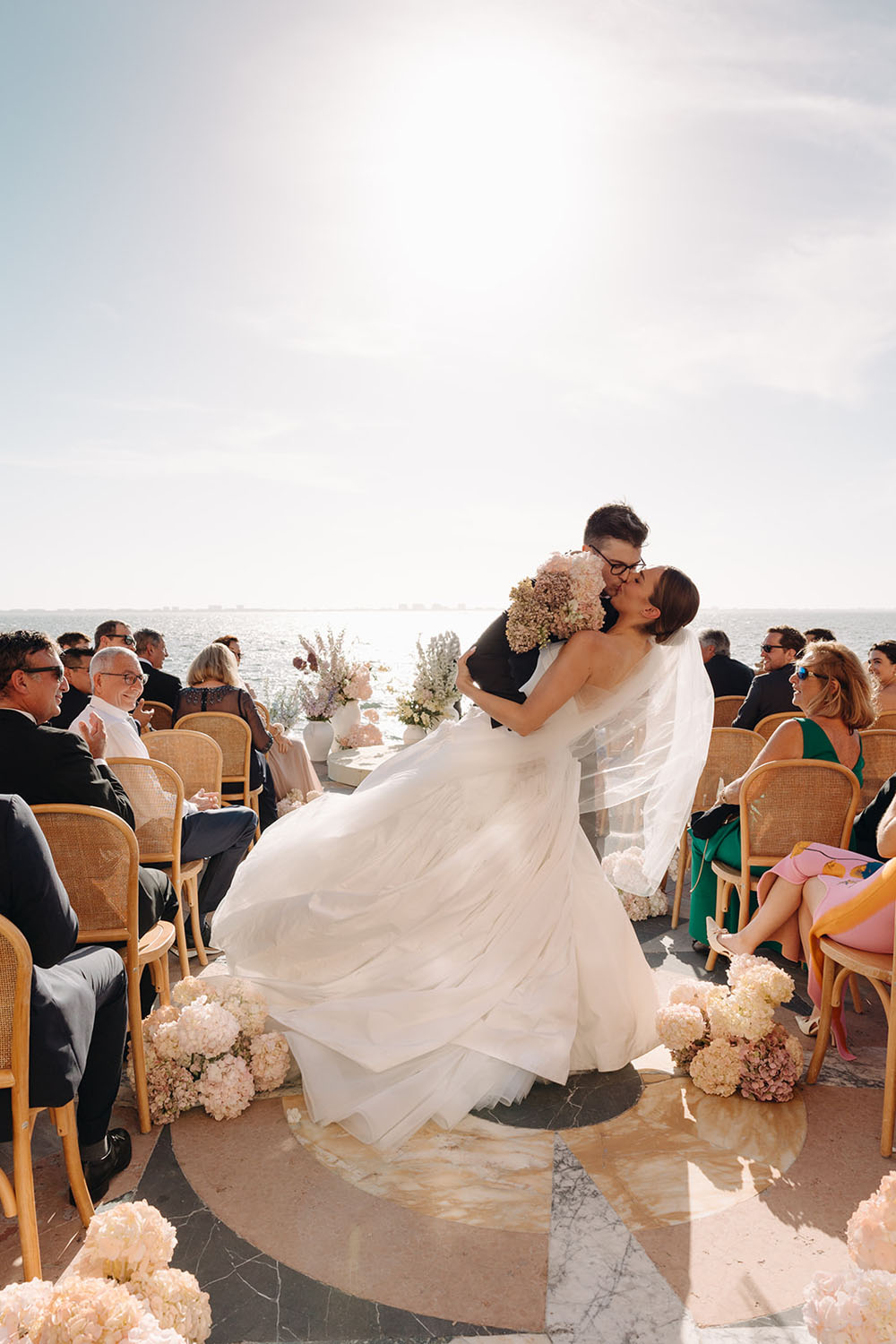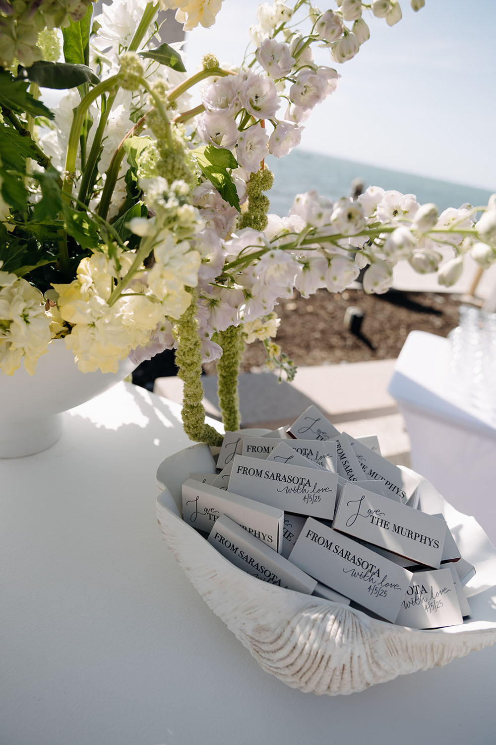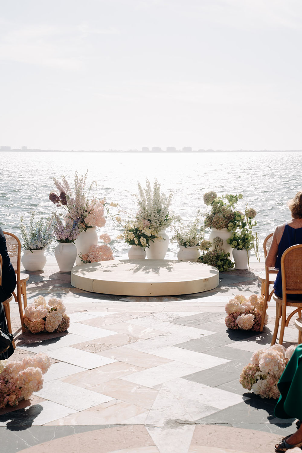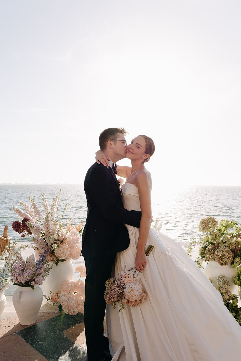 Alyssa tells us, “The John and Mable Ringling Museum of Art was right under our noses in Sarasota. Its European architecture felt just as special on our wedding day as it did the first time we saw it—there are “wow” factors everywhere you turn. We didn’t want our decor to detract from (or compete with) the museum in any way, so we kept our decor complementary to each space. At our ceremony, for example, the chairs mimicked the rounded shapes and chestnut colors of the Ca’ d’Zan façade, and the florals emphasized light pink and cream tones in the terrace’s tiles. As a result, we did not have “wedding colors”. The “theme” we were always striving for was more of a feeling. Put as simply as I can, we wanted a refined and perfect balance of: simple yet memorable, European yet Florida, formal yet fun, traditional yet updated, summery yet spring!”