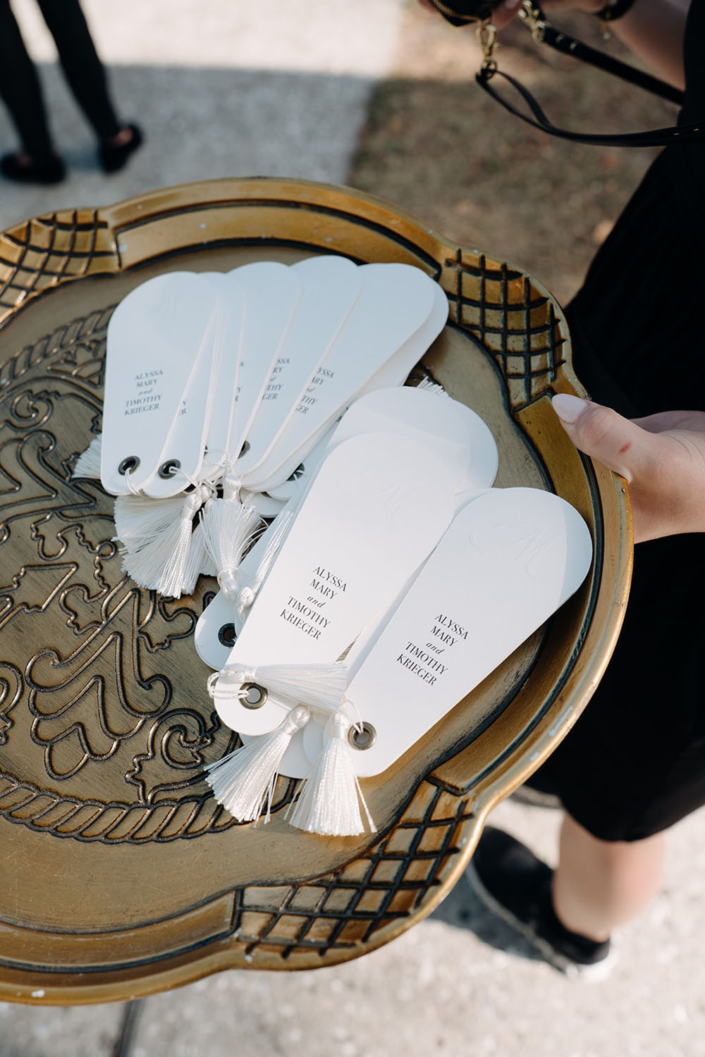 Alyssa made their petal fan programs and dinner menus using a printer, Cricut machine, cardstock, grommets, tassels from Amazon, and an embosser from Etsy. Such an impressive DIY!